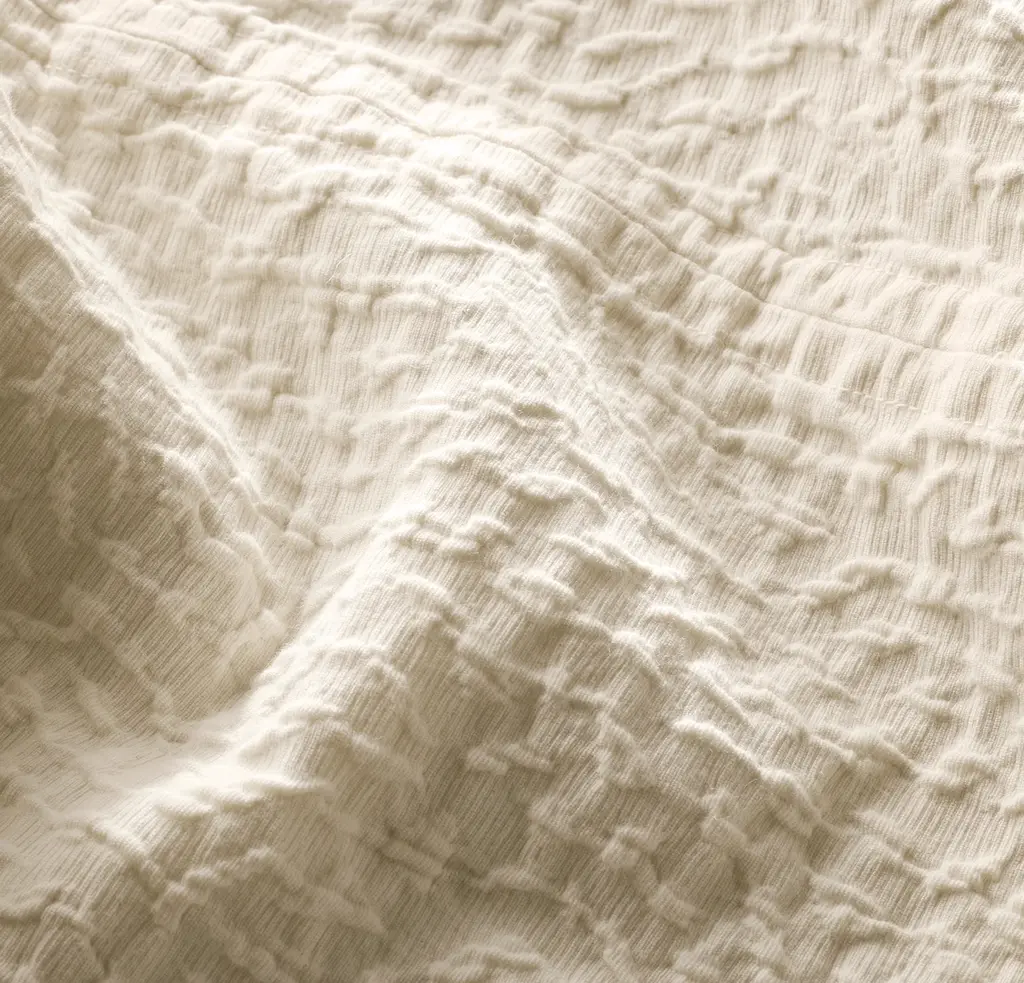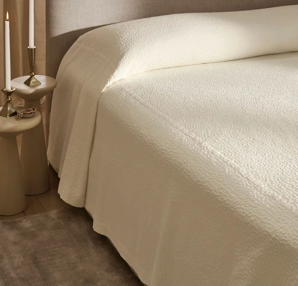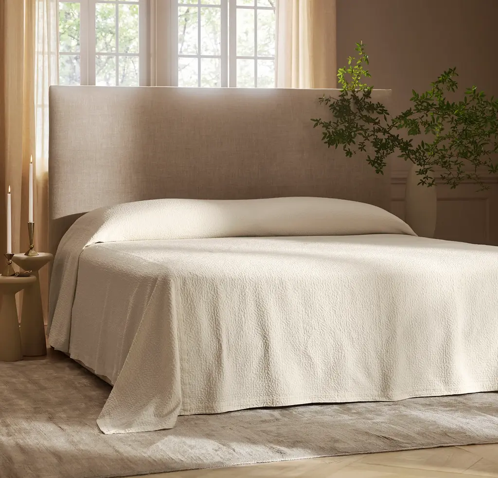 Drape your bed in extraordinary softness and sophistication with this refined statement piece. It's made with textured 100% organic cotton by artisans in Portugal, and the intricate matelassé weave emulates the beauty of dappled light that shines through your bedroom. Inspired by European minimalism, this abstract coverlet is crafted to surround your pillows in designs tailored for two distinct aesthetics—the Classic length, made to tuck elegantly into your bed, and a new Grand length, which grazes the floor in a luxurious sweep of texture. The Feel Subtly textured with a fluid, lived-in softness The Look Effortlessly sophisticated