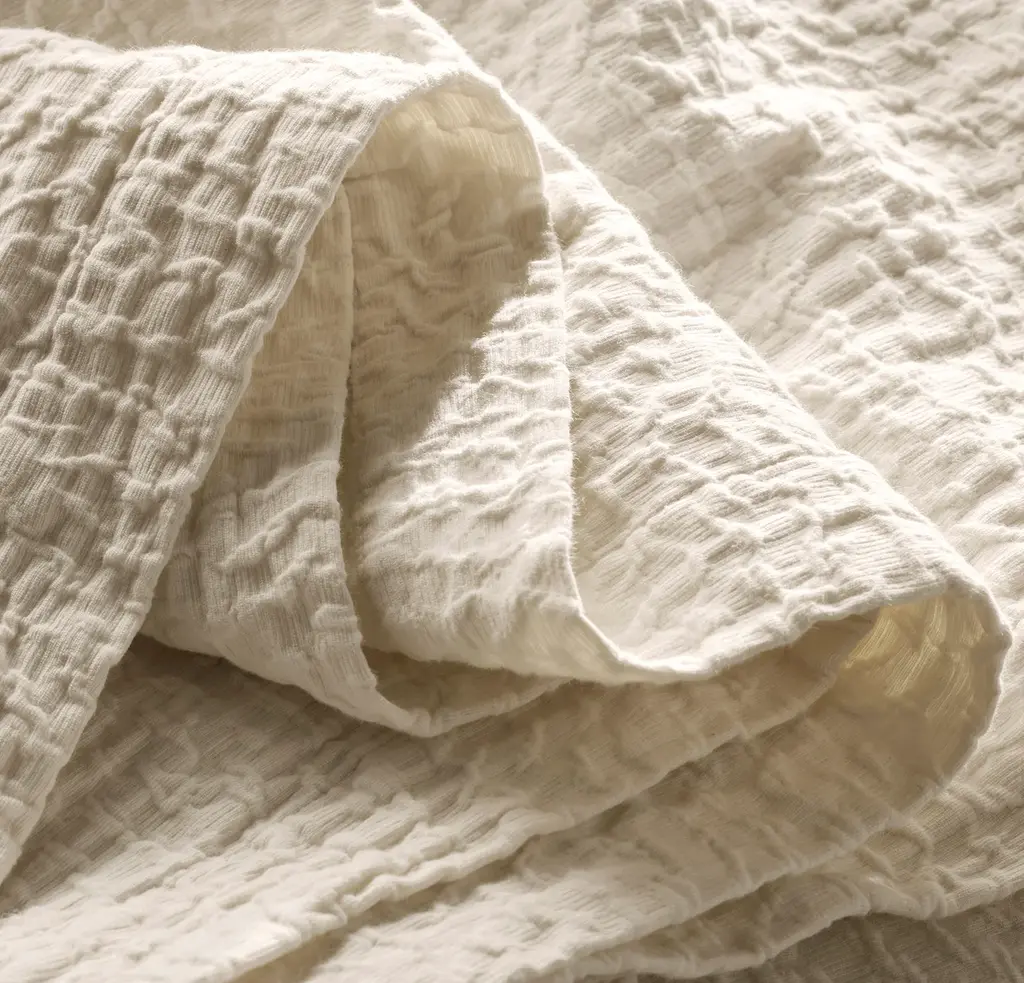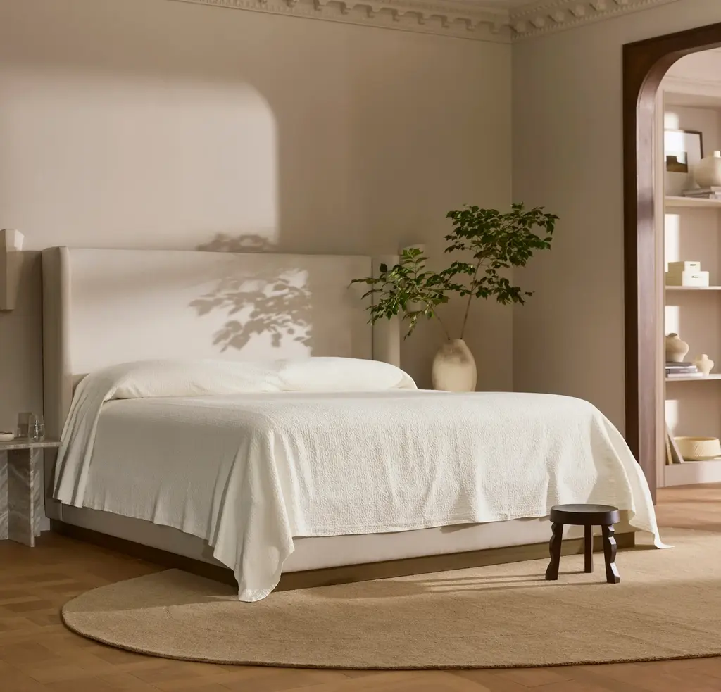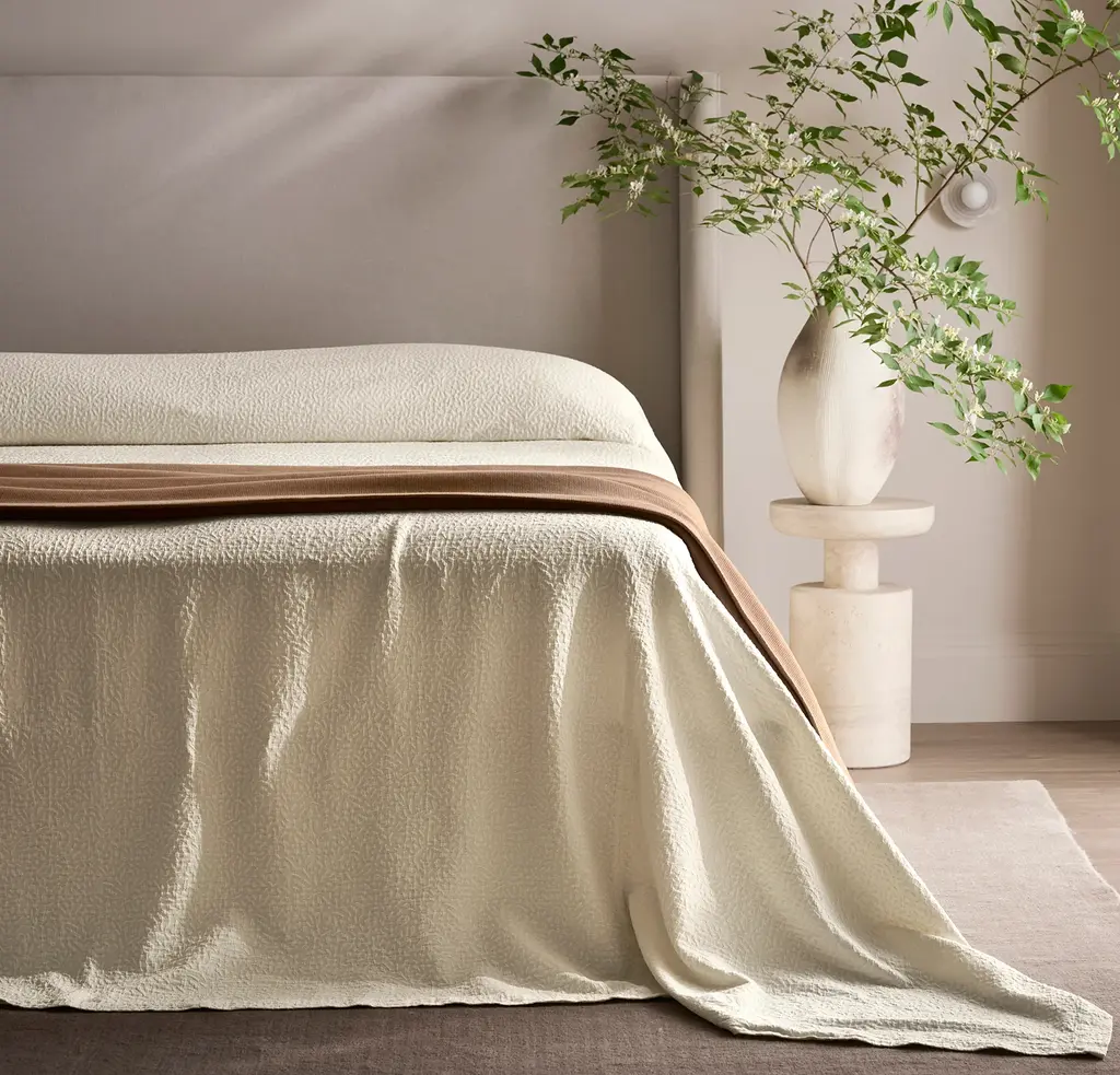 Drape your bed in extraordinary softness and sophistication with this refined statement piece. It's made with textured 100% organic cotton by artisans in Portugal, and the intricate matelassé weave emulates the beauty of dappled light that shines through your bedroom. Inspired by European minimalism, this abstract coverlet is crafted to surround your pillows in designs tailored for two distinct aesthetics—the Classic length, made to tuck elegantly into your bed, and a new Grand length, which grazes the floor in a luxurious sweep of texture. The Feel Subtly textured with a fluid, lived-in softness The Look Effortlessly sophisticated