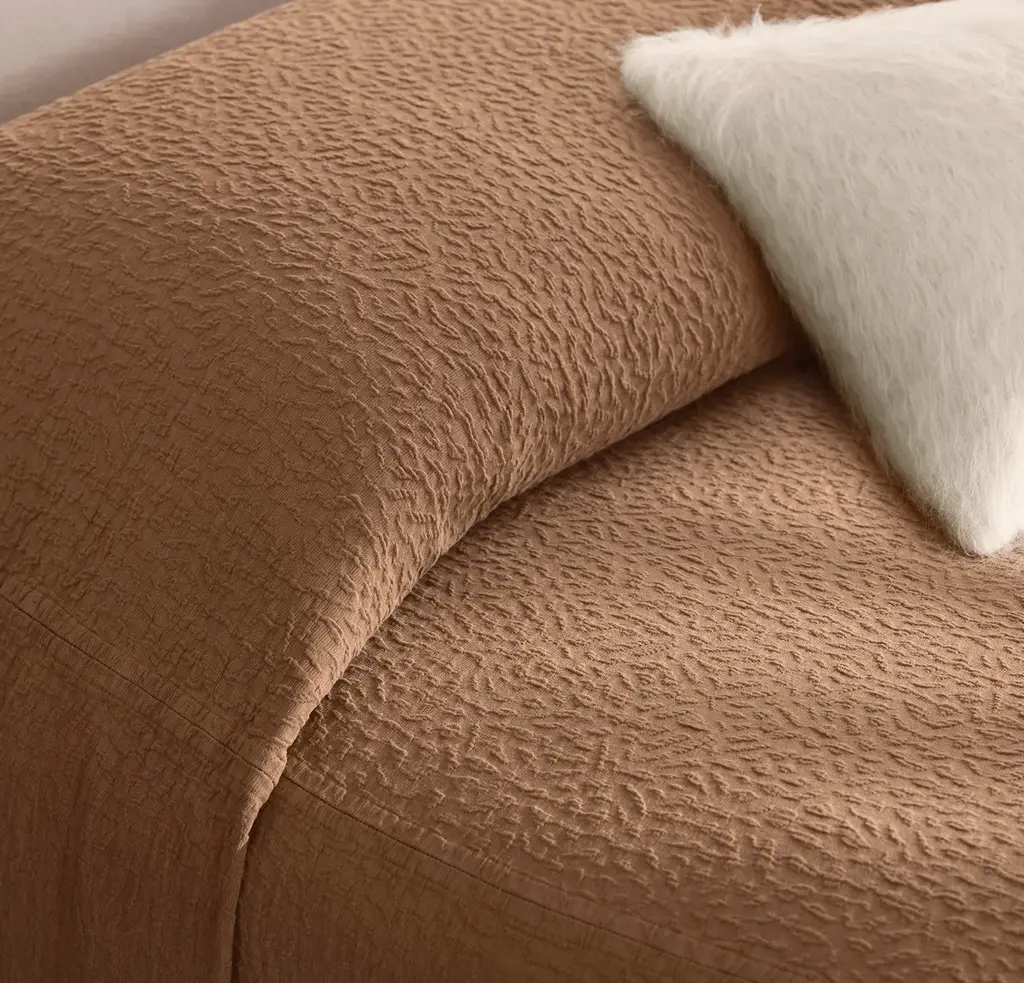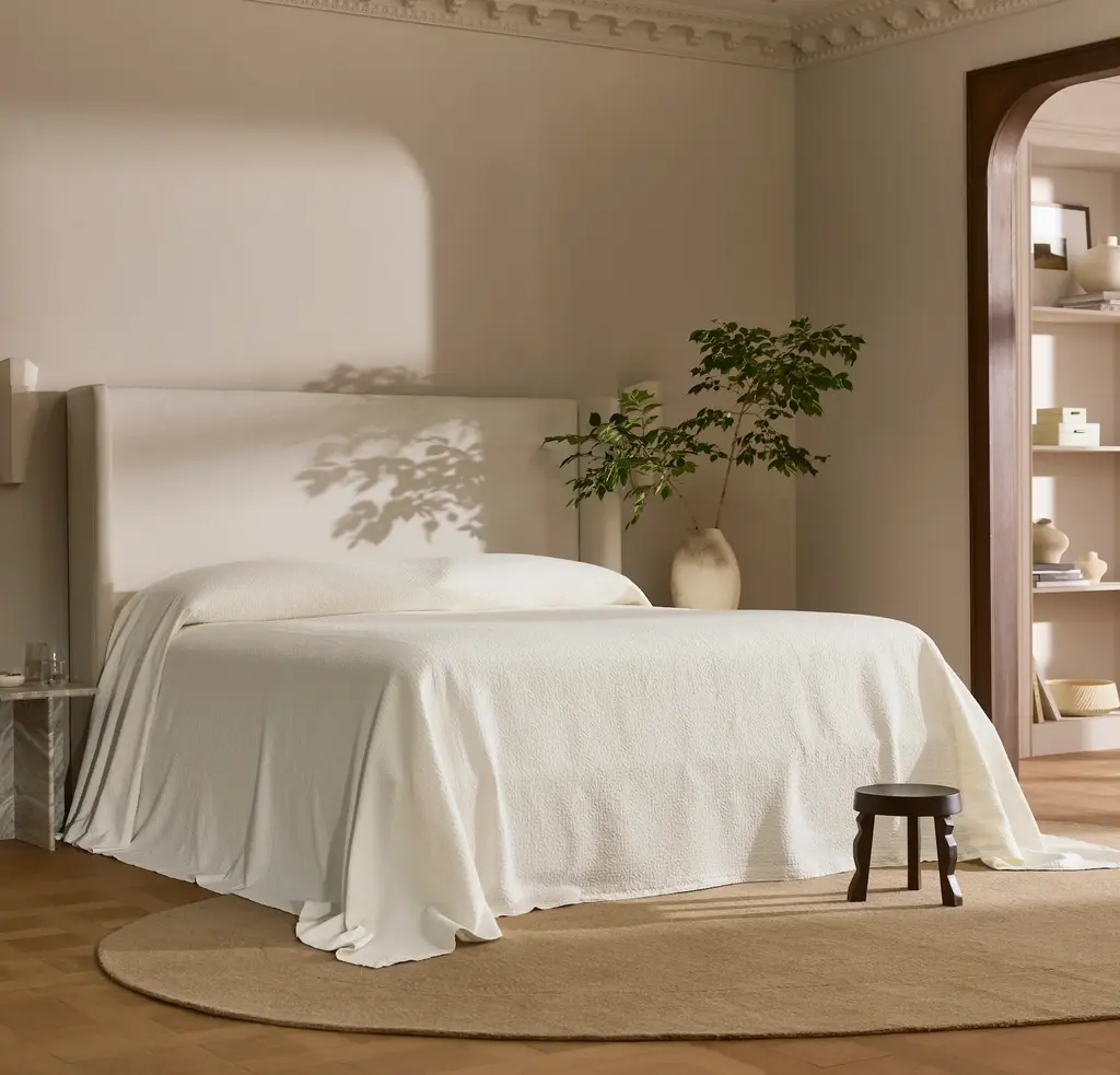 Drape your bed in extraordinary softness and sophistication with this refined statement piece. It's made with textured 100% organic cotton by artisans in Portugal, and the intricate matelassé weave emulates the beauty of dappled light that shines through your bedroom. Inspired by European minimalism, this abstract coverlet is crafted to surround your pillows in designs tailored for two distinct aesthetics—the Classic length, made to tuck elegantly into your bed, and a new Grand length, which grazes the floor in a luxurious sweep of texture. The Feel Subtly textured with a fluid, lived-in softness The Look Effortlessly sophisticated