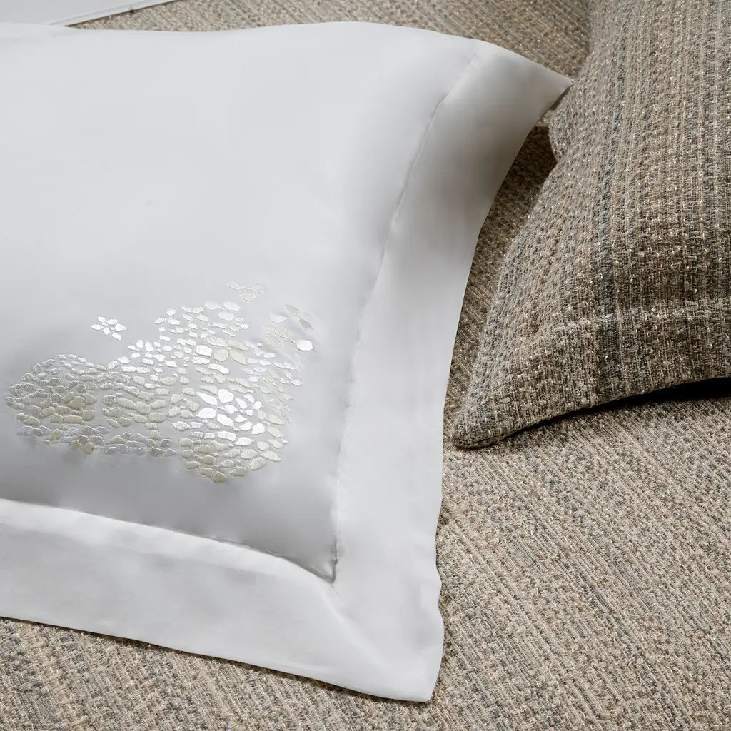 Bring depth and texture to your bedroom with the Boucle Collection from DEA Luxury Linens. The pieces are made with an artfully knitted fabric and sateen in multiple shades of neutral colors.