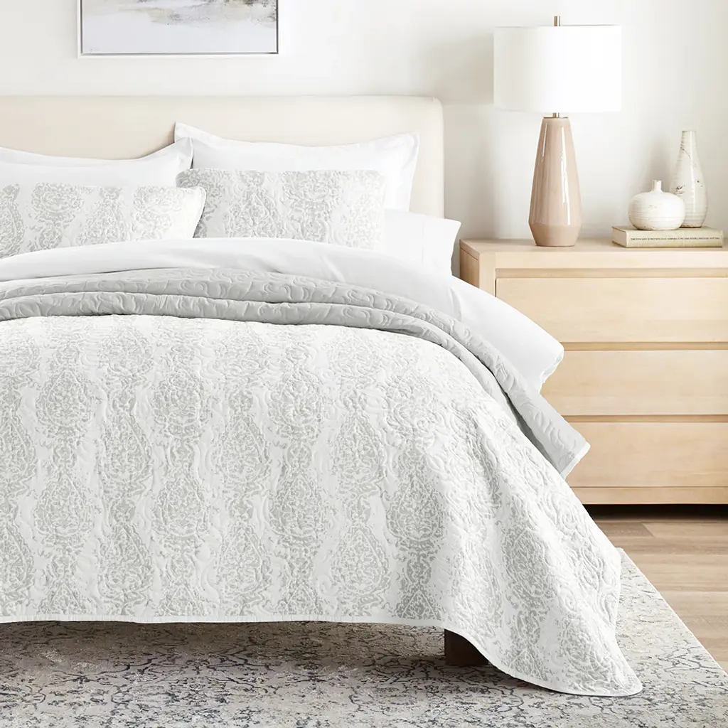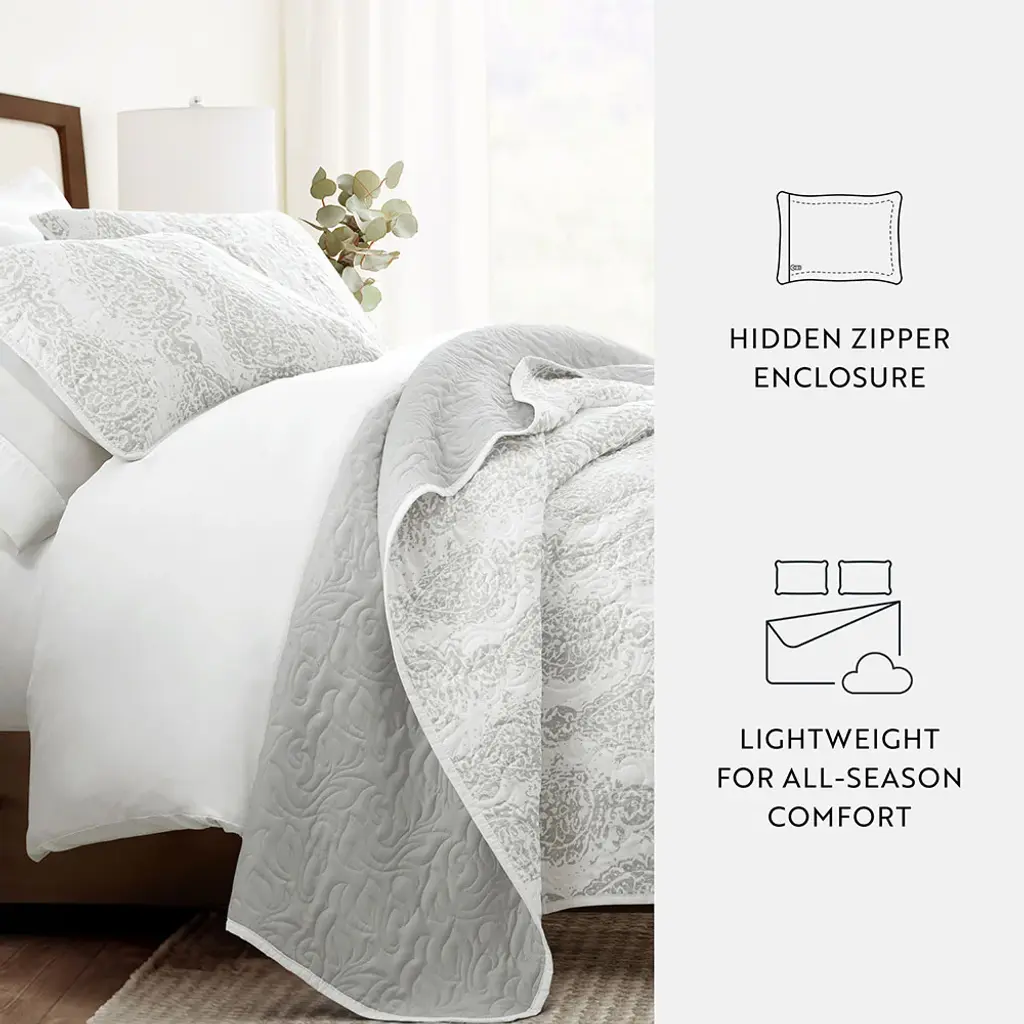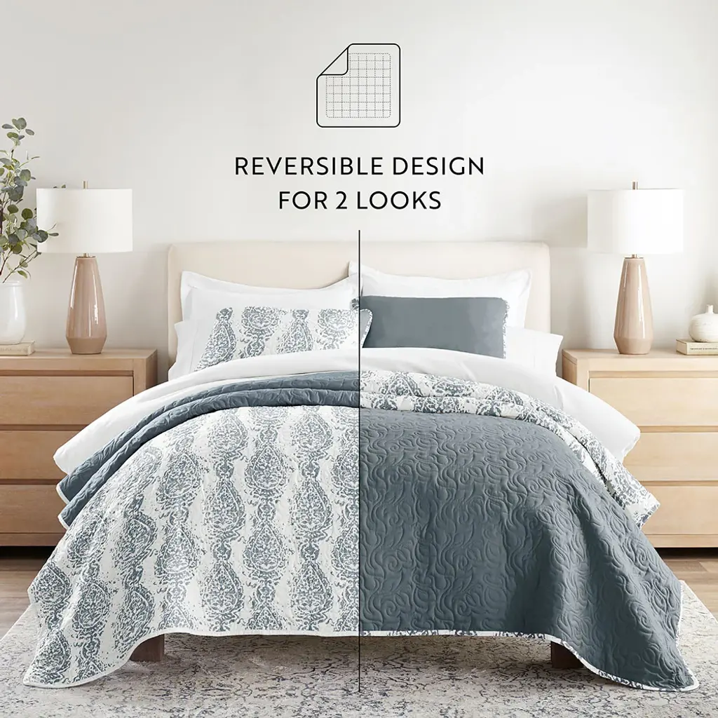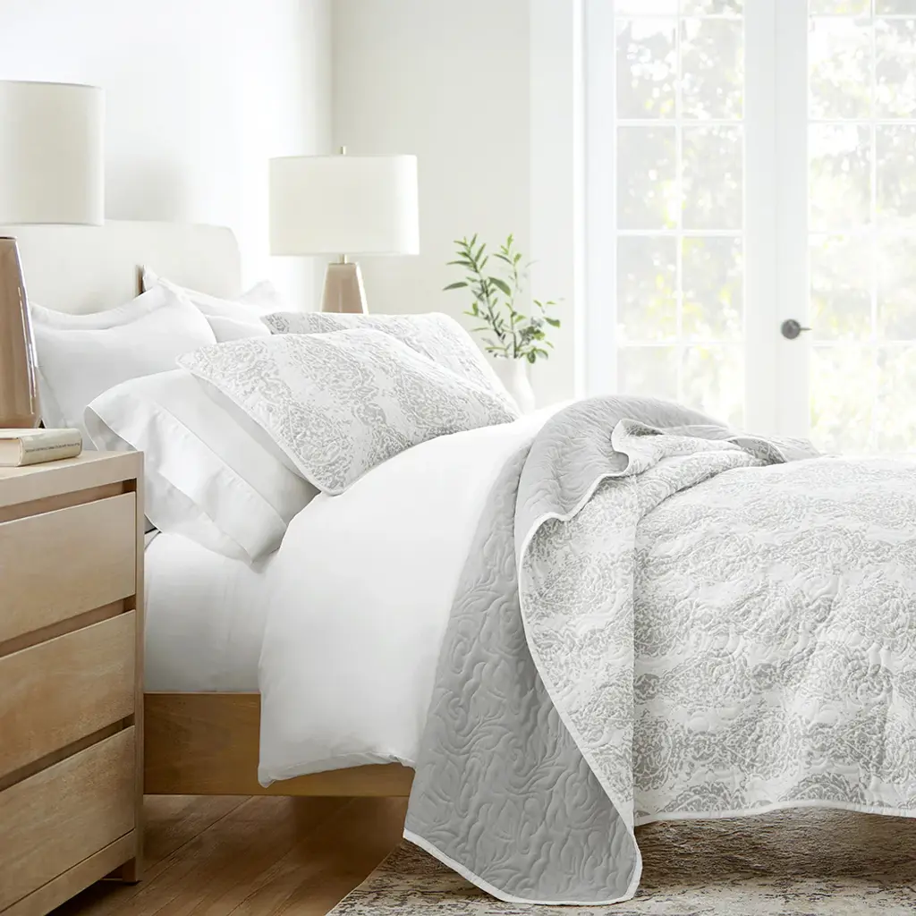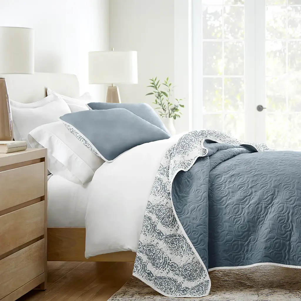 Give your room a comfy new addition with this super soft reversible microfiber quilt and sham set. We've generously filled it with artificial down, and each piece is double brushed to give it that super soft, cozy feel. The beautiful, subtle quilted stitchings add dimension and a gorgeous touch to any bedroom. Spun from our premium yarns, this set is twice as strong as cotton, wrinkle resistant and a perfect option for those with allergies or sensitive skin. The reversibility gives each side its own unique look. Available in a variety of beautiful designer patterns, making it easy to refresh any bedroom.
