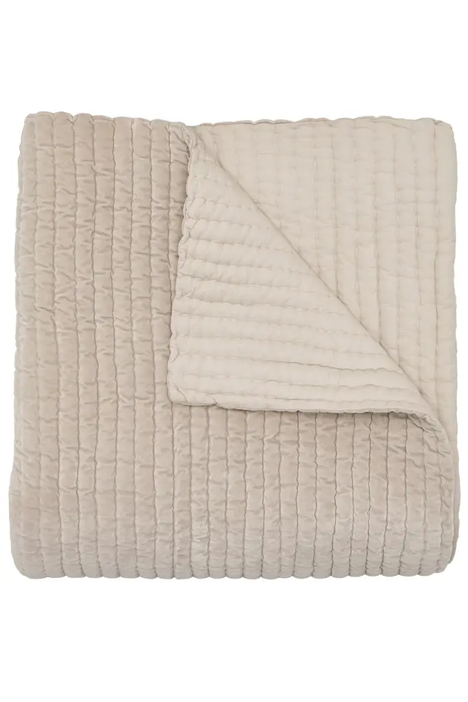 Soft and luxurious velvet, hand quilted by Indian artisans in a style known as 'channel quilting' where the quilting runs in parallel lines in one direction. Solid dyed cotton velvet front with cotton sheeting on the back.* Hand quilted* Cotton velvet front* Cotton sheeting back* Also available in Berry, Indigo, and Sand* Machine wash cold in a large capacity machine, gentle cycle, wash with similar colors, do not bleach, tumble dry low in a large capacity machine, remove promptly. Warm iron as needed.* Imported#### *Dimensions** Twin Size: 72" x 92"* Queen Size: 92" x 92"* King Size: 110" x 92"
