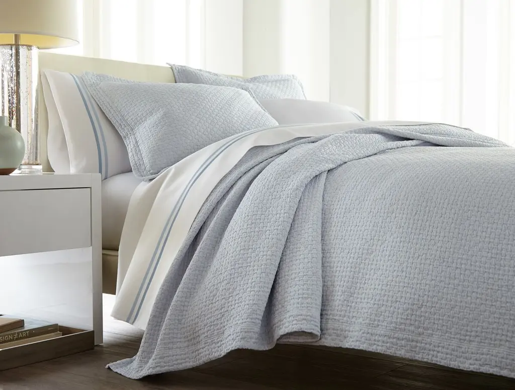 The basket-weave matelassé stitching adds to the luxuriousness of this cotton coverlet, while the two-inch flange on three sides adds to the elegance. The top has a one-inch hem.