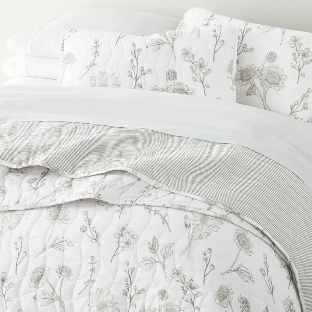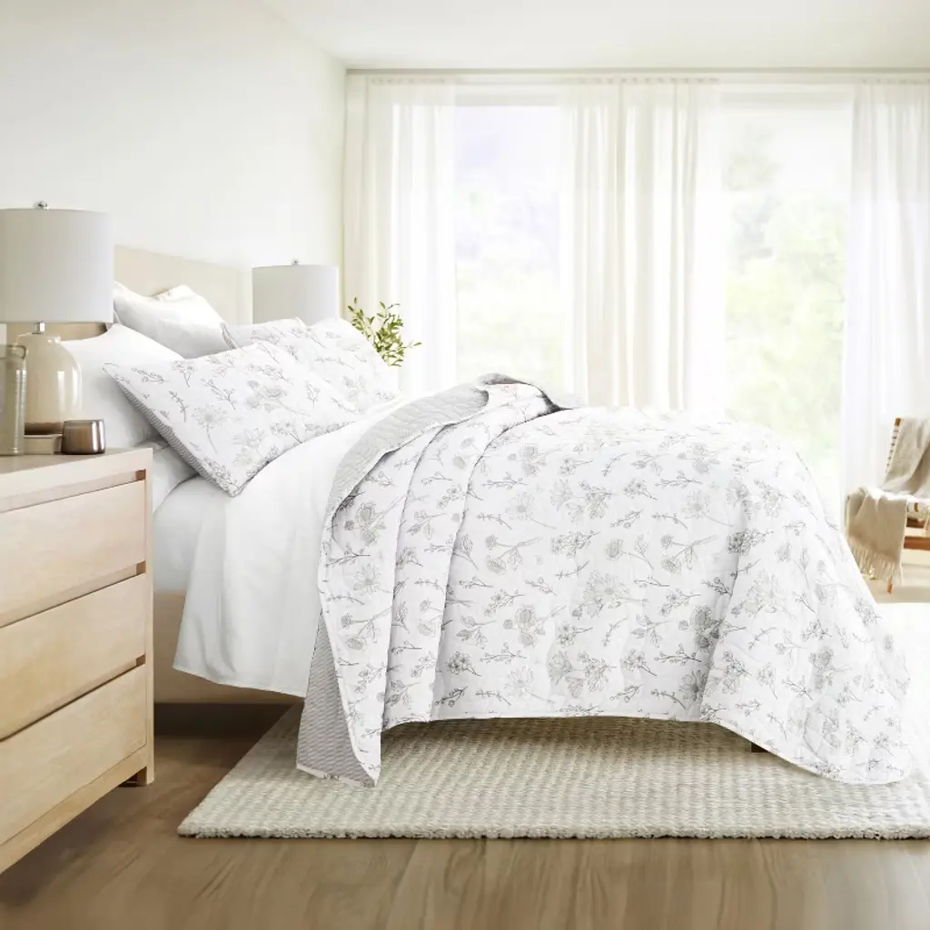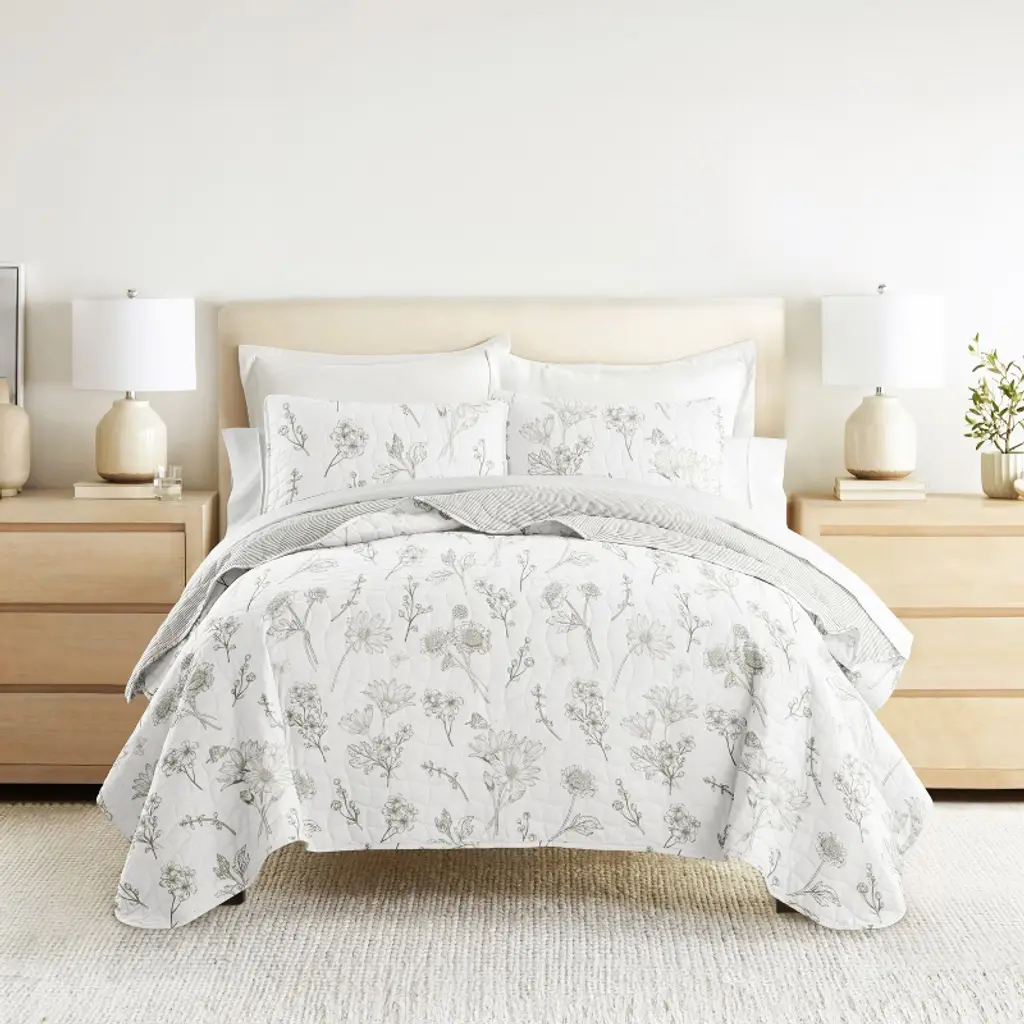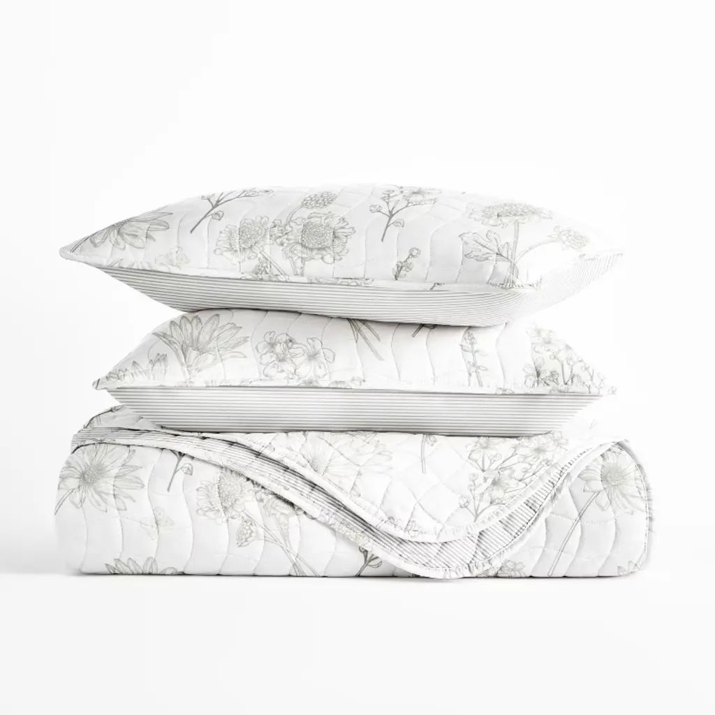 Lightweight All Season Quilt Set – Soft Microfiber Coverlet In Blooming Daisy Print By Becky Cameron, Blooming Daisy Light Gray, Full/queen