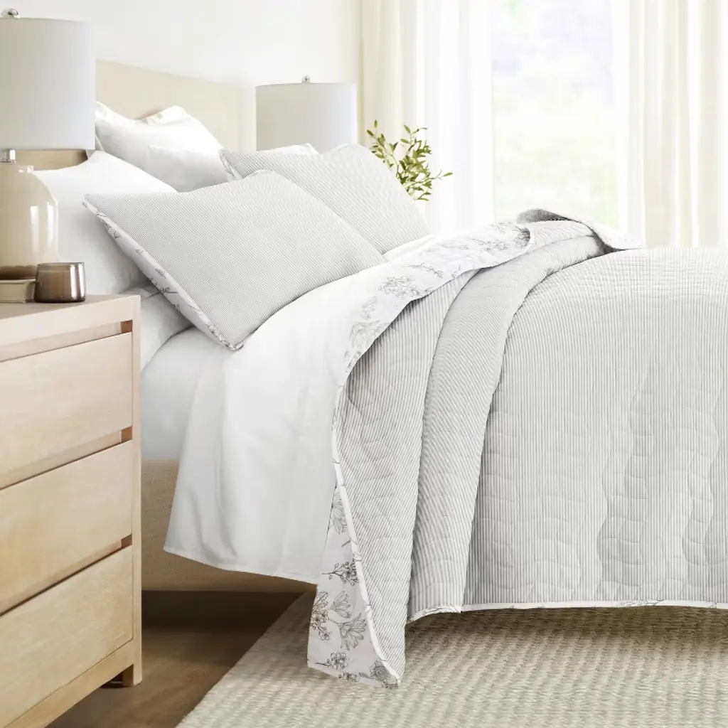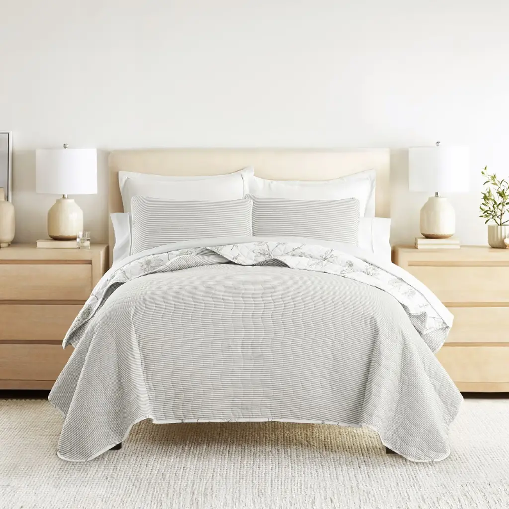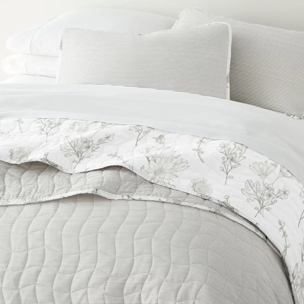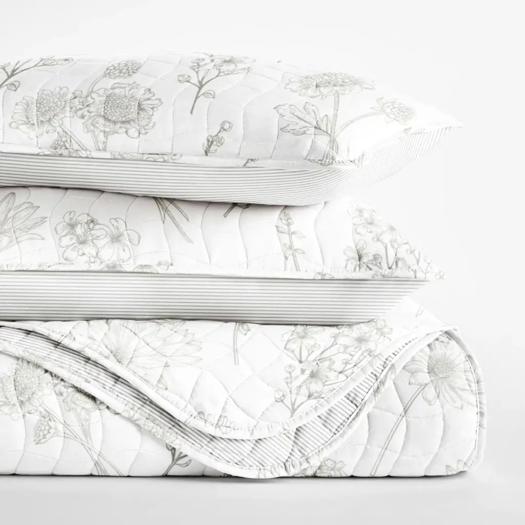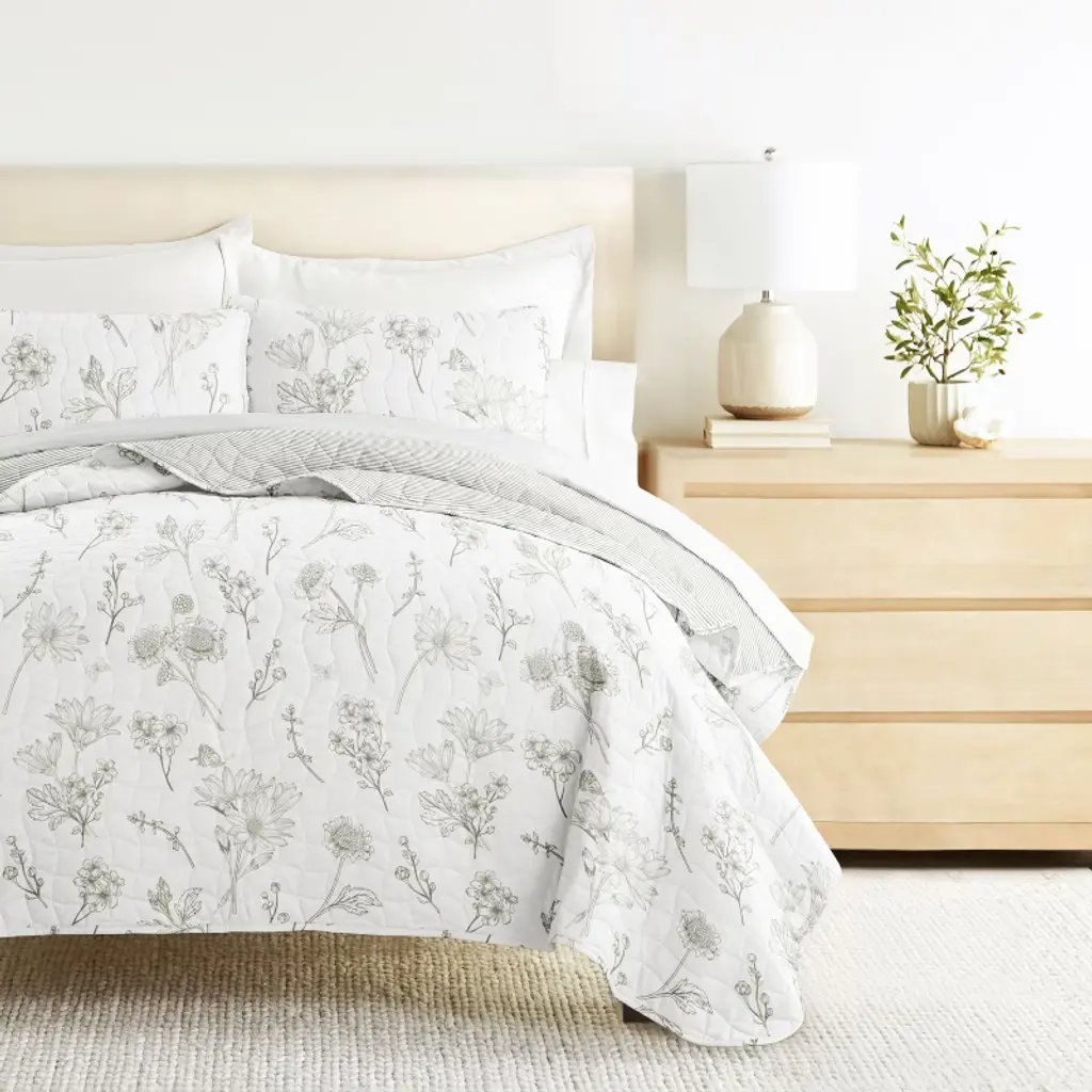 Lightweight All Season Quilt Set – Soft Microfiber Coverlet In Blooming Daisy Print By Becky Cameron, Blooming Daisy Light Gray, Full/queen