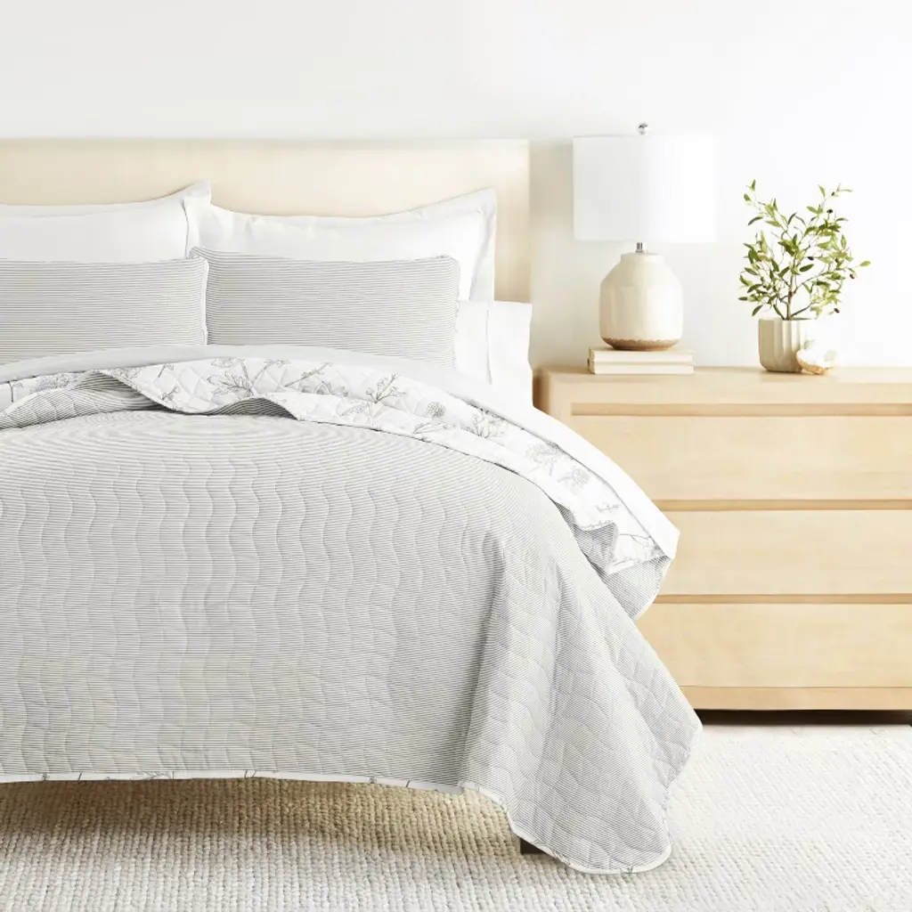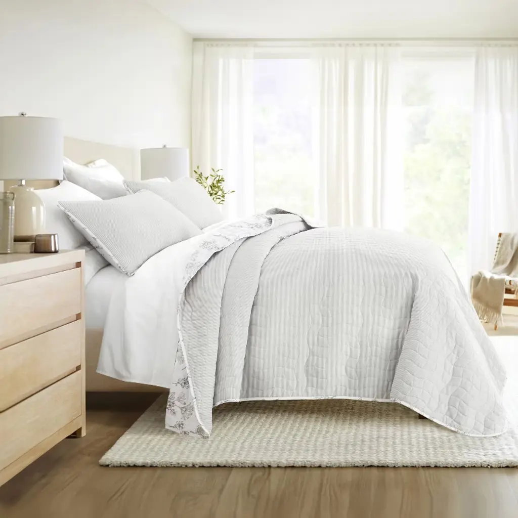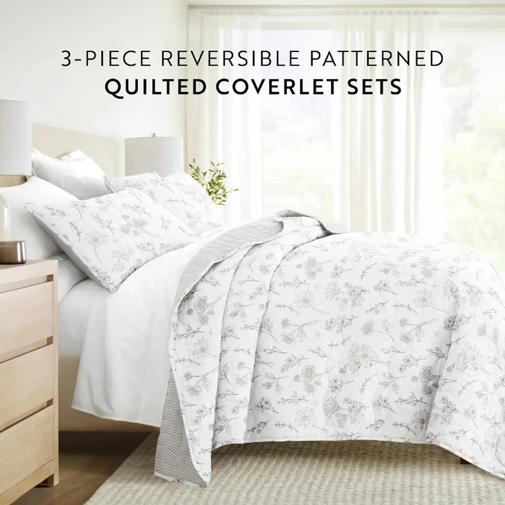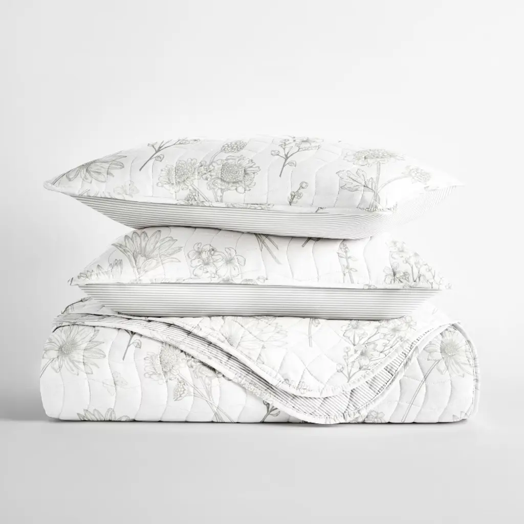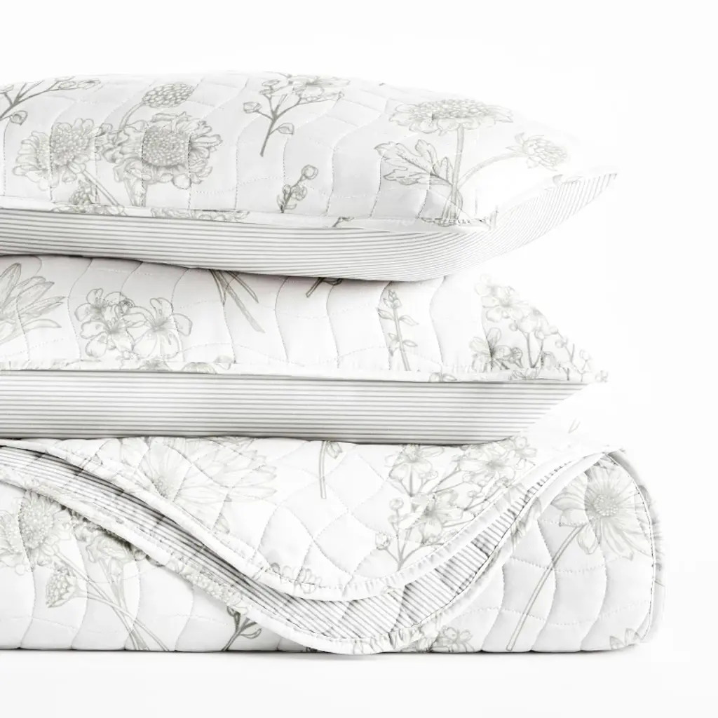 Lightweight All Season Quilt Set – Soft Microfiber Coverlet In Blooming Daisy Print By Becky Cameron, Blooming Daisy Light Gray, Twin/twin Extra Long