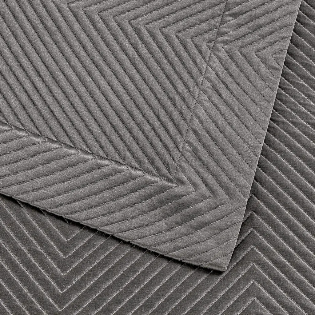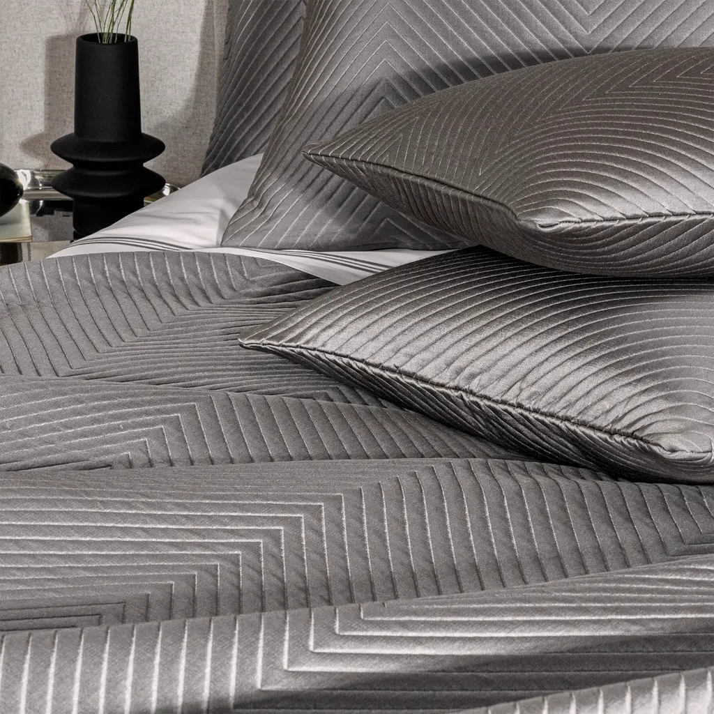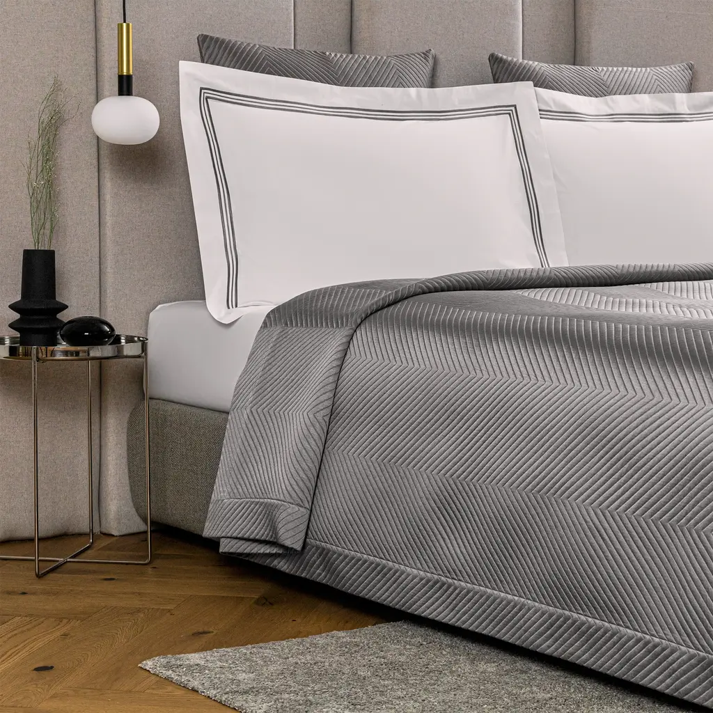 Yarn-dyed jacquard fabric woven on a silk organdy warp is defined by a subtle yet graphic chevron motif that highlights the glossy look of Frette's Herringbone Lux bedding collection.