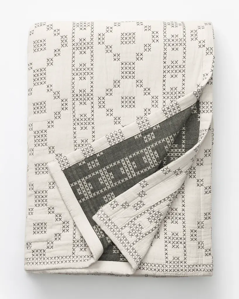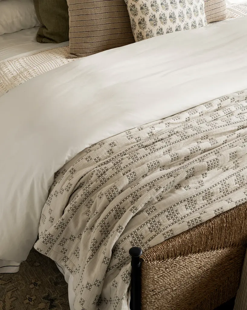 Heritage-inspired and beautifully crafted, our Prescott Coverlet adds a layer of character to your bedding textiles. Woven on a jacquard loom, the lightweight coverlet features deep forest green cross-stitching detailing on a soft white ground. Made with a gauzy and cotton material, it brings both style and comfort.