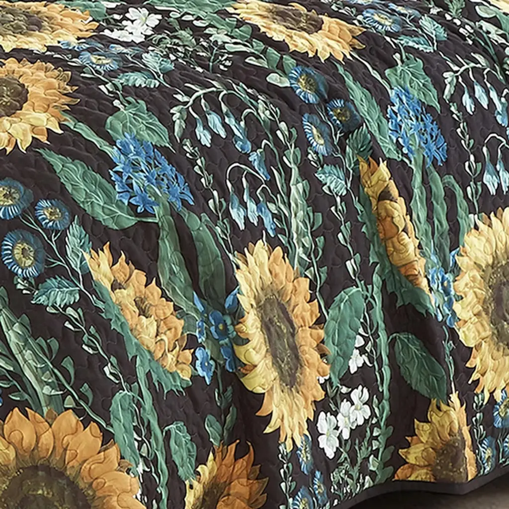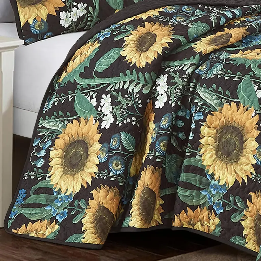 Queen 3 Piece Sunflower Floral Yellow Reversible Quilt Coverlet Bedspread Bedding Set