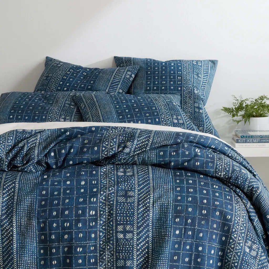 Inspired by traditional Indian kantha quilts, this cotton coverlet features a block-style print on an ink-colored background.