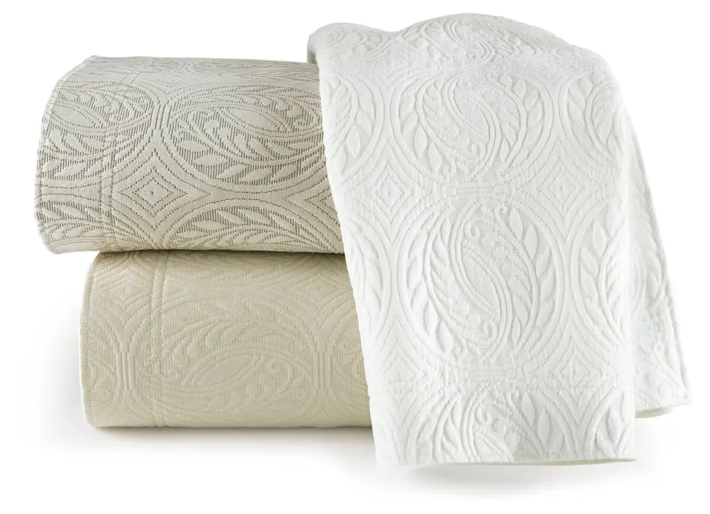 Woven with a medallion design inspired by a 18th-century French button, this cotton matelassé coverlet adds classic elegance to the bed.