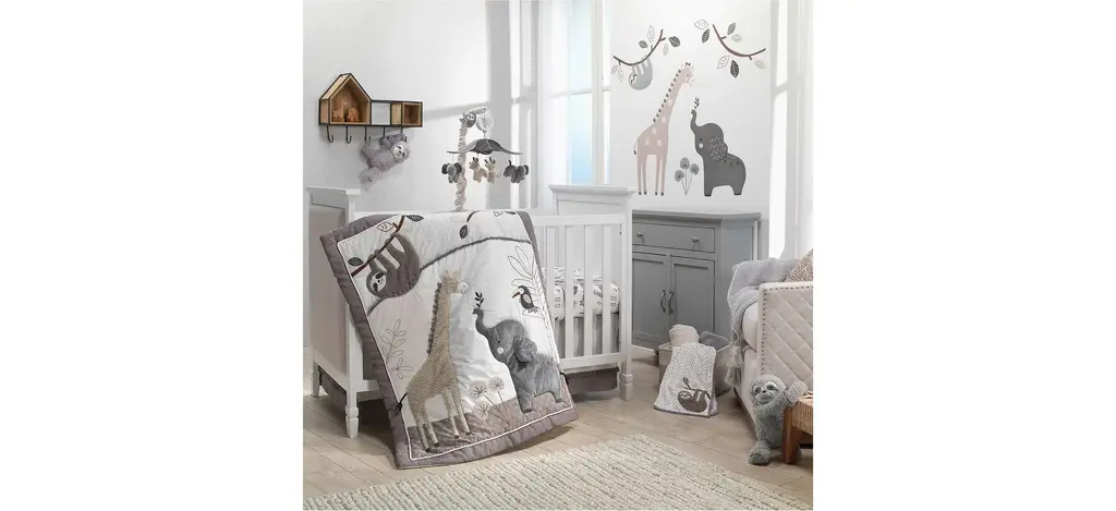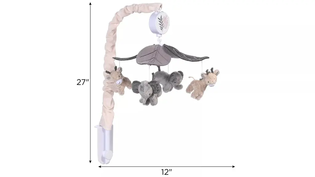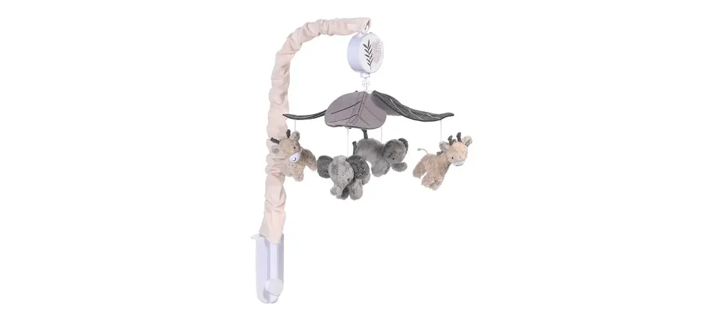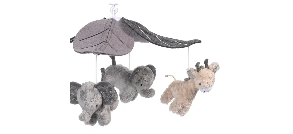 Two taupe minky giraffes with an eyelash trim and two gray elephants with embroidered ears rotate under a canopy of embroidered leaves. Add to that a friendly furry sloth with hook and loop material that attaches to the cream colored scrunchie which covers the mobile arm. The musical mobile rotates to nursery songs for 20 minutes, has an on/off switch and volume control. It plays Brahms Lullaby, Twinkle Twinkle Little Star and Rock-A-Bye-Baby. Requires 3 AAA batteries not included.