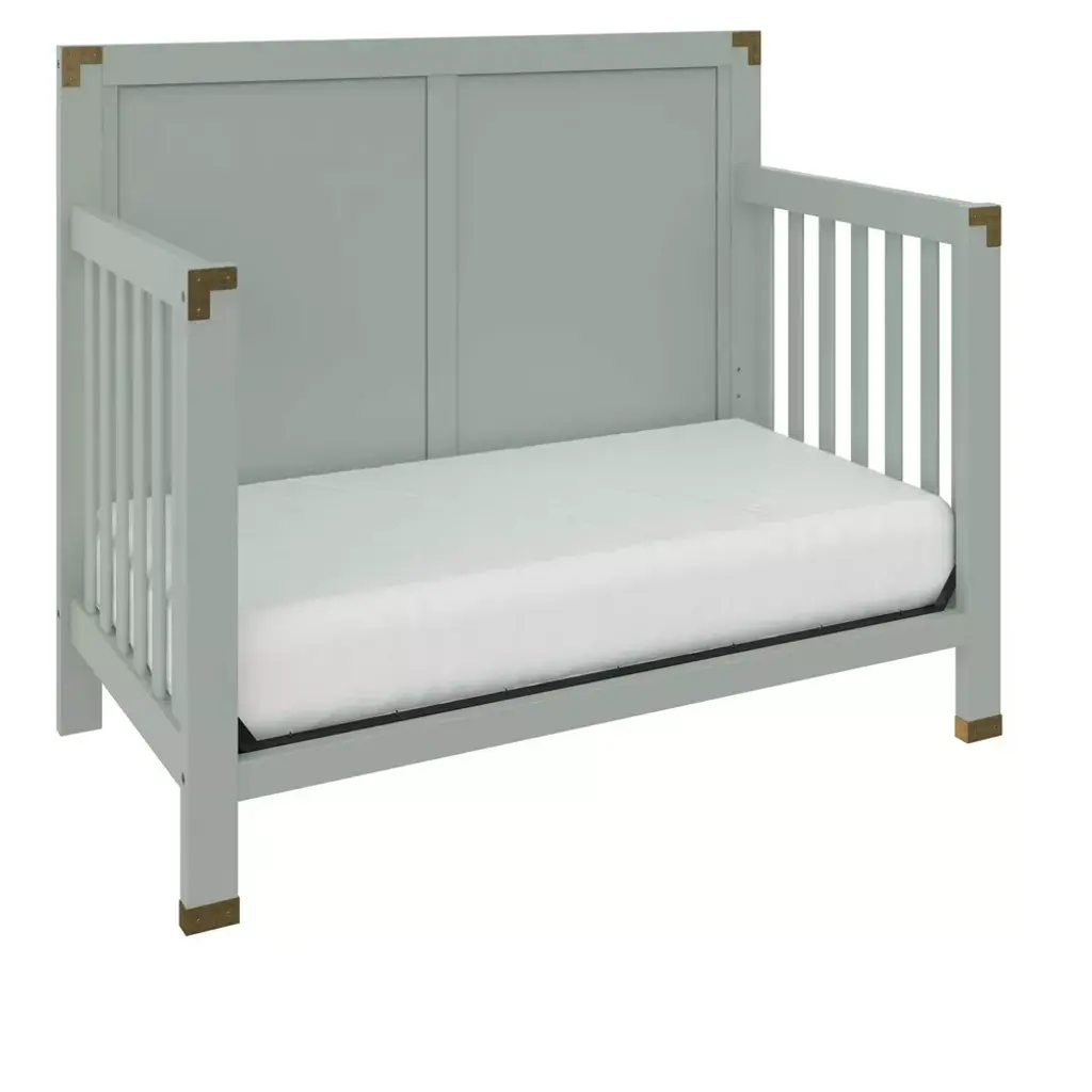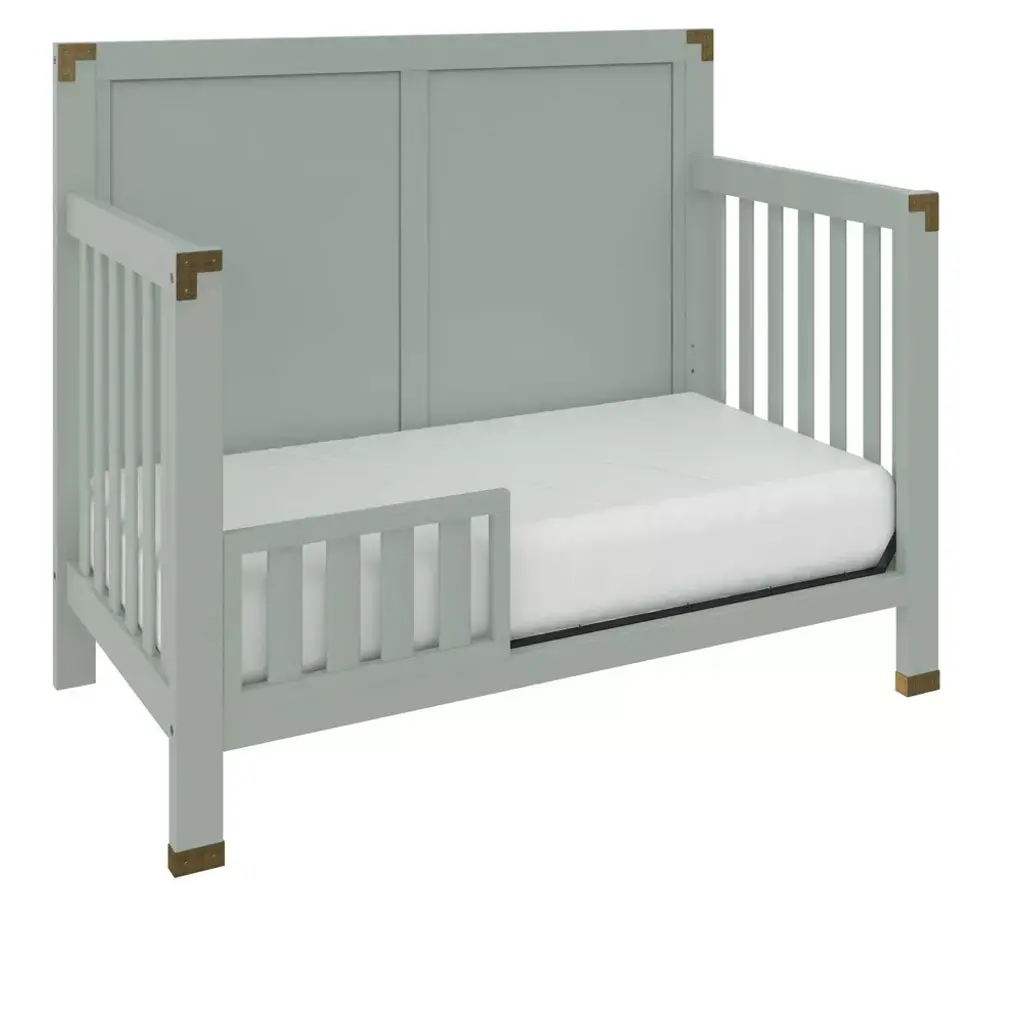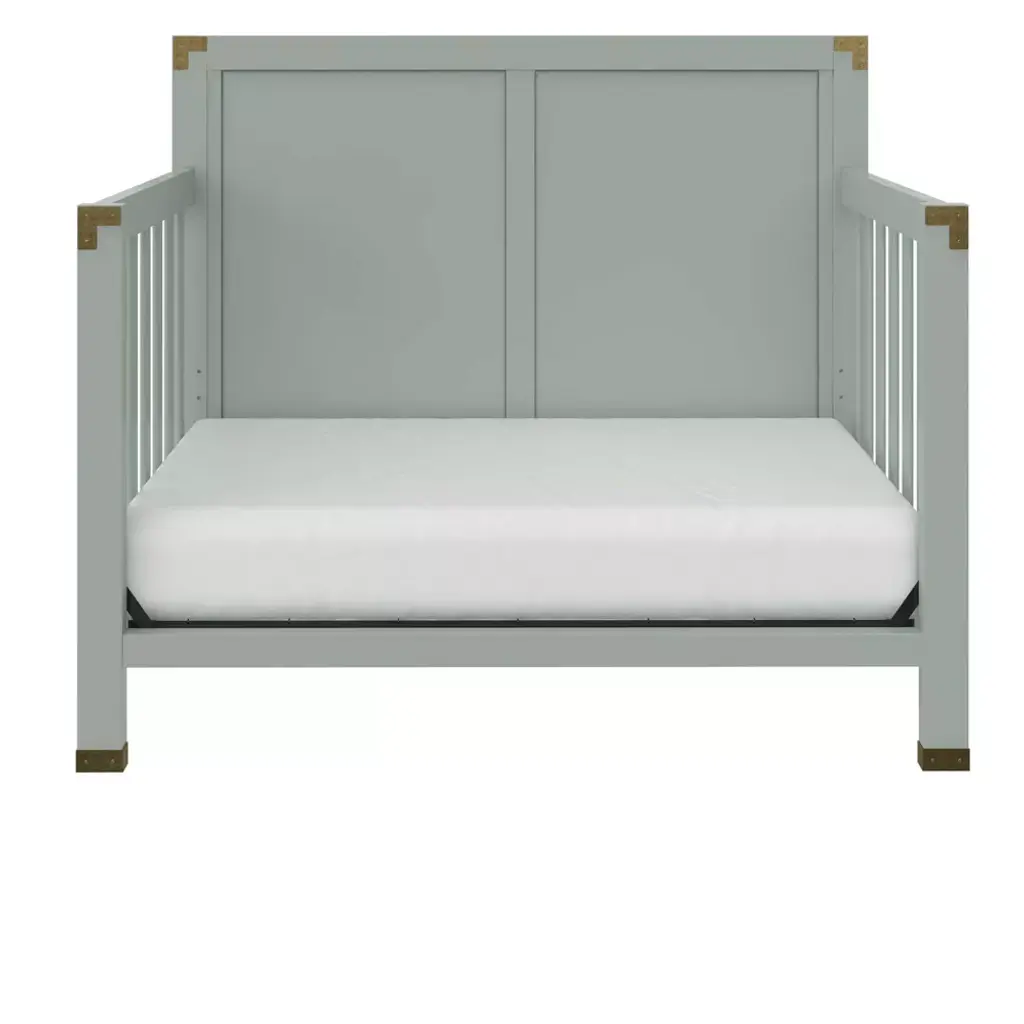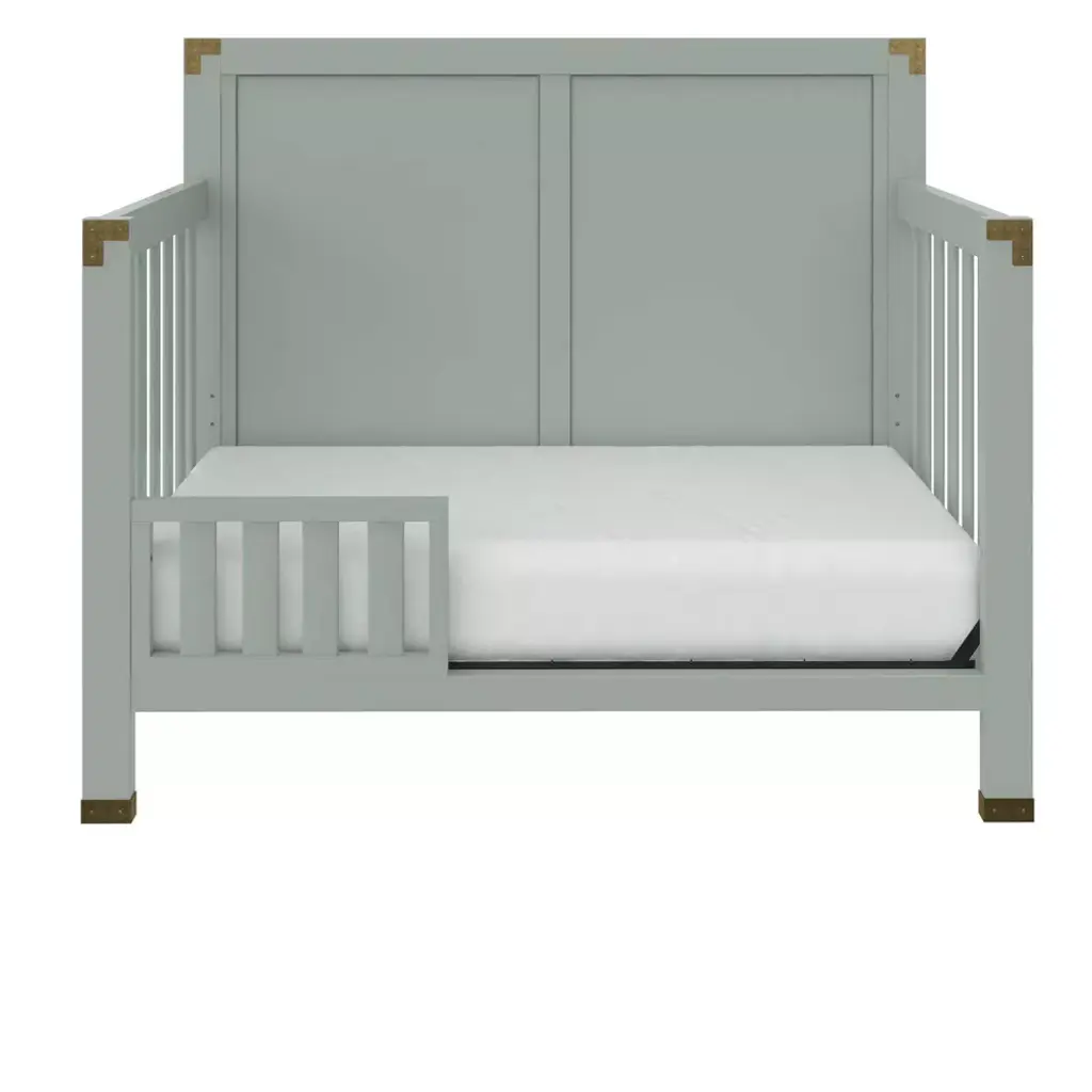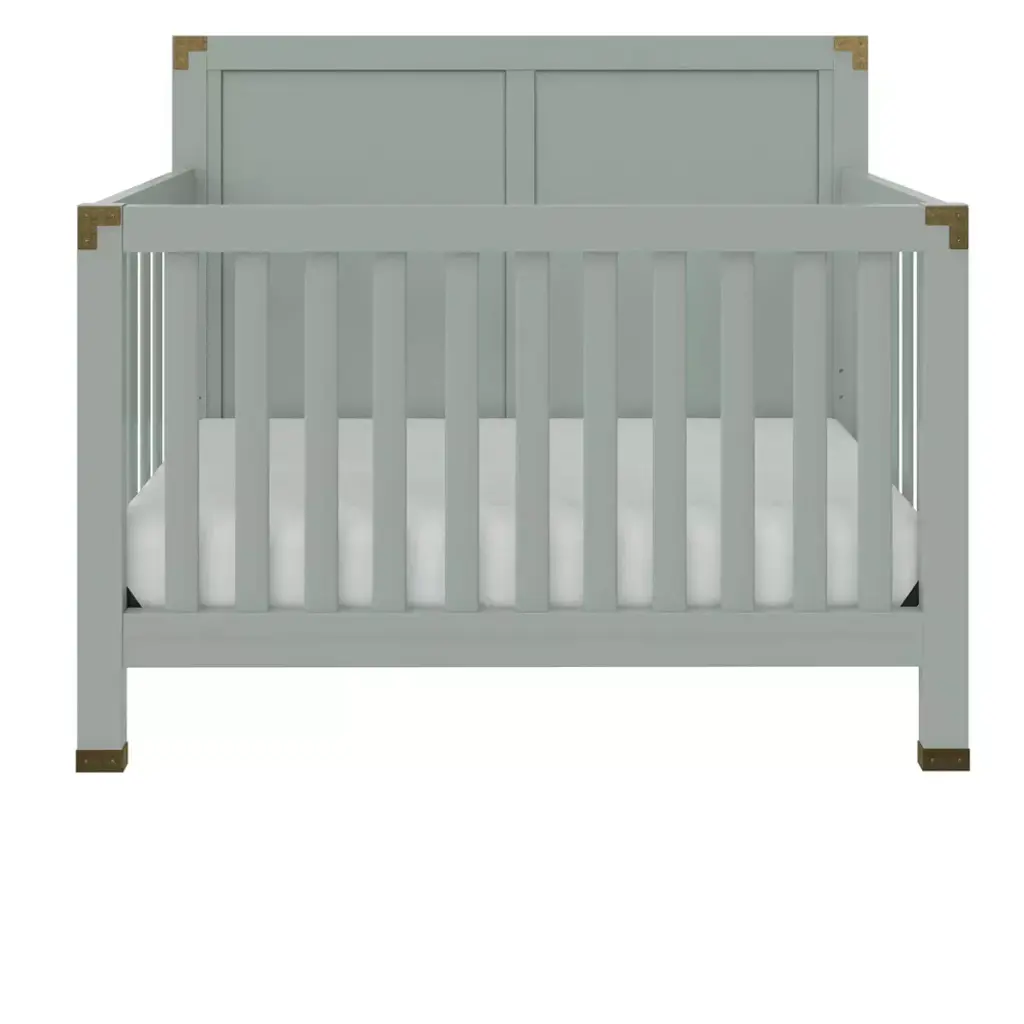 Create a space that is fun and sophisticated with the delightful Georgia 5-in-1 Convertible Crib by Baby Relax. Combining campaign and modern style, this charismatic crib is crafted with a sturdy wood construction and features a full panel headboard, vertical slats footboard and simple post style legs. Sleek and safe, this crib comes equipped with four mattress positions that allow you to adjust the height of the platform as your child grows. When your child is ready, the Georgia conveniently converts from a crib to a daybed, toddler bed and finally a full size bed. From functionality also sprang great design with modern features such as clean lines, and campaign style inspired aged brass décor metal plates that accent the corners of both the headboard and footboard. Combine the Georgia 5-in-1 Convertible Crib with the rest of the Baby Relax Georgia collection to design a playfully sophisticated nursery room that will live, move and grow alongside your child.