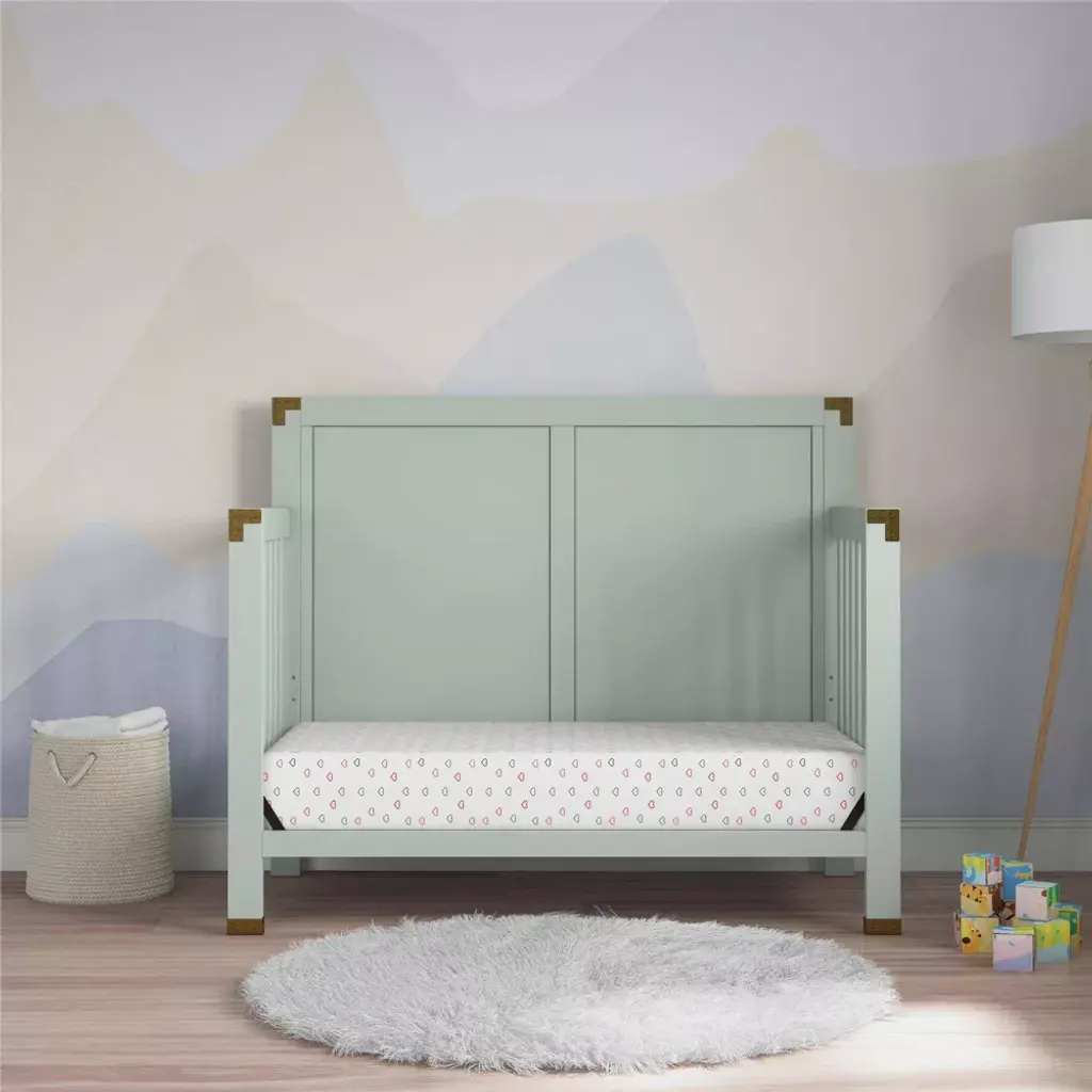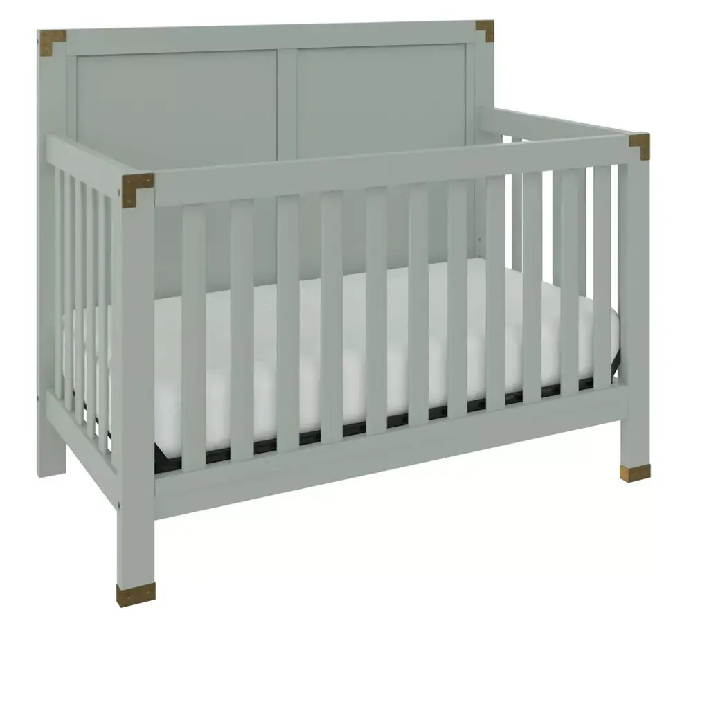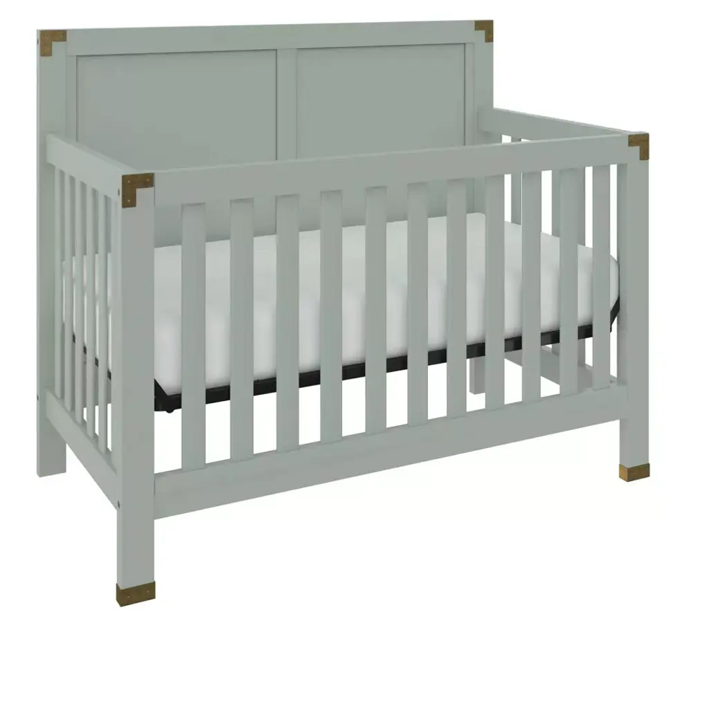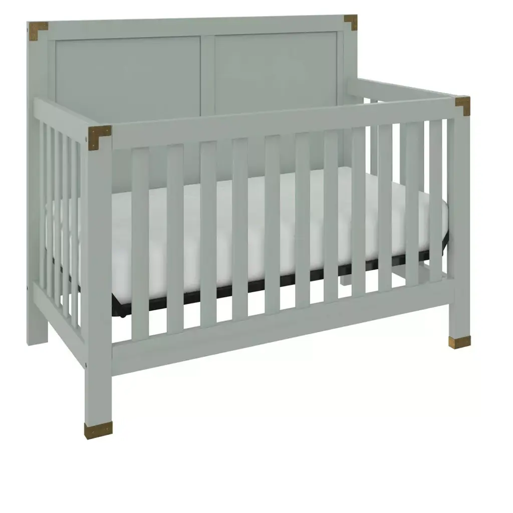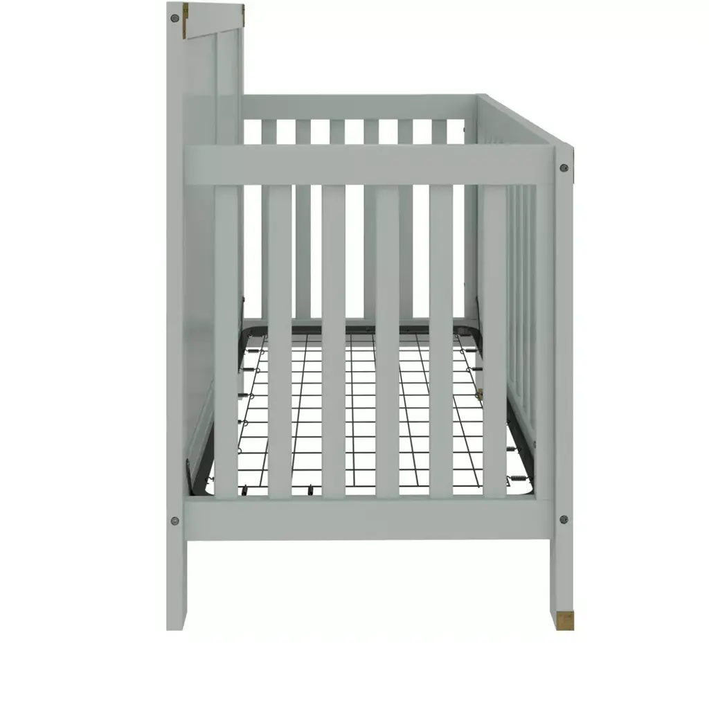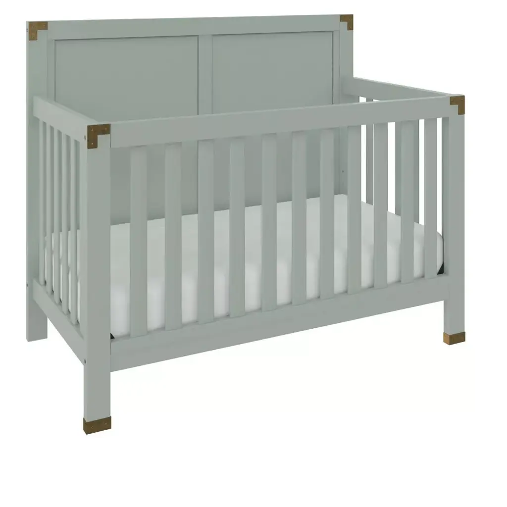 Create a space that is fun and sophisticated with the delightful Georgia 5-in-1 Convertible Crib by Baby Relax. Combining campaign and modern style, this charismatic crib is crafted with a sturdy wood construction and features a full panel headboard, vertical slats footboard and simple post style legs. Sleek and safe, this crib comes equipped with four mattress positions that allow you to adjust the height of the platform as your child grows. When your child is ready, the Georgia conveniently converts from a crib to a daybed, toddler bed and finally a full size bed. From functionality also sprang great design with modern features such as clean lines, and campaign style inspired aged brass décor metal plates that accent the corners of both the headboard and footboard. Combine the Georgia 5-in-1 Convertible Crib with the rest of the Baby Relax Georgia collection to design a playfully sophisticated nursery room that will live, move and grow alongside your child.