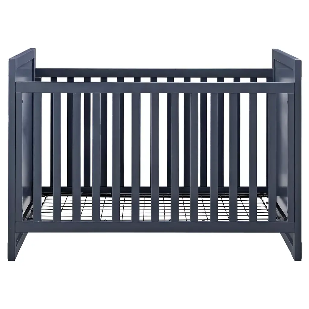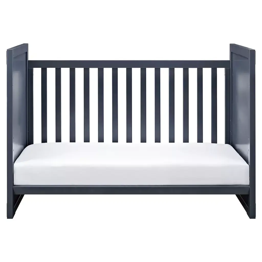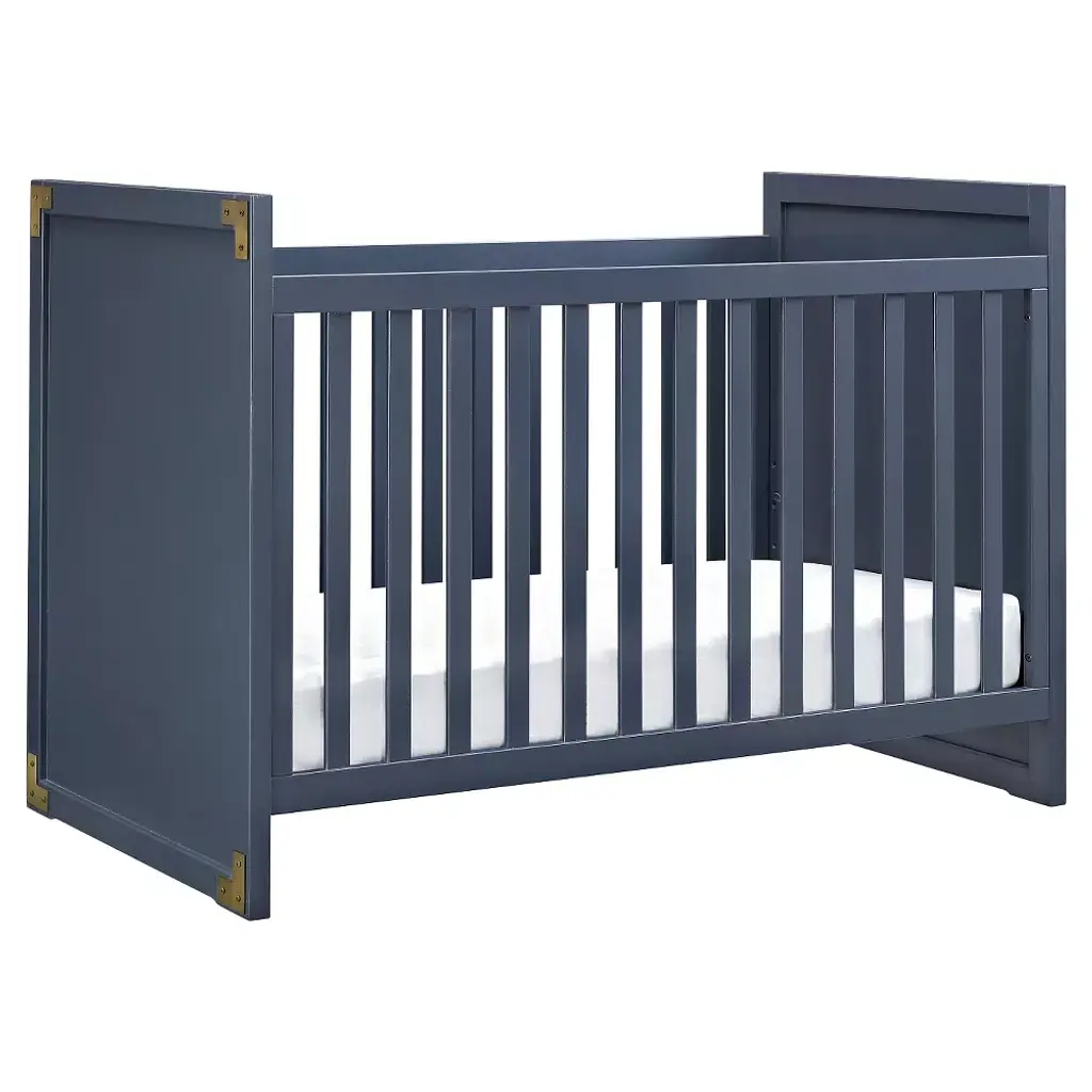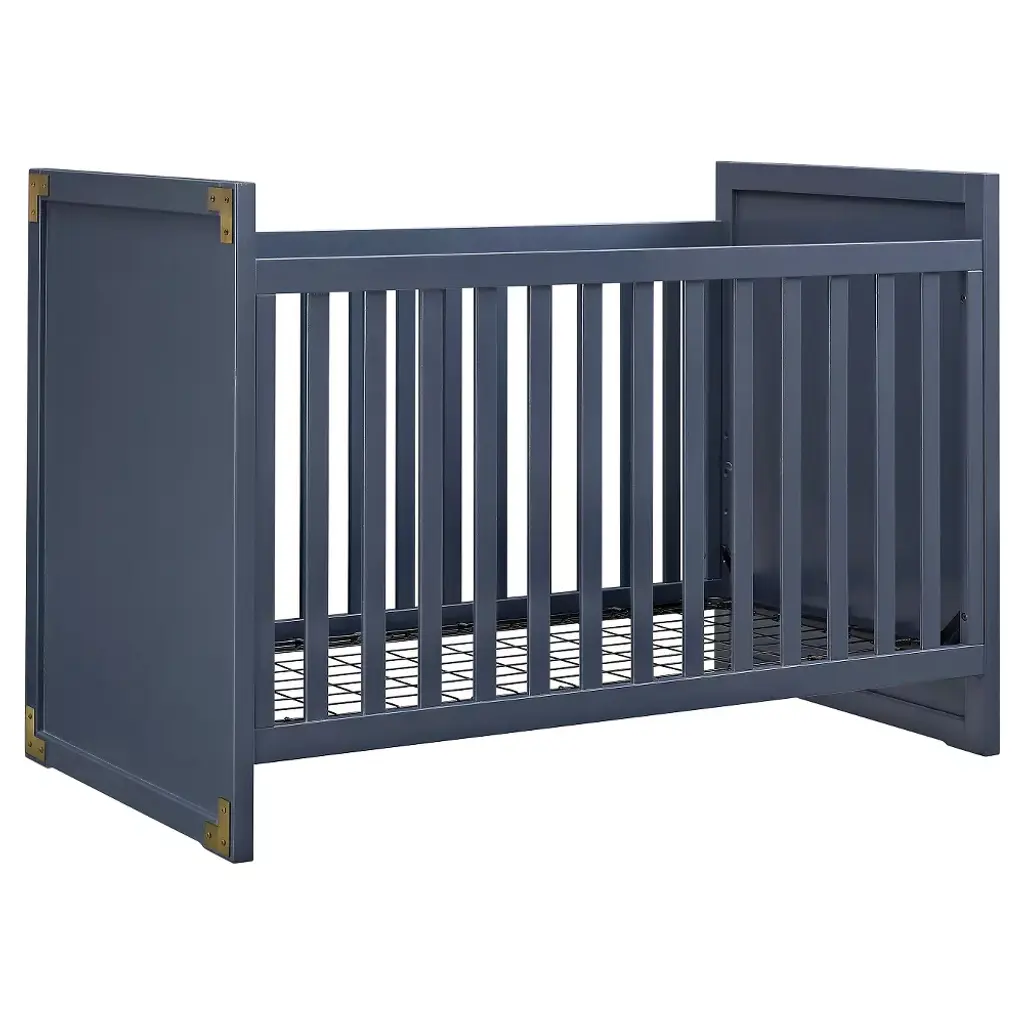 Create a space that is fun and sophisticated with the delightful Georgia 2-in-1 Convertible Crib by Baby Relax. Combining campaign and modern style, this charismatic crib is crafted with a sturdy wood construction and includes two full-size end panels. Sleek and safe, this crib comes equipped with four mattress positions that allow you to adjust the height of the platform as your child grows. When your child is ready, the Georgia also conveniently converts into a stylish toddler daybed. From functionality also sprang great design with modern features such as clean lines, a fresh graphite blue finish, and aged brass decor metal plates that accent the corners of the end panels. Combine the Georgia 2-in-1 Convertible Crib with the rest of the Baby Relax Georgia collection to design a playfully sophisticated nursery room that will live, move, and grow alongside your child.