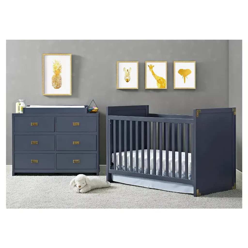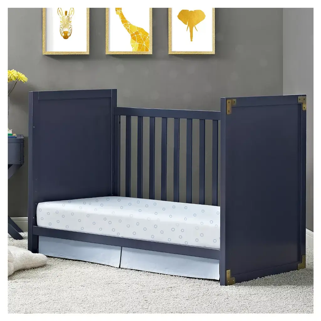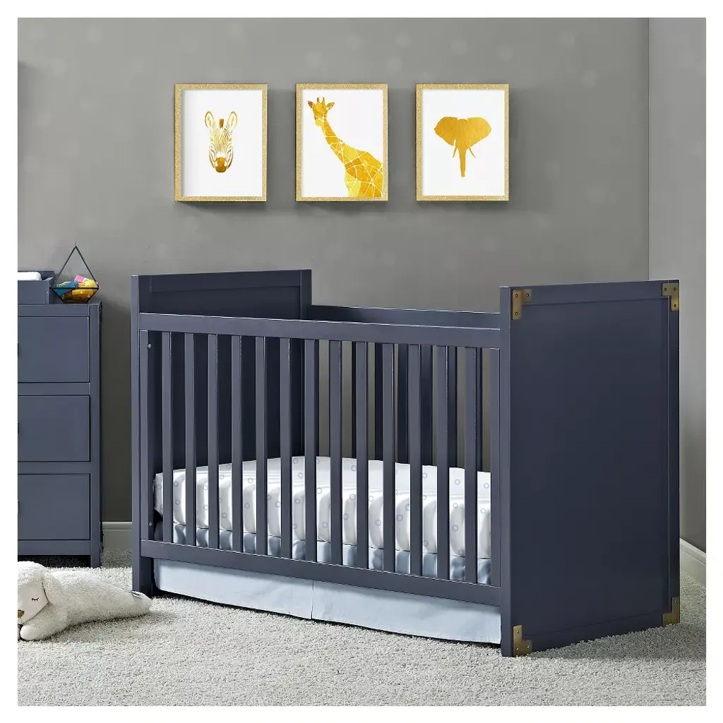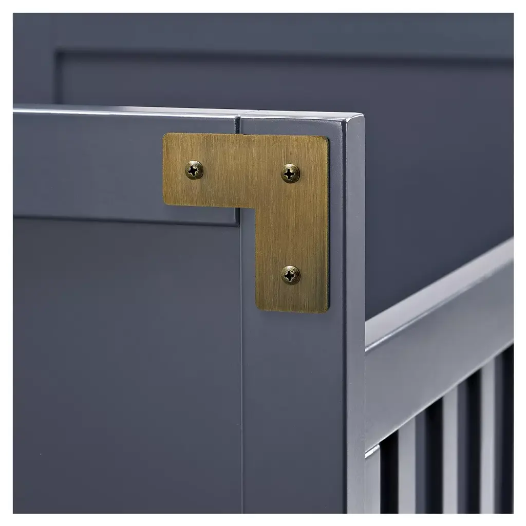Create a space that is fun and sophisticated with the delightful Georgia 2-in-1 Convertible Crib by Baby Relax. Combining campaign and modern style, this charismatic crib is crafted with a sturdy wood construction and includes two full-size end panels. Sleek and safe, this crib comes equipped with four mattress positions that allow you to adjust the height of the platform as your child grows. When your child is ready, the Georgia also conveniently converts into a stylish toddler daybed. From functionality also sprang great design with modern features such as clean lines, a fresh graphite blue finish, and aged brass decor metal plates that accent the corners of the end panels. Combine the Georgia 2-in-1 Convertible Crib with the rest of the Baby Relax Georgia collection to design a playfully sophisticated nursery room that will live, move, and grow alongside your child.