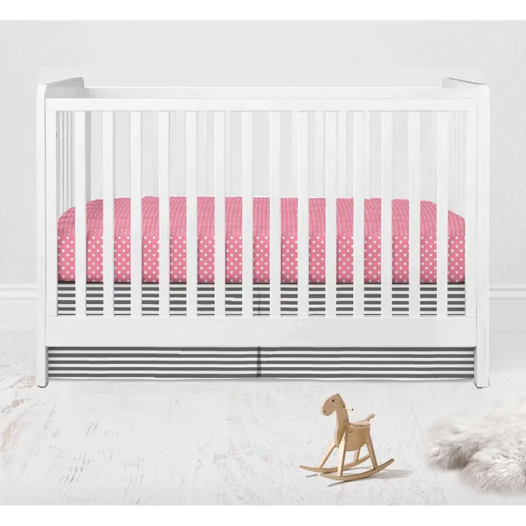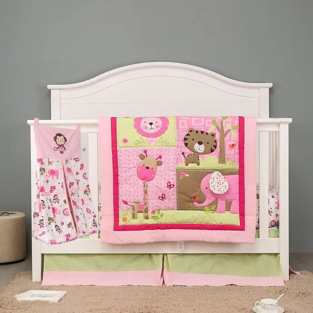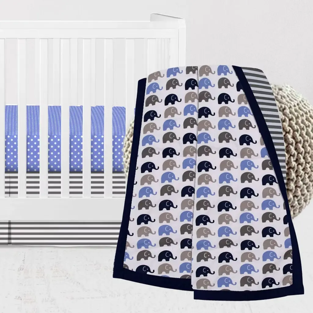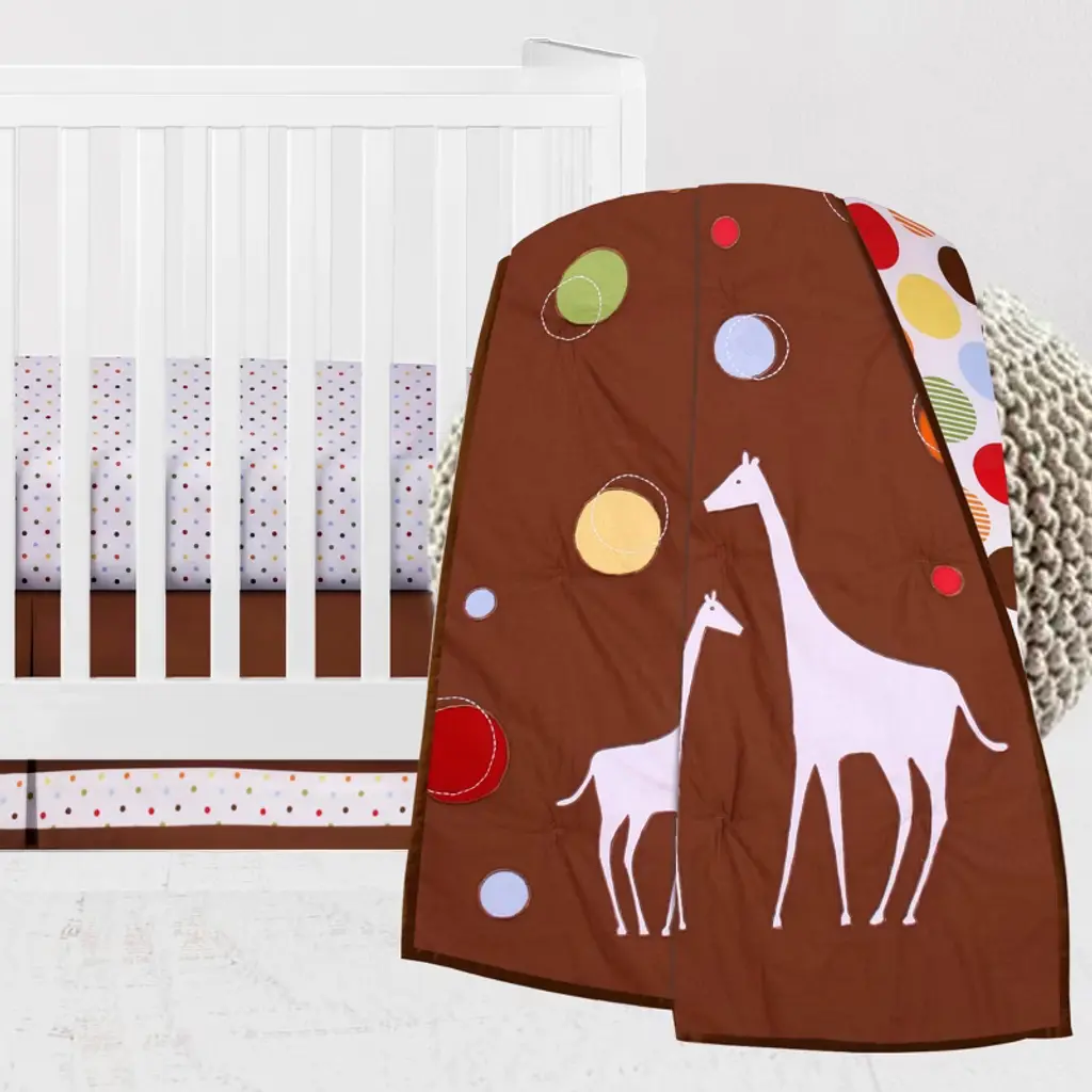 Welcome your little one with this Bacati 4-piece Crib Set Includes Reversible Comforter/Playmat, Crib fitted sheet, Crib skirt/Dust ruffle and Diaper Stacker in fun, colorful and signature prints designed in United States by Experienced Designers. This nursery crib bedding set is easy care and provides the comfort your baby needs. All Fabrics used in making this bedding are 100 percent Cotton Percale Fabrics in signature Bacati - prints and filled with lofty polyester where needed. There are many other cordinating accessories to purchase separately in this Bacati bedding collection. Sleep Safely, Little One : When putting baby to sleep, Bare is Best in the crib. Use a firm, tight-fitting mattress and remove pillows, quilts, comforters, toys and other soft items. We made it better so you can feel better.