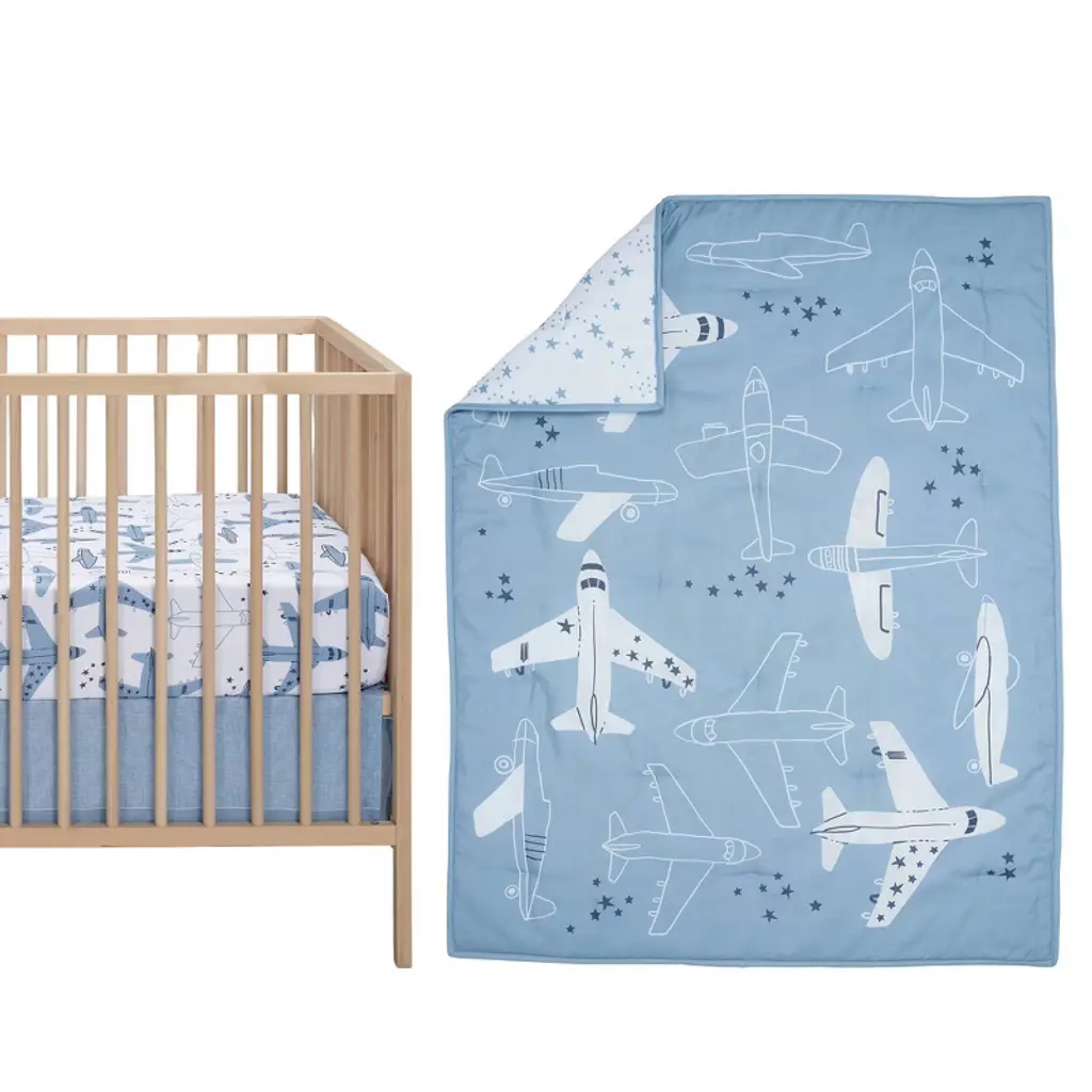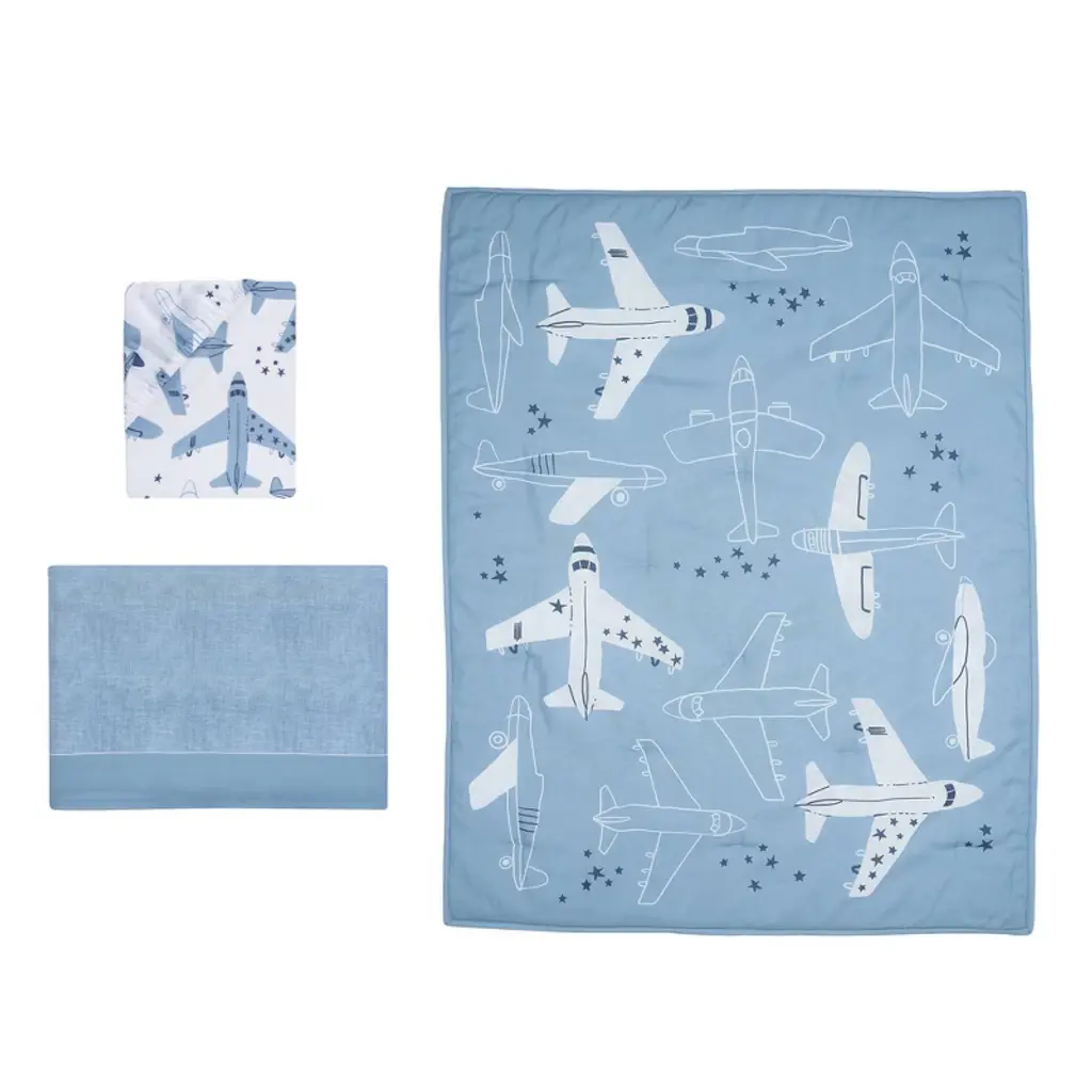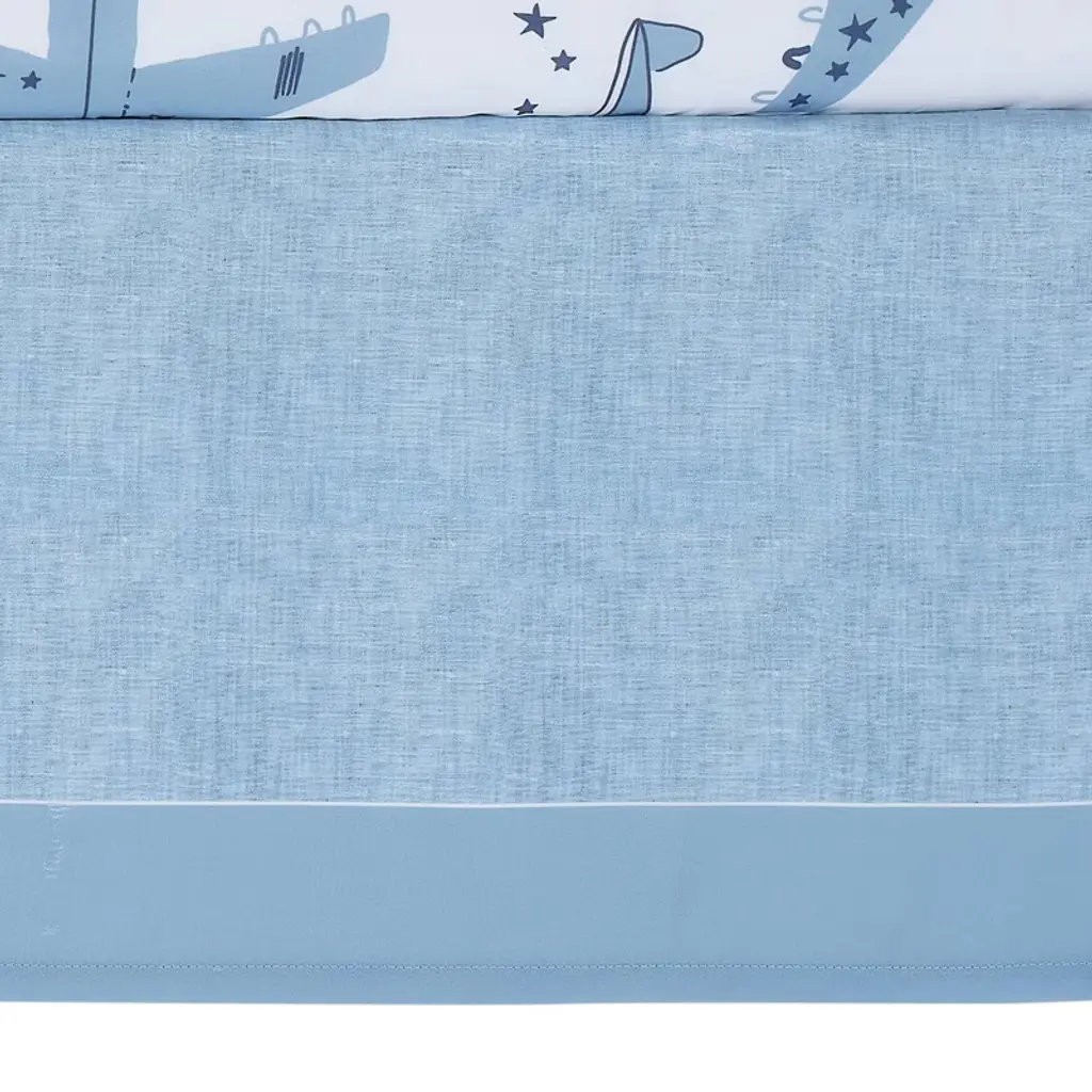 Let your baby aviator drift off to dreamland soaring through starry skies with this Little Aviator 3-piece crib bedding set which includes one quilt, one fitted crib sheet and one crib skirt. It is made in a soft microfiber material which is gentle on your baby’s delicate skin. The quilt has various style airplanes both solid and outlined, on a soft blue background. The back of the quilt is a playful constellation of stars scattered across a clean white ground. The crib sheet is on a white ground with blue and white airplanes. There is elastic all the way around ensuring a safe and secure fit on a standard size crib mattress measuring 28” X 52”. The crib skirt adds the finishing touch to your child’s crib. It is a printed textured sky blue color with a 2” solid blue border at the bottom.