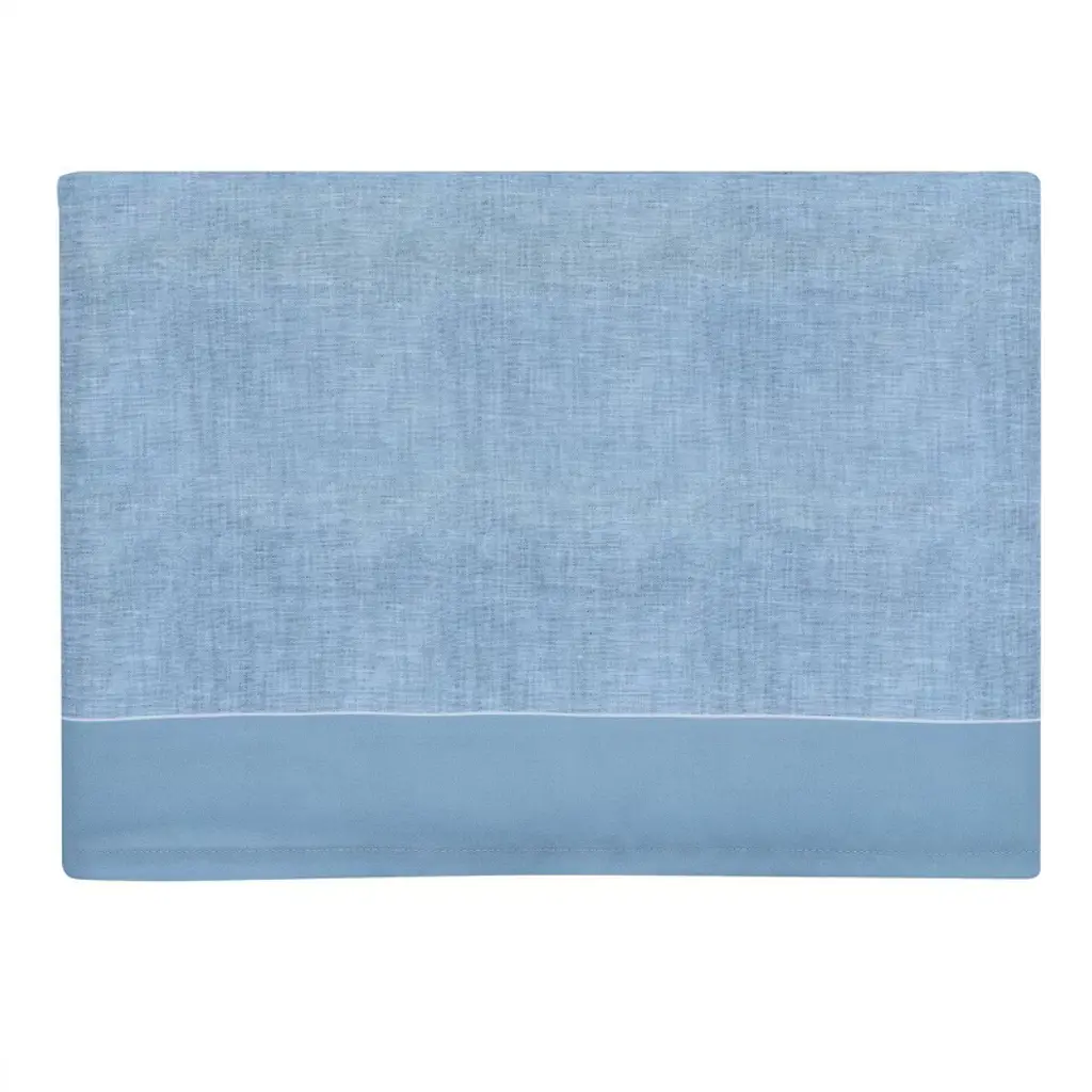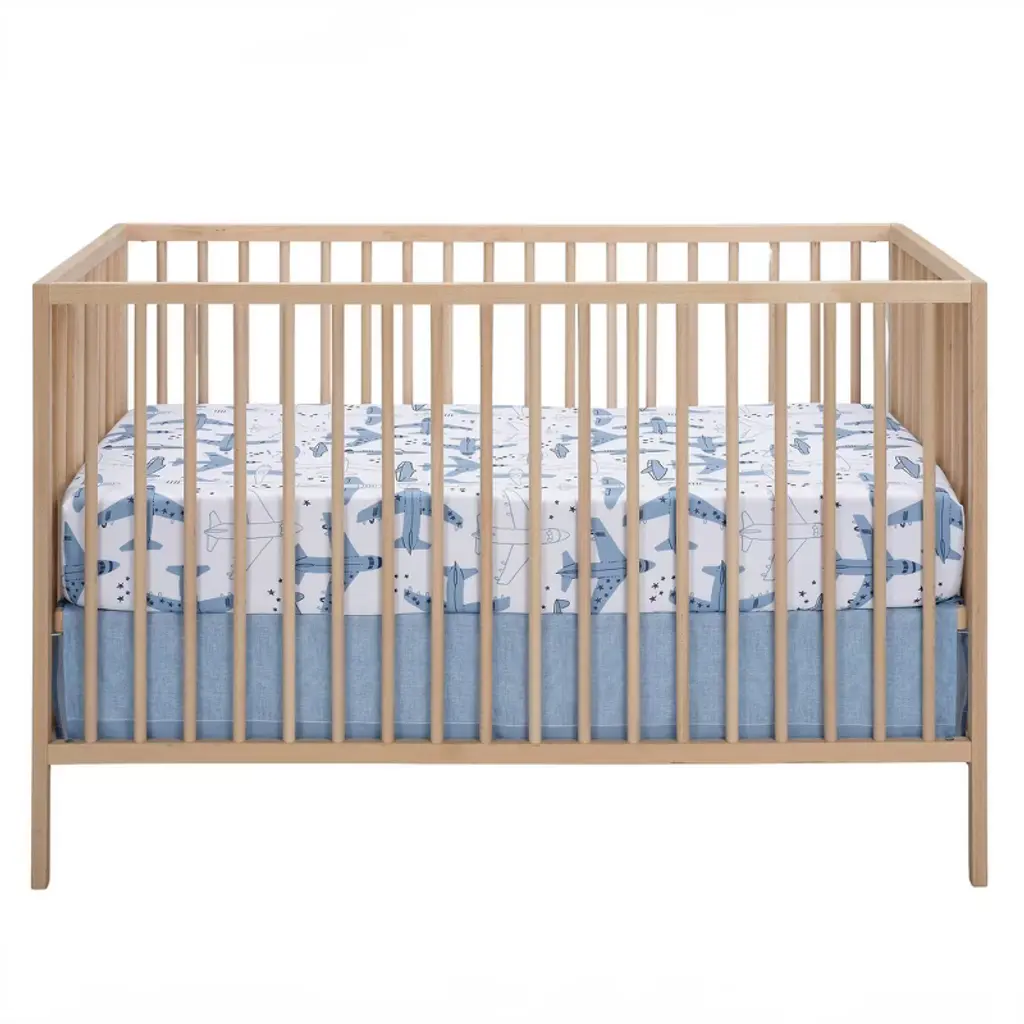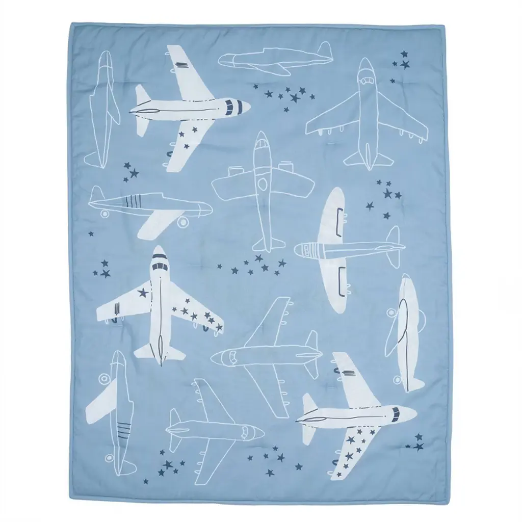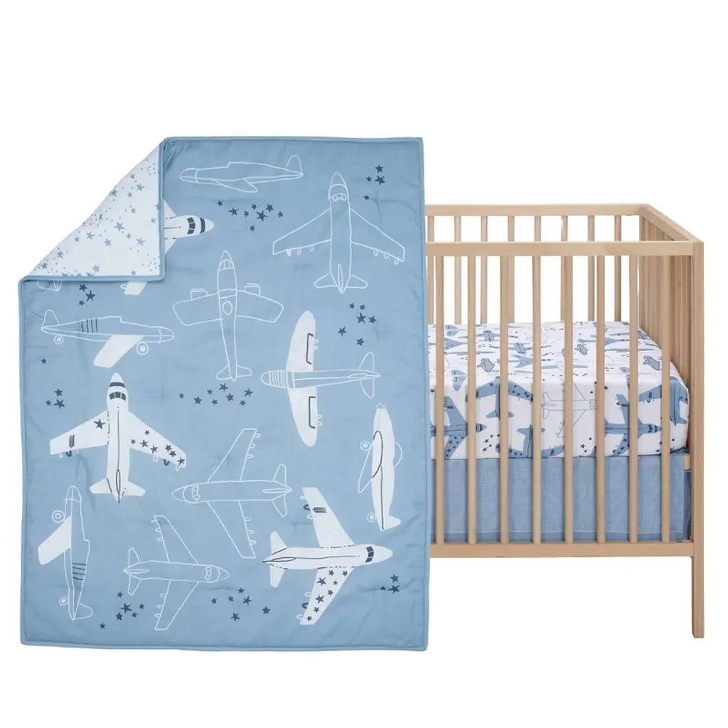 Let your baby aviator drift off to dreamland soaring through starry skies with this Little Aviator 3-piece crib bedding set which includes one quilt, one fitted crib sheet and one crib skirt. It is made in a soft microfiber material which is gentle on your baby’s delicate skin. The quilt has various style airplanes both solid and outlined, on a soft blue background. The back of the quilt is a playful constellation of stars scattered across a clean white ground. The crib sheet is on a white ground with blue and white airplanes. There is elastic all the way around ensuring a safe and secure fit on a standard size crib mattress measuring 28” X 52”. The crib skirt adds the finishing touch to your child’s crib. It is a printed textured sky blue color with a 2” solid blue border at the bottom.