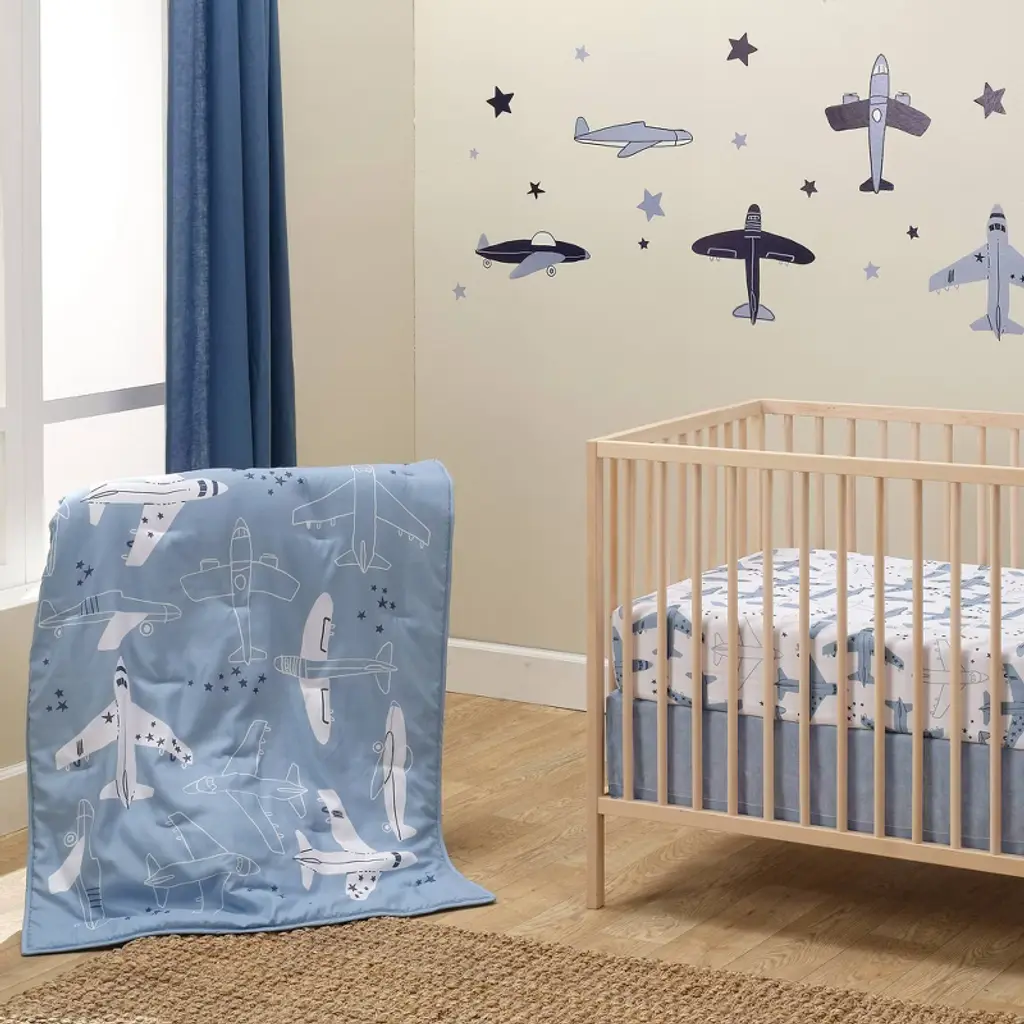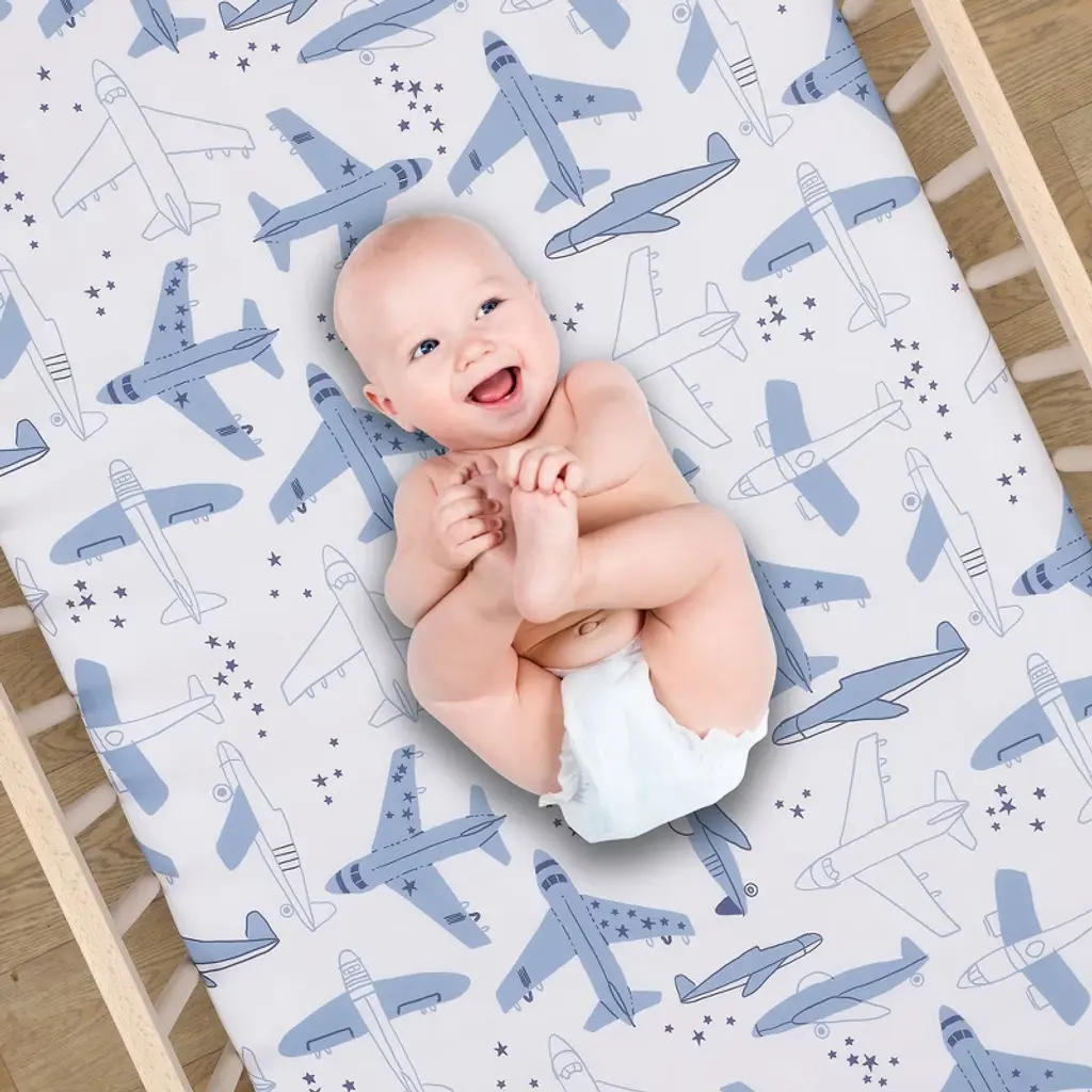 The Little Aviator crib sheet is a launchpad for sweet dreams and will transform your baby’s crib into a cozy cockpit, ready for magical adventures through the land of sleep. It is on a soft white ground with a charming pattern of airplanes and stars in soft hues of blues. It is made of a super soft microfiber material which is gentle on a baby's delicate skin. It has elastic all the way around ensuring a safe and secure fit on a standard size crib mattress measuring 28” X 52”