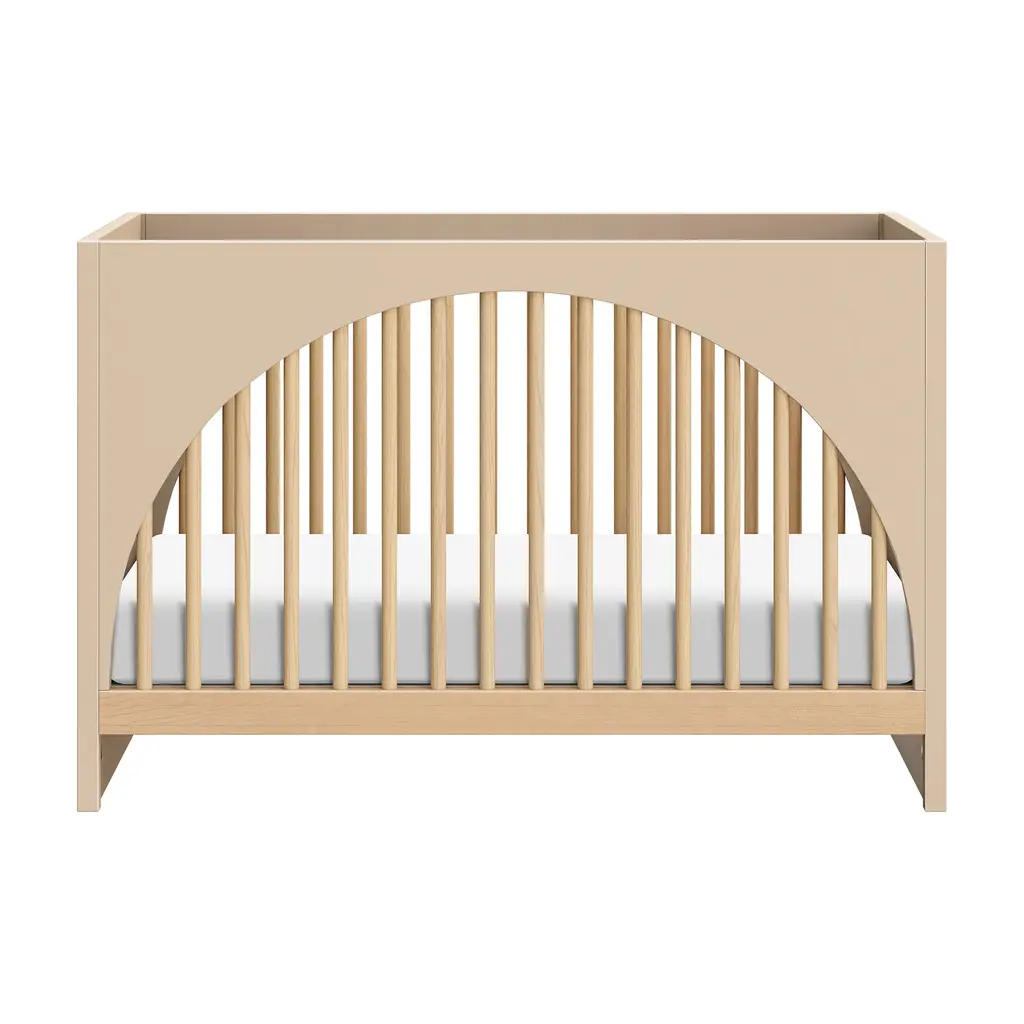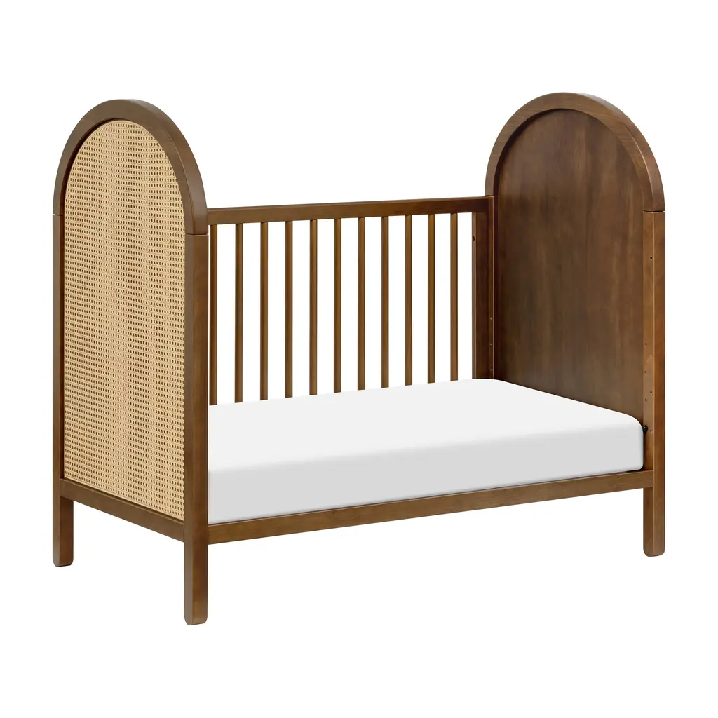 Transform your nursery into a boho oasis with the Bondi 3-in-1 Convertible Crib from Babyletto. Crafted with warm wood tones, playful arched side panels, and curved feet, this crib exudes natural elegance. As your babe grows, the included toddler bed conversion rail ensures longevity. Plus, rest easy knowing it meets GREENGUARD GOLD Certification for low chemical emissions. Highlights