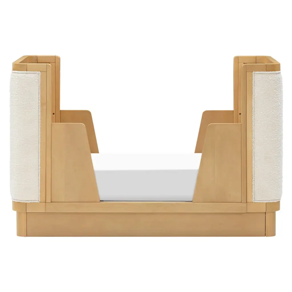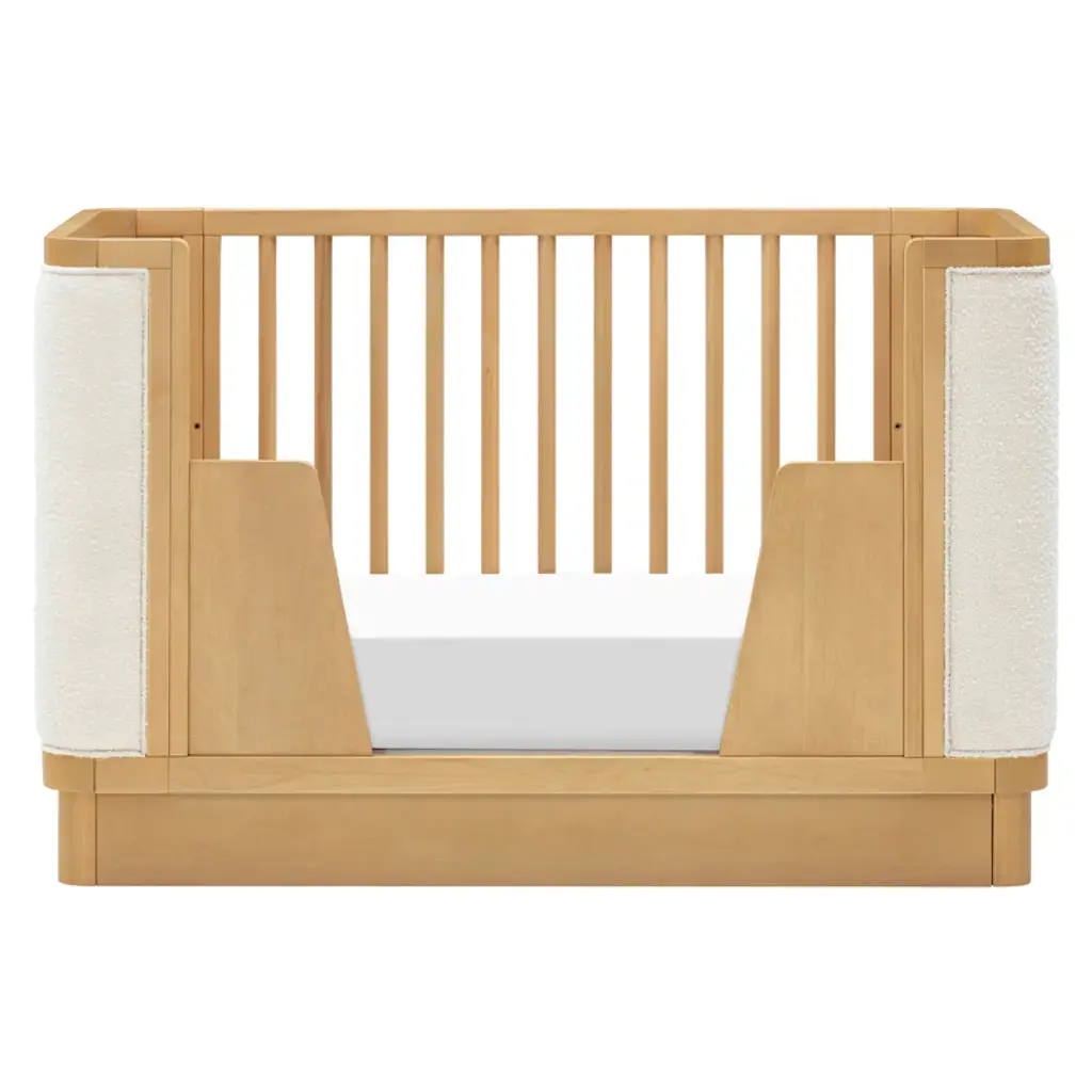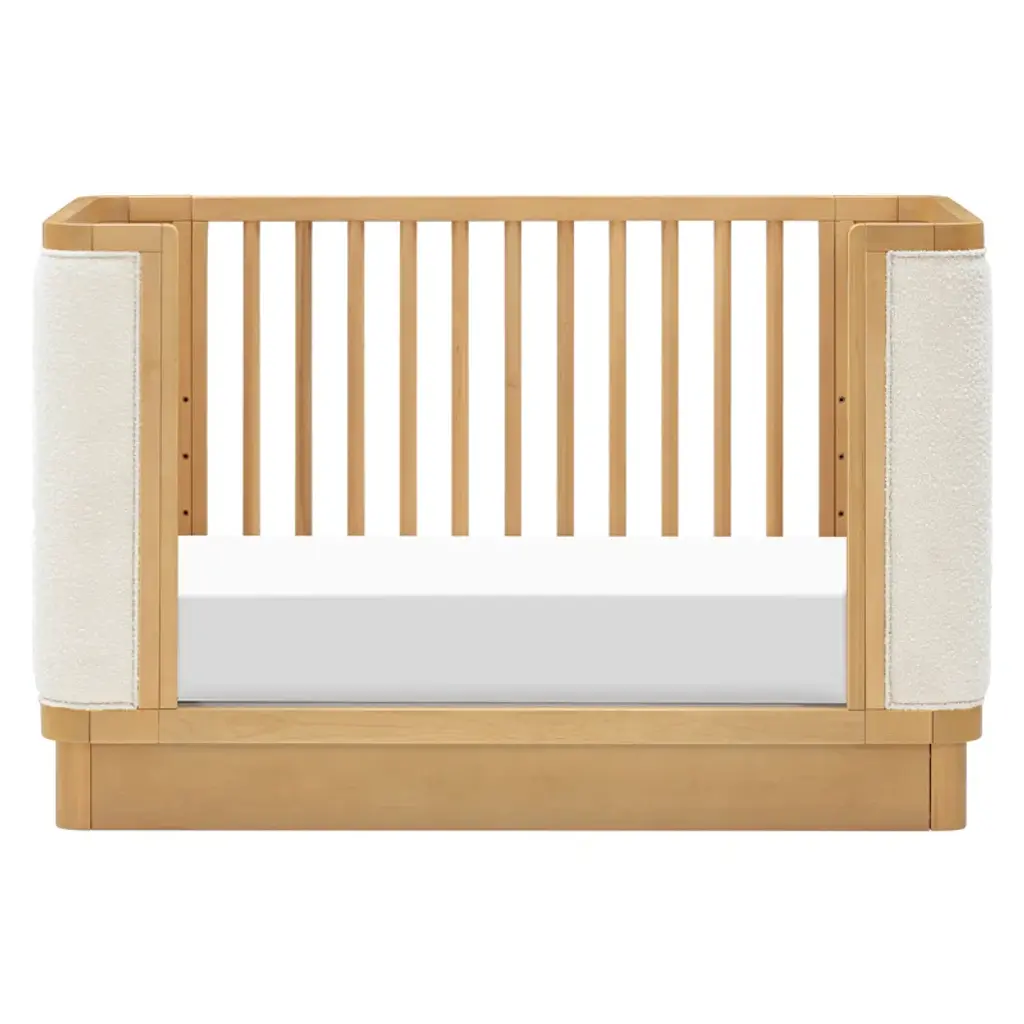 The Bondi Boucle 4-in-1 Convertible Crib celebrates boho-inspired design with its warm wood tone, rounded corners, and cozy boucle upholstery to create a dreamy aesthetic for your nursery . The Bondi is designed to grow with your babe using an included toddler bed conversion rail and is screened for harmful chemical emissions to ensure it meets GREENGUARD GOLD Certification.