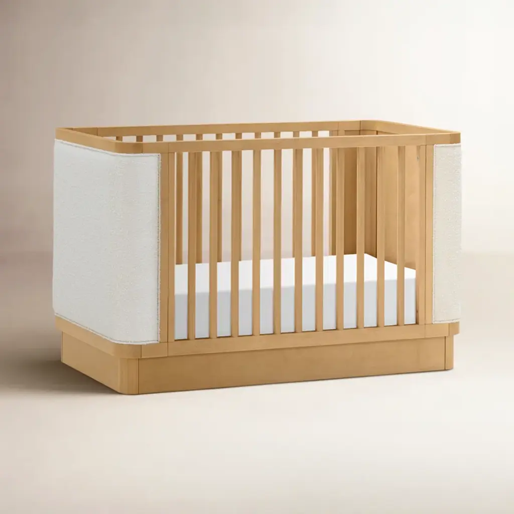 The Bondi Boucle 4-in-1 Convertible Crib celebrates boho-inspired design with its warm wood tone, rounded corners, and cozy boucle upholstery to create a dreamy aesthetic for your nursery . The Bondi is designed to grow with your babe using an included toddler bed conversion rail and is screened for harmful chemical emissions to ensure it meets GREENGUARD GOLD Certification.