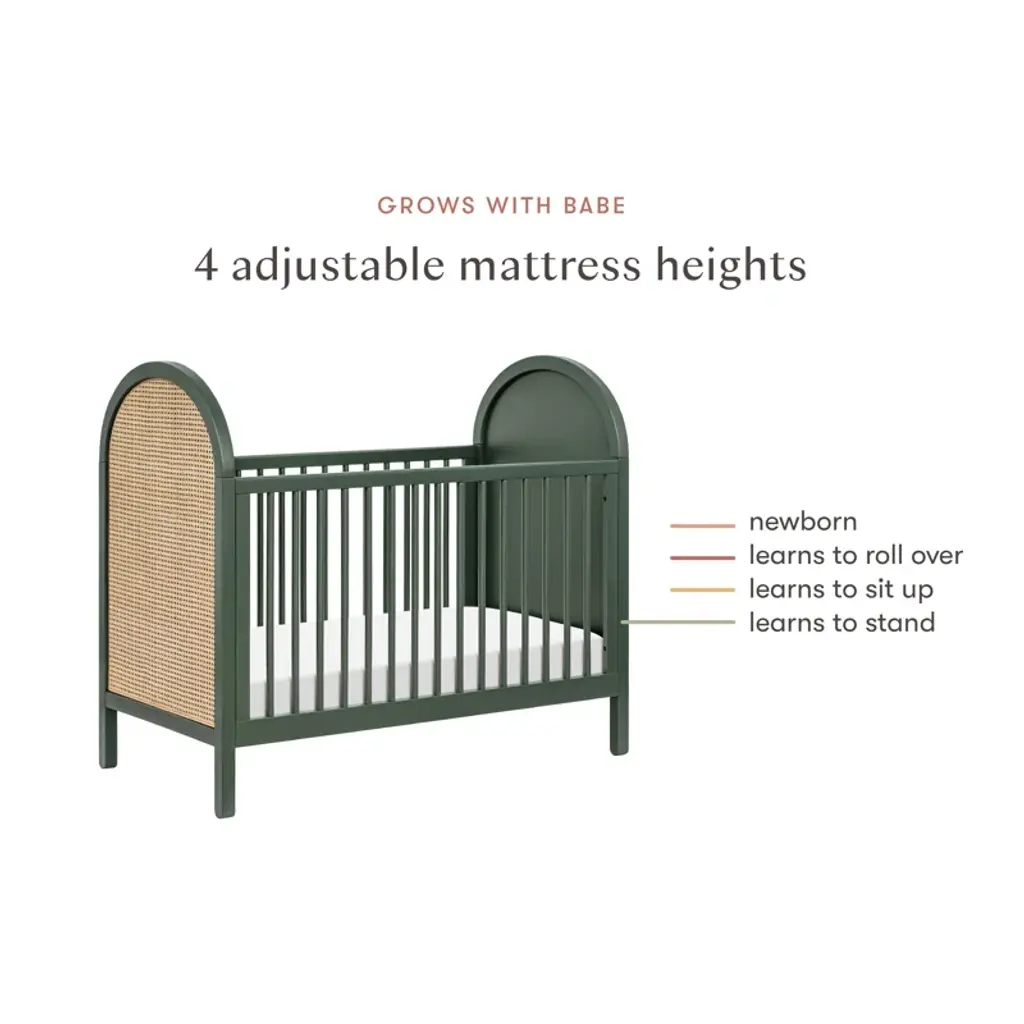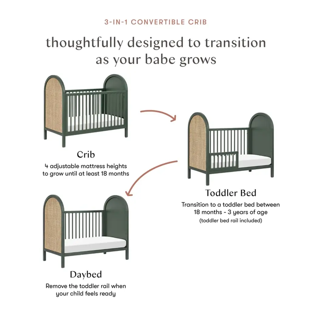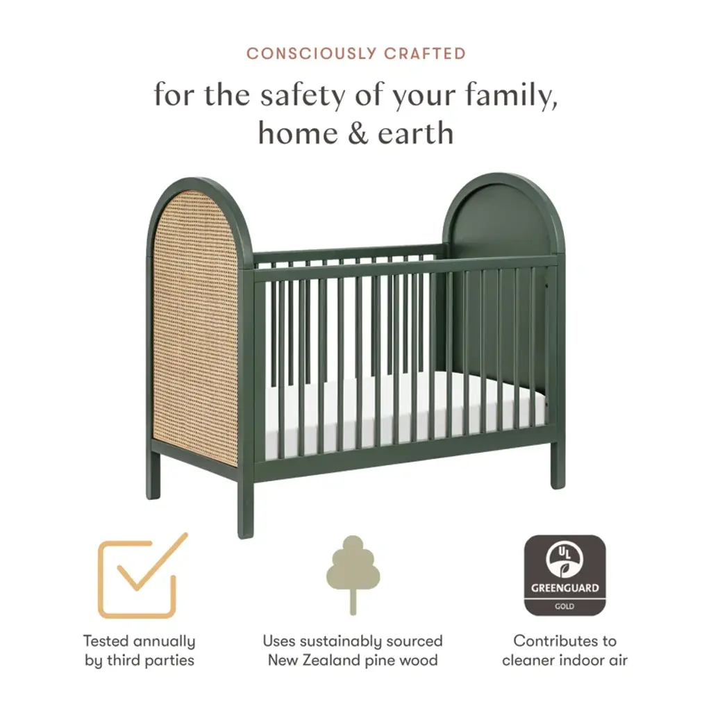 The Bondi Cane 3-in-1 Convertible Crib celebrates boho-inspired design and natural materials with its warm wood tone, playfully arched side panels, curved feet, and woven plant-based cane. The Bondi is designed to grow with your babe using an included toddler bed conversion rail and is screened for harmful chemical emissions to ensure it meets GREENGUARD GOLD Certification.