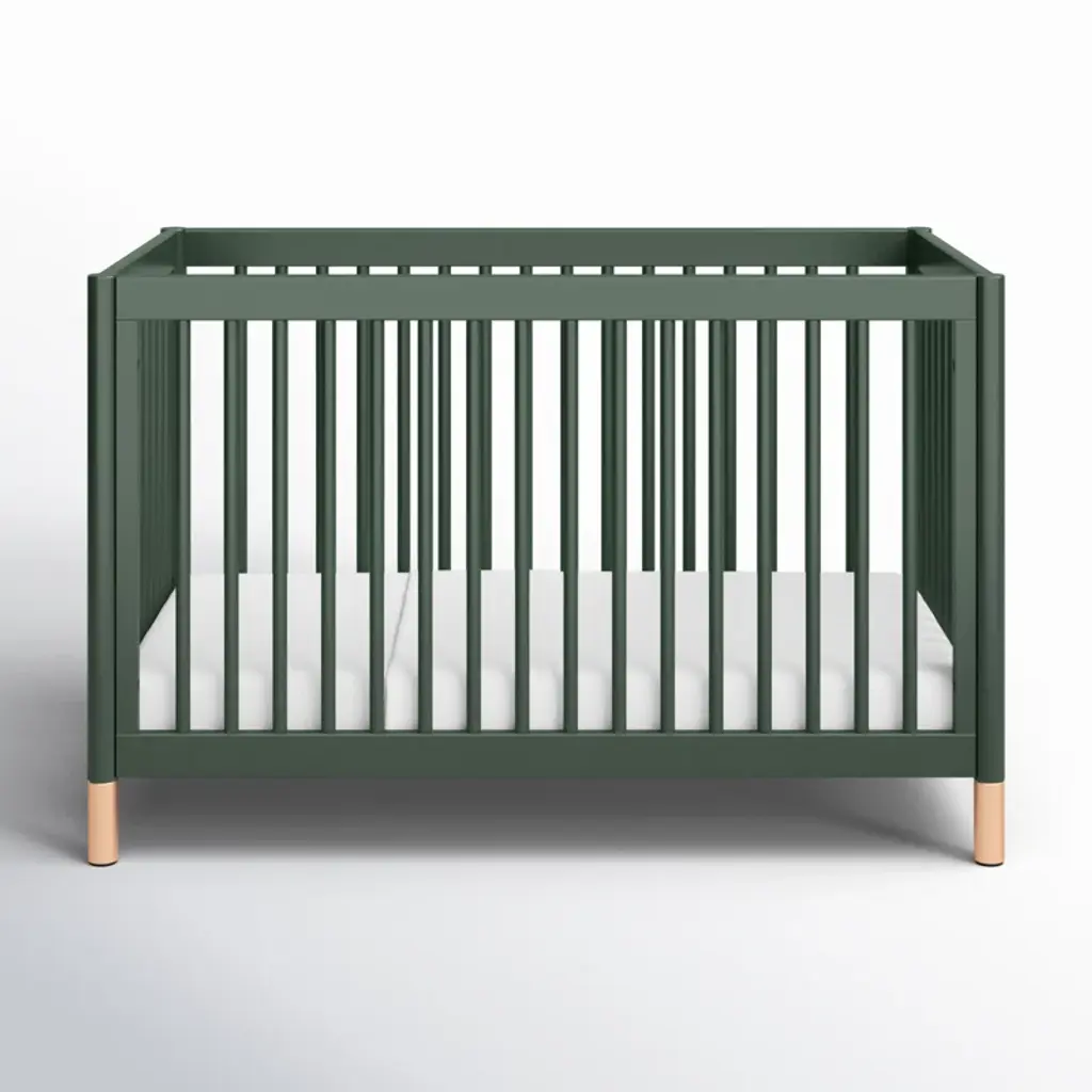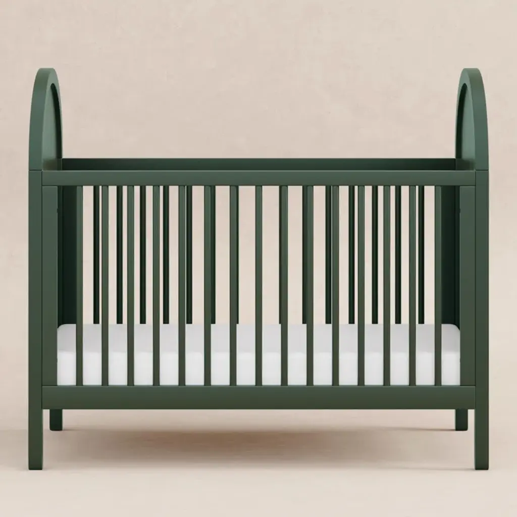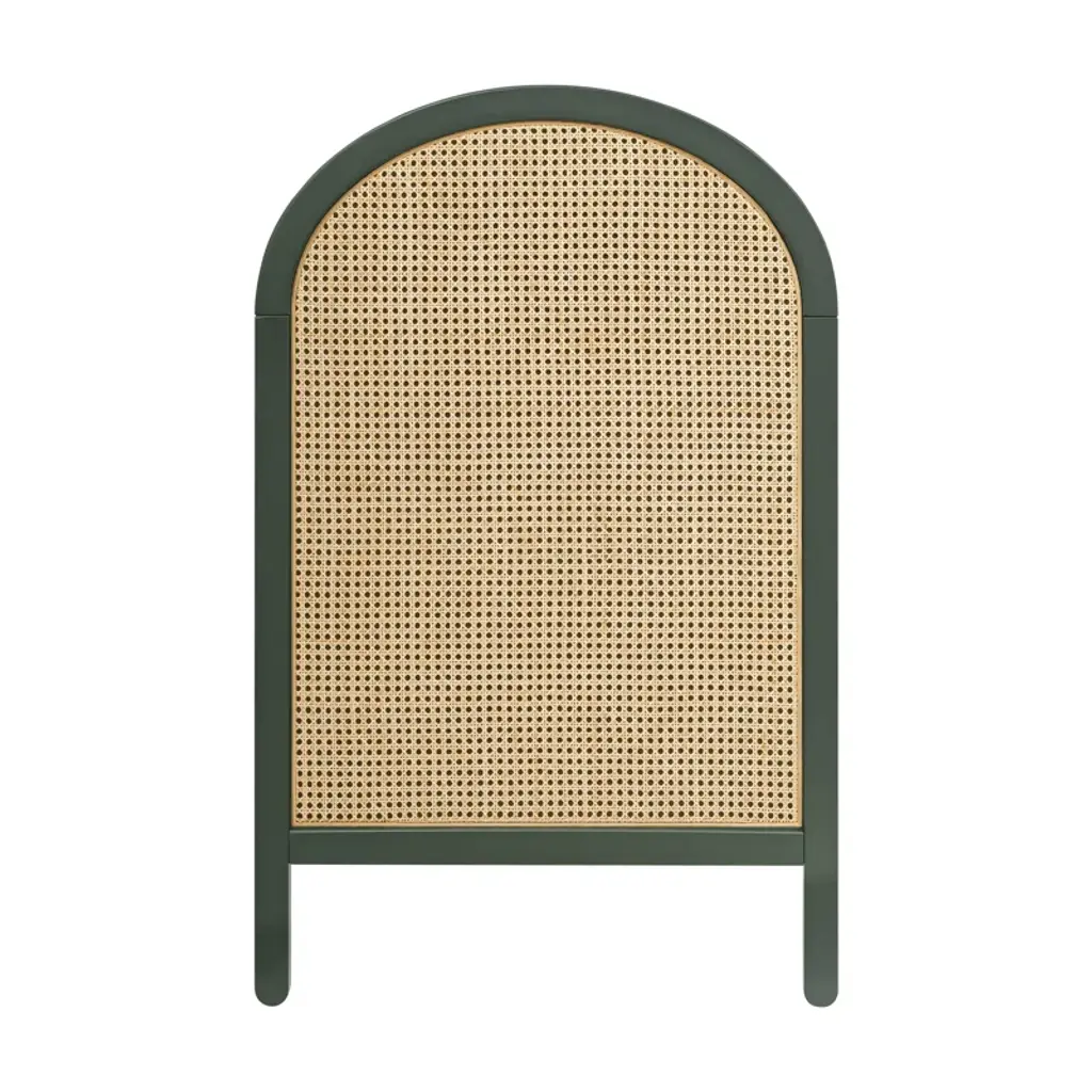 The Bondi Cane 3-in-1 Convertible Crib celebrates boho-inspired design and natural materials with its warm wood tone, playfully arched side panels, curved feet, and woven plant-based cane. The Bondi is designed to grow with your babe using an included toddler bed conversion rail and is screened for harmful chemical emissions to ensure it meets GREENGUARD GOLD Certification.