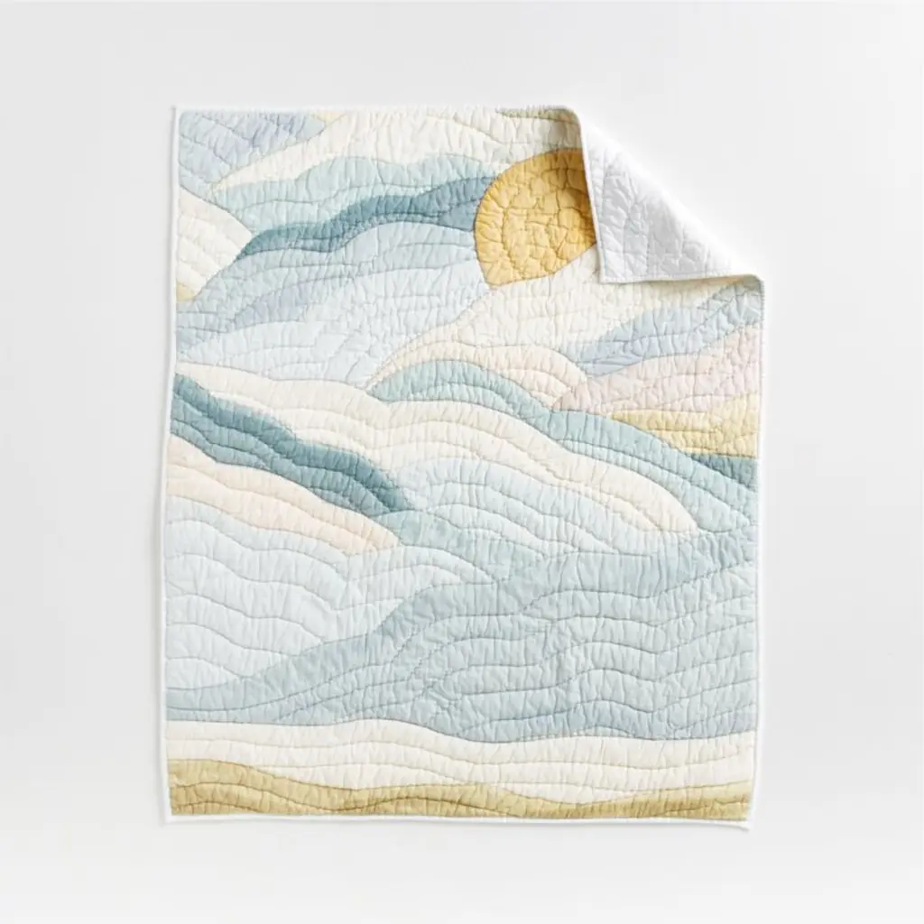 Rise, shine, sleep, repeat. Little ones can say hello to the sun surrounded by waves of billowy clouds in peaceful shades ranging from light blue and pale pink to bright white. Quilted by hand with shimmery metallic details, this supersoft organic cotton quilt has an heirloom-quality feel and brings whimsy to their bedtime routine. It's the perfect extra layer with a head-in-the-clouds design on one side and solid white on the other.