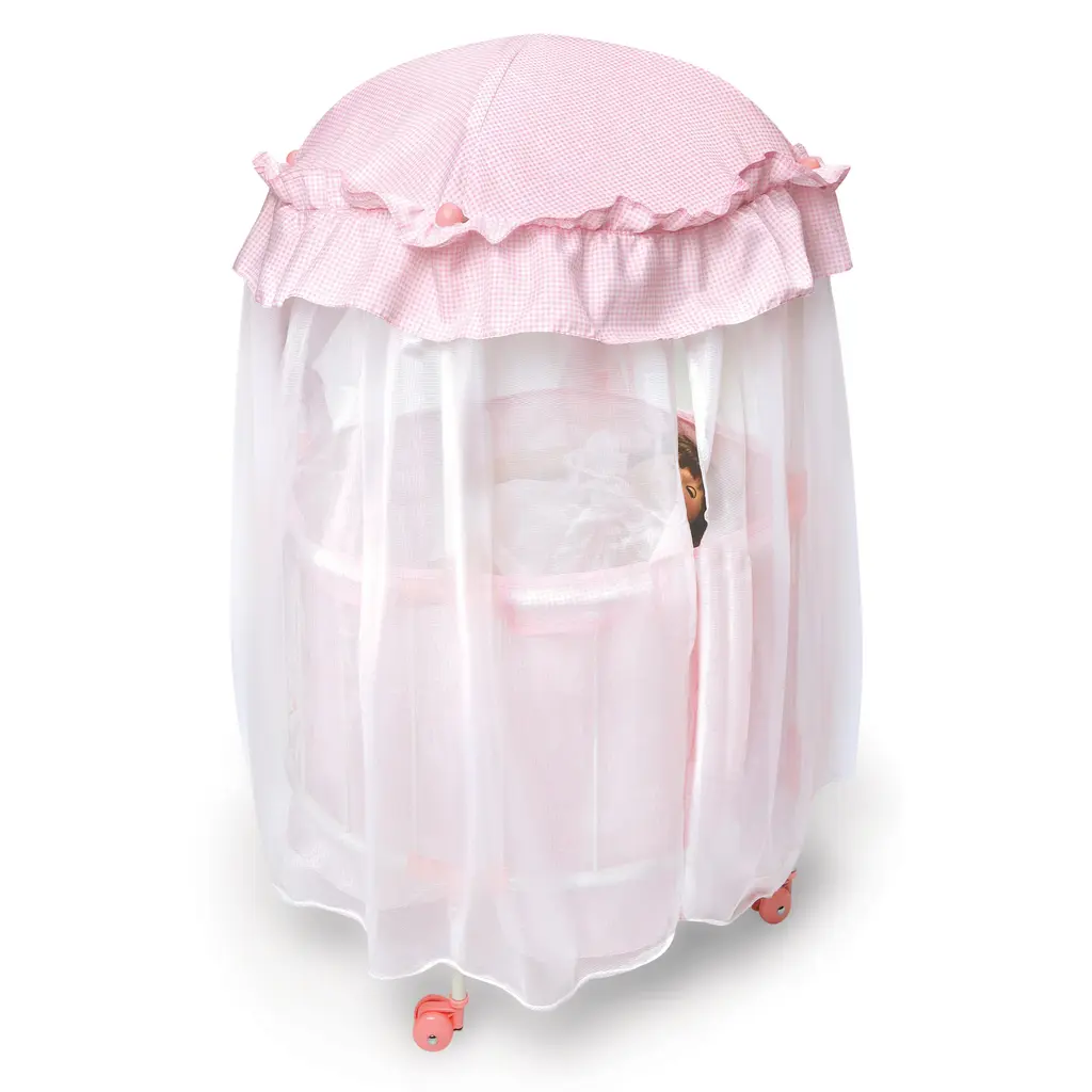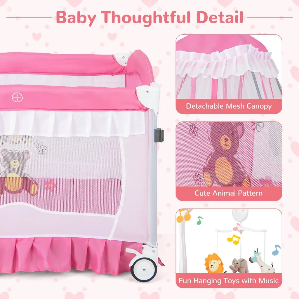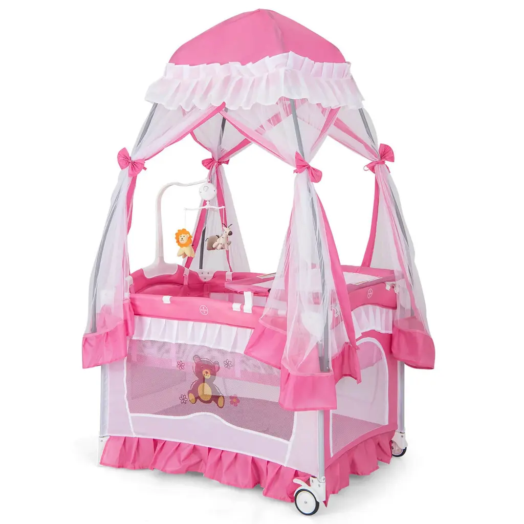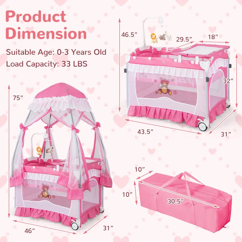 Make parenting a breeze with our 5-in-1 baby playard in a princess style! This all-in-one infant bassinet features a detachable mesh net to keep your baby safe from meshes, a removable changing table and a comfortable and breathable mattress. This removable full-size bassinet with zero incline that is under 10 degrees makes it a qualified sleeper for baby. Thus, this infant bassinet is not only a baby crib but also an activity center, a nursing center and a travel bed. There are also more useful details, a side storage bag for diapers, mesh sides for air circulation, 3 engaging toys and a music box to stimulate the baby’s senses. Besides, 2 lockable wheels provide stability and easy movement, while its folding design and an included carry bag allow for portability.FeatureRemovable full-size bassinet with zero incline which is under 10 degrees Detachable mesh net for all-round protection Not only a baby bed but also a baby playpen with zippered door The baby changing table can be detached and washed The folding design with a carry bag makes it easy to carry out The mesh sides with cute patterns are breathable and visible The mattress ensures comfort and air permeability The zippered door is easy for babies to crawl in and out Side storage pocket can hold diapers for easy reaching Music box & 3 hanging toys (lion, elephant & giraffe) for entertainment 2 large lockable wheels feature silence and smoothness 7-point supporting structure ensures good stabilitySpecificationColor: Pink Material: Oxford Fabric + Mesh + Metal + EVA Product Dimension (with Mesh Net): 46" x 31" x 75" (L x W x H) Product Dimension (without Mesh Net): 43.5" x 31" x 46.5" (L x W x H) Size of the Portable Bag: 30.5" x 10" x 10" (L x W x H) Size of the Diaper Changing Table: 29.5" x 18" (L x W) Diaper Changing Table Height from the Ground: 32" Mattress Size: 41" x 27.5" Diameter of Each Wheel: 4" Ground Clearance: 7" Suitable Age: 0-36 Months Weight Limit of Mattress: 20 lbs Weight Limit of Changing Table: 24 lbs Weight Limit of Playpen: 33 lbs Net Weight: 28.5 lbs Package Includes: 1 x Baby Playard 1 x mesh Net 1 x Mattress 1 x Changing Table 1 x Carry Bag 3 x Hanging Toys 1 x Instruction