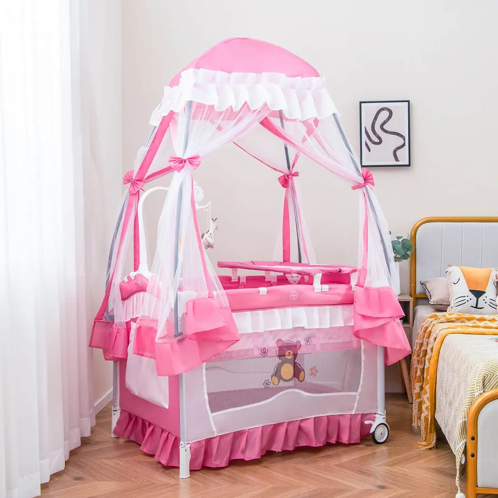 Costway Portable Baby Playpen Crib Cradle Changing Pad Mosquito Net - Pink - Iron