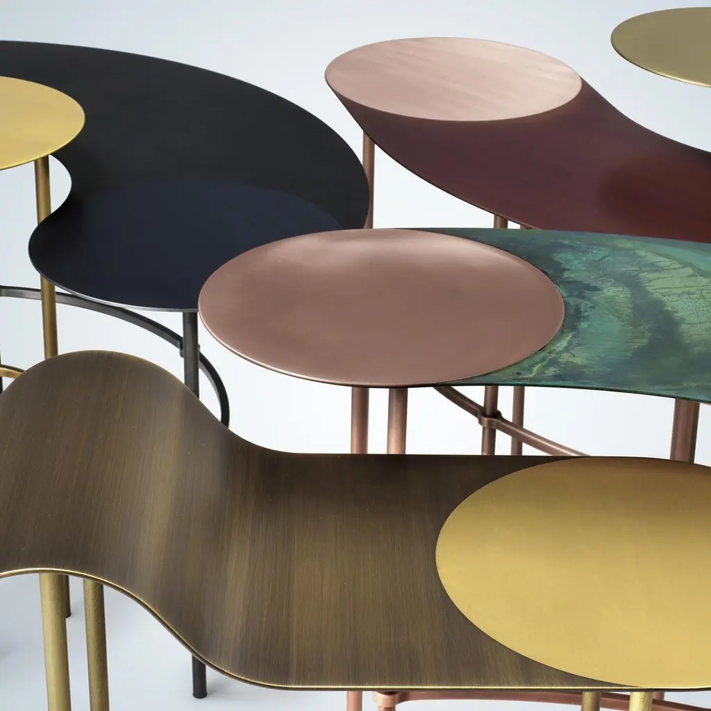Essential signs, like the undulating curves drawn by a calligraphy pen, or the clean, sinuous lines of a marker, are a metaphor for the malleability of metals when the hand that forges them knows all their secrets. The cold elegance of metal is thereby softened, giving it character, colour and feminine appeal. These symbols and characters chase each other almost as if dancing, manifesting as side tables and surfaces ready to invent a new domestic alphabet and write new stories of conviviality. Additional Information: Material: Brass top with iron legs Finish: Striped DeLabré Brass G7 with DeLabré M12Dimensions: W. 86 x D. 24 x H. 46 cm