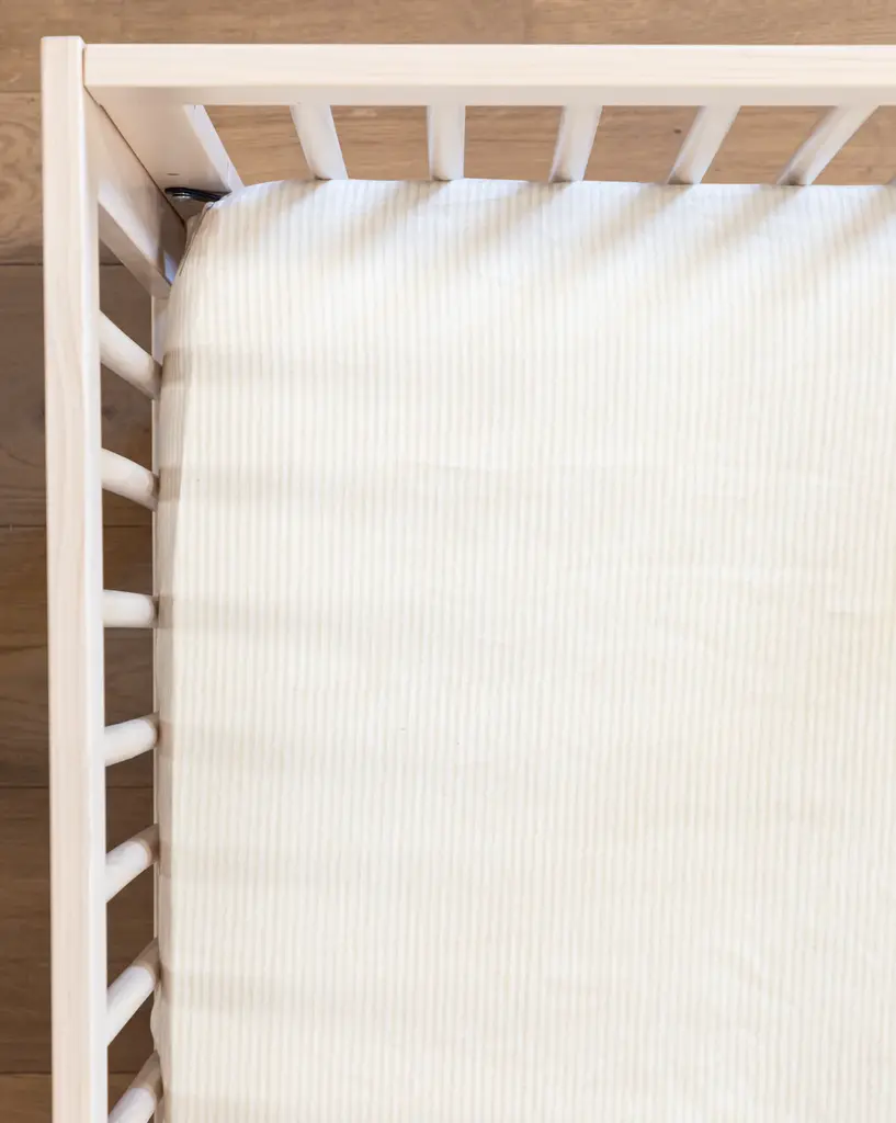 Subtle and soft, the Easton Crib Sheet adds a subdued pattern to crib bedding without overpowering other components of the room. This elegant sheet has a cream and oatmeal palette, using a classic design of thin-banded strips to give interest and gentle visual variety to baby's room.