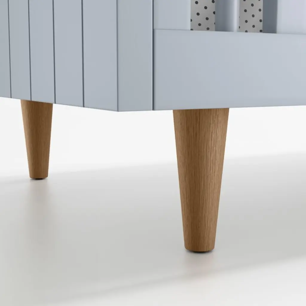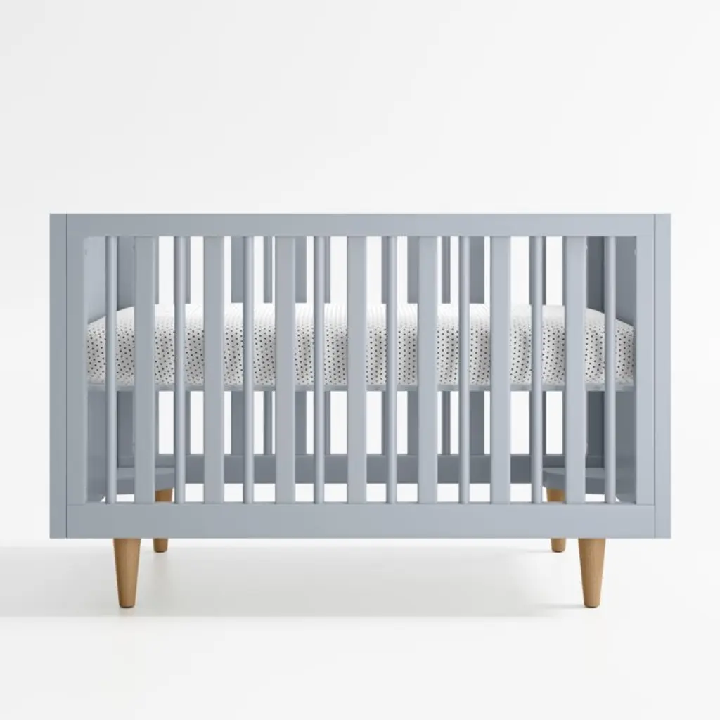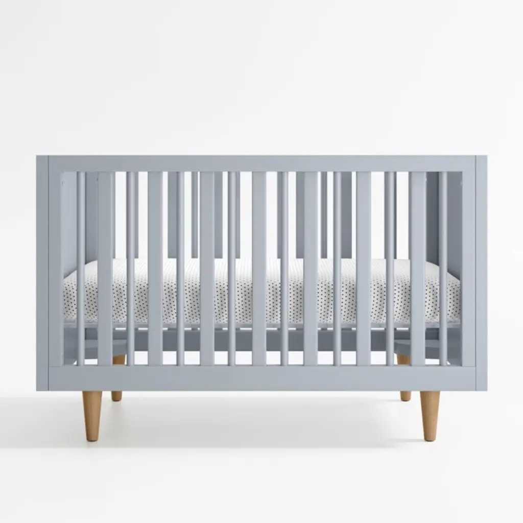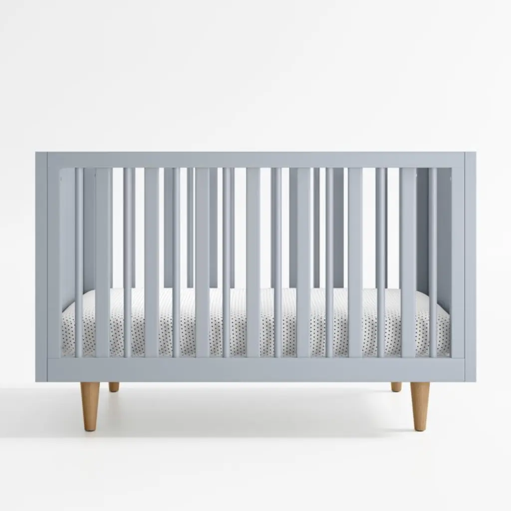 What You'll Love • Scandinavian-inspired design and modern paneling• Gently tapered solid oak legs and a soothing two-tone style• It's easy to go from crib to toddler bed (rail sold separately)• GREENGUARD Gold Certified for healthier air in your homeClean lines, elevated paneling and an on-trend (and gender-neutral) mist blue hue: Count us in! Largely inspired by Scandinavian farmhouse design, our Finn kid's furniture collection blends rustic charm and modern minimalism without skipping a beat. With gently tapered oak legs in a natural finish, the crib's calming two-tone palette translates perfectly in a nursery, while the solid wood rails and spindles lend stability and timeless style that can be passed down through the years.Learn how to choose a crib.