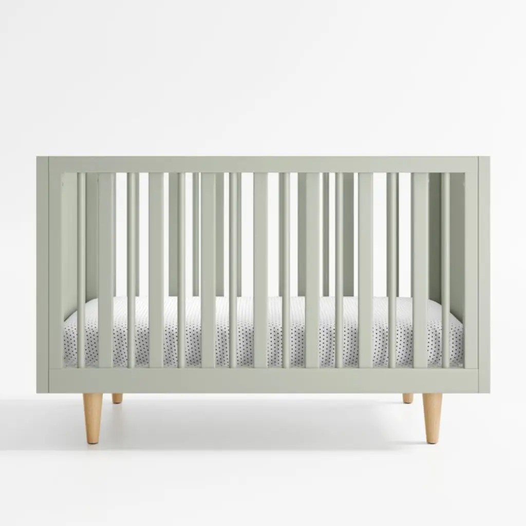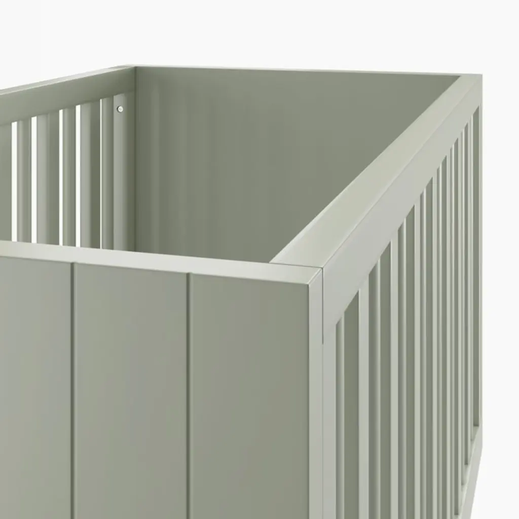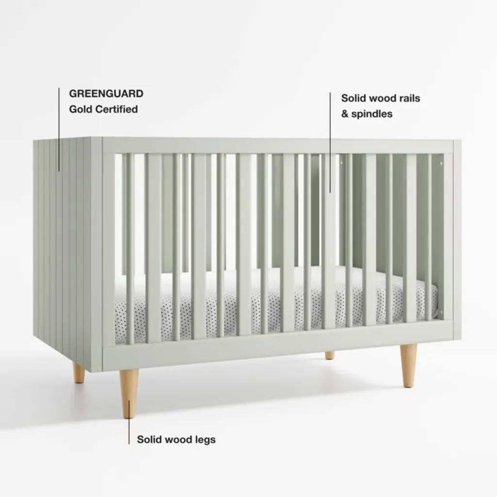 What You'll Love • Scandinavian-inspired design and modern paneling• Gently tapered solid oak legs and a soothing two-tone style• It's easy to go from crib to toddler bed (rail sold separately)• GREENGUARD Gold Certified for healthier air in your homeClean lines, elevated paneling and an on-trend (and gender-neutral) sage hue: Count us in! Largely inspired by Scandinavian farmhouse design, our Finn kid's furniture collection blends rustic charm and modern minimalism without skipping a beat. With gently tapered oak legs in a natural finish, the crib's soothing two-tone palette translates perfectly in a nursery, while the solid wood rails and spindles lend stability and timeless style that can be passed down through the years.GREENGUARD Gold Certification