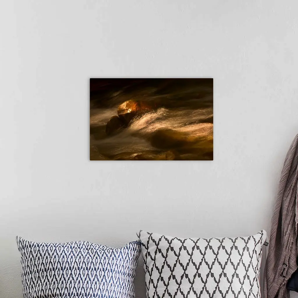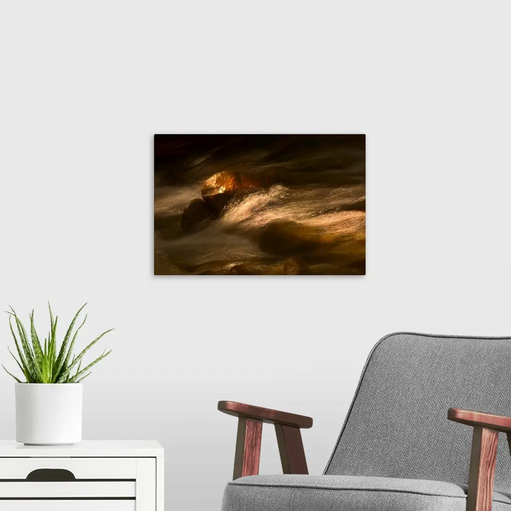 Photograph taken of rushing water gliding over rocks that are touched by spots of sunlight.