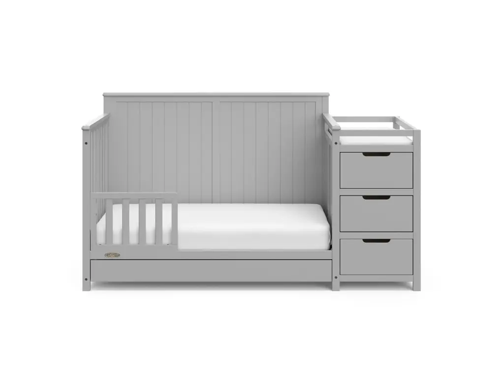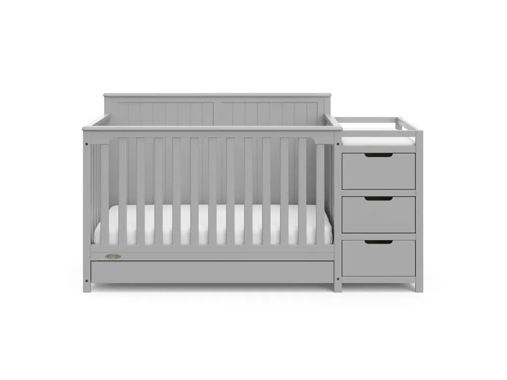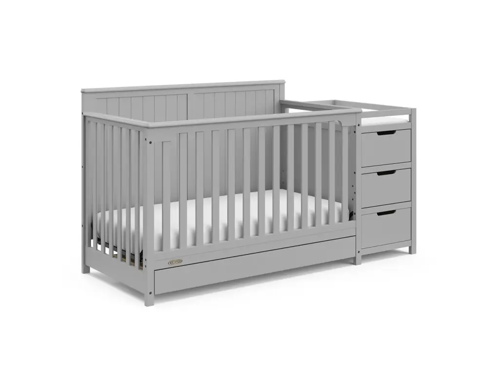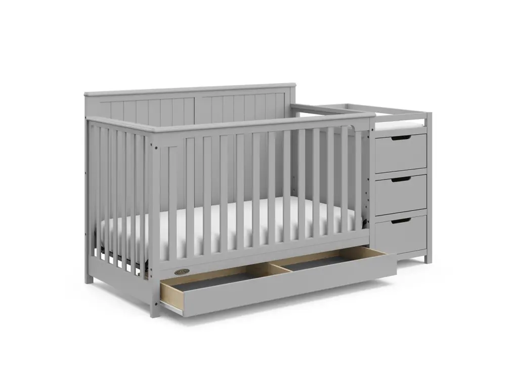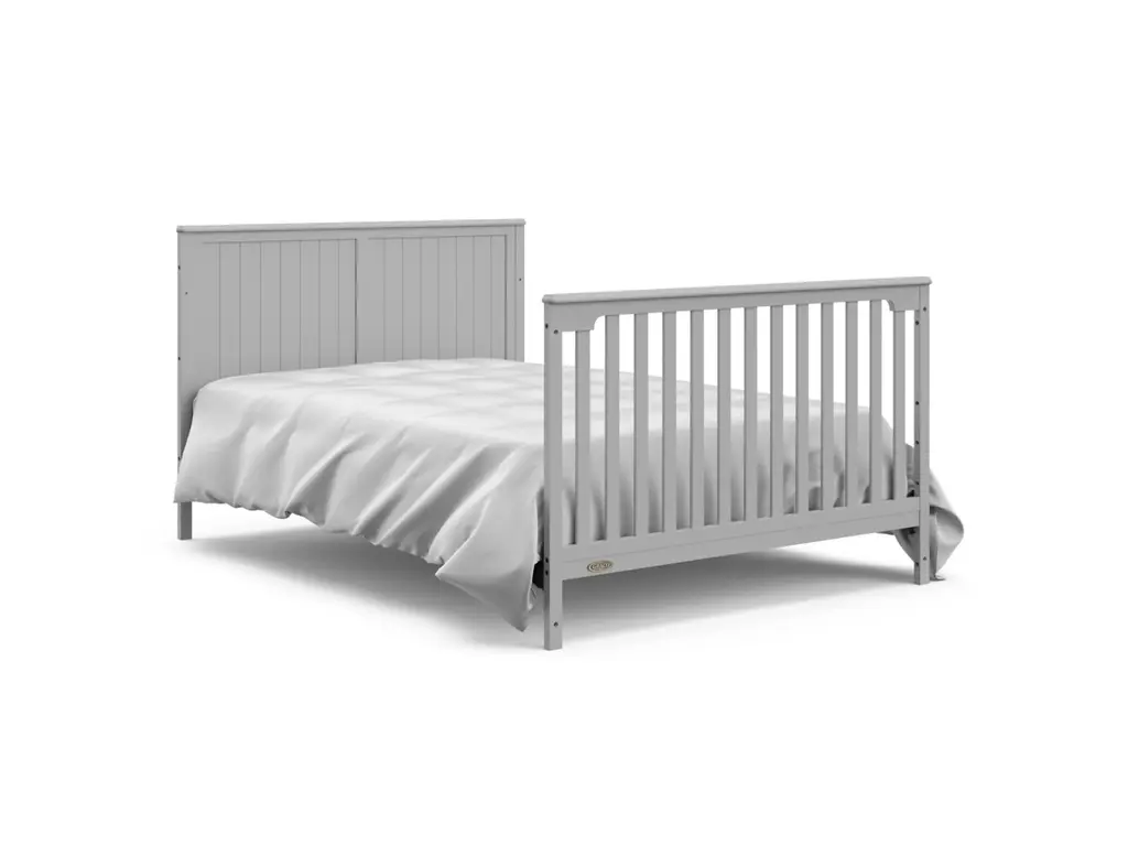 The Graco Hadley 5-in-1 Convertible Crib and Changer with Drawer was designed with safety, innovation, and convenience in mind. Available in White, Espresso, and Pebble Gray baby-safe, non-toxic finishes, the Hadley features a spacious drawer for easy storage of nursery essentials, and converts from crib to toddler bed, day bed, and full-size bed to grow with your baby throughout life's multiple stages. Like all Graco cribs, the Hadley is certified by the Juvenile Products Manufacturers Association (JPMA) and is meticulously tested to meet or exceed all applicable federal safety standards to ensure the safest sleeping environment for your child. The Graco Hadley 5-in-1 Convertible Crib and Changer with Drawer features an attached changing table, complete with a water-resistant baby changing pad with safety strap, as well as 3 drawers and 2 open shelves. This all-in-one crib is backed by a 1-year limited manufacturer's warranty. Easy assembly required. Mattress not included. Crib conversion kit sold separately.