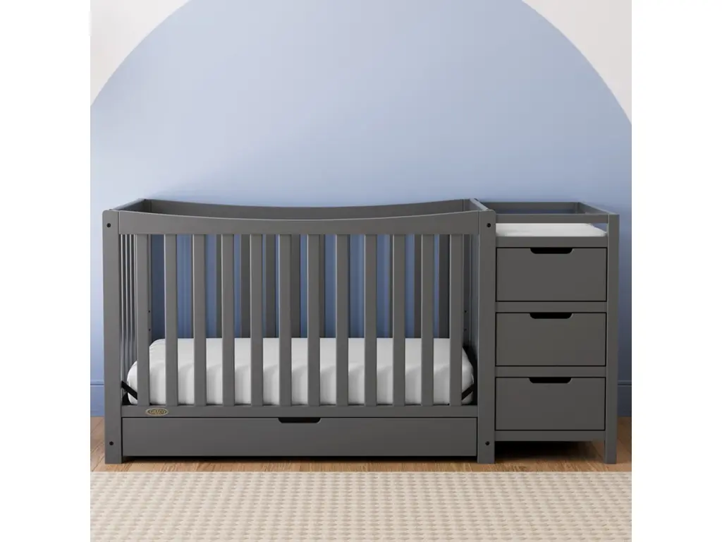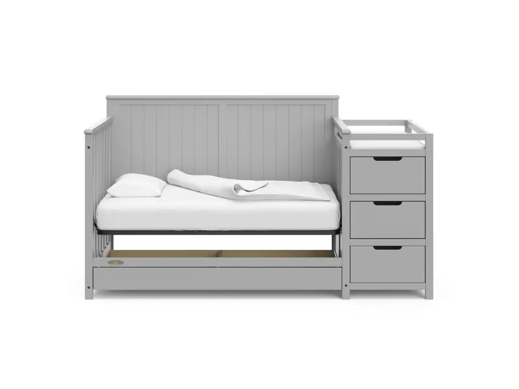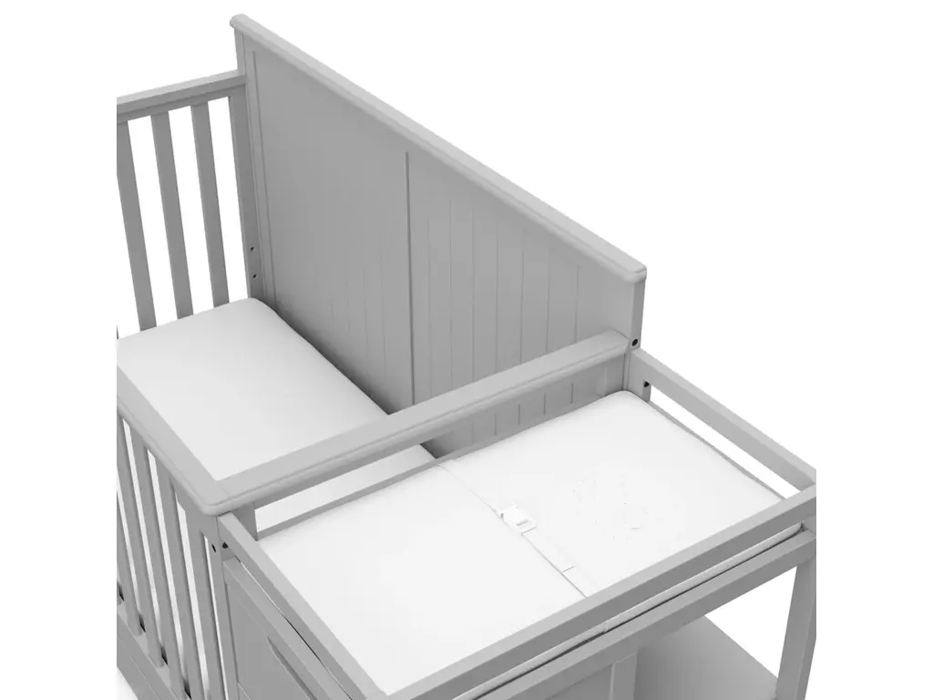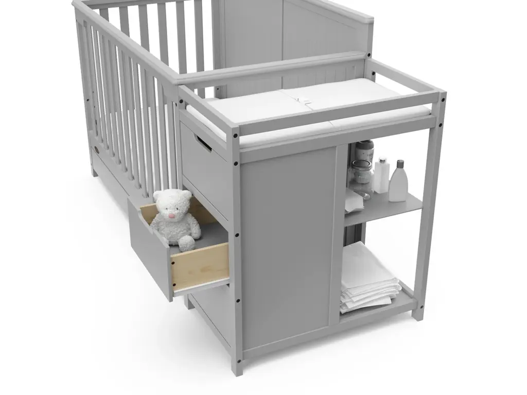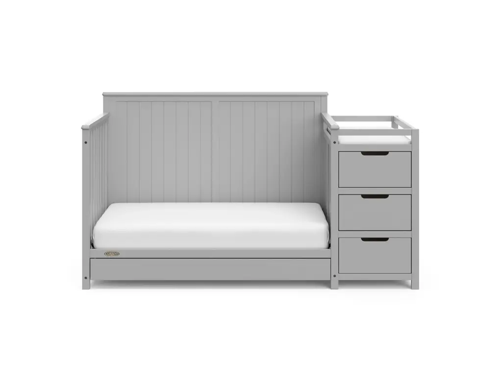 The Graco Hadley 5-in-1 Convertible Crib and Changer with Drawer was designed with safety, innovation, and convenience in mind. Available in White, Espresso, and Pebble Gray baby-safe, non-toxic finishes, the Hadley features a spacious drawer for easy storage of nursery essentials, and converts from crib to toddler bed, day bed, and full-size bed to grow with your baby throughout life's multiple stages. Like all Graco cribs, the Hadley is certified by the Juvenile Products Manufacturers Association (JPMA) and is meticulously tested to meet or exceed all applicable federal safety standards to ensure the safest sleeping environment for your child. The Graco Hadley 5-in-1 Convertible Crib and Changer with Drawer features an attached changing table, complete with a water-resistant baby changing pad with safety strap, as well as 3 drawers and 2 open shelves. This all-in-one crib is backed by a 1-year limited manufacturer's warranty. Easy assembly required. Mattress not included. Crib conversion kit sold separately.