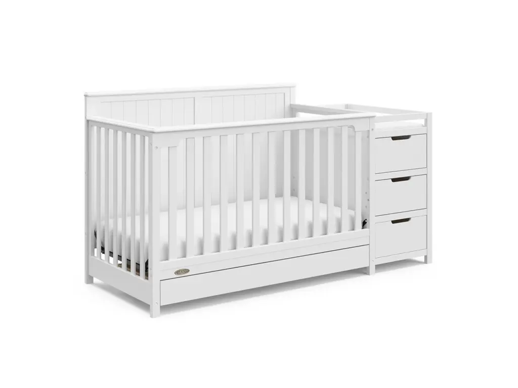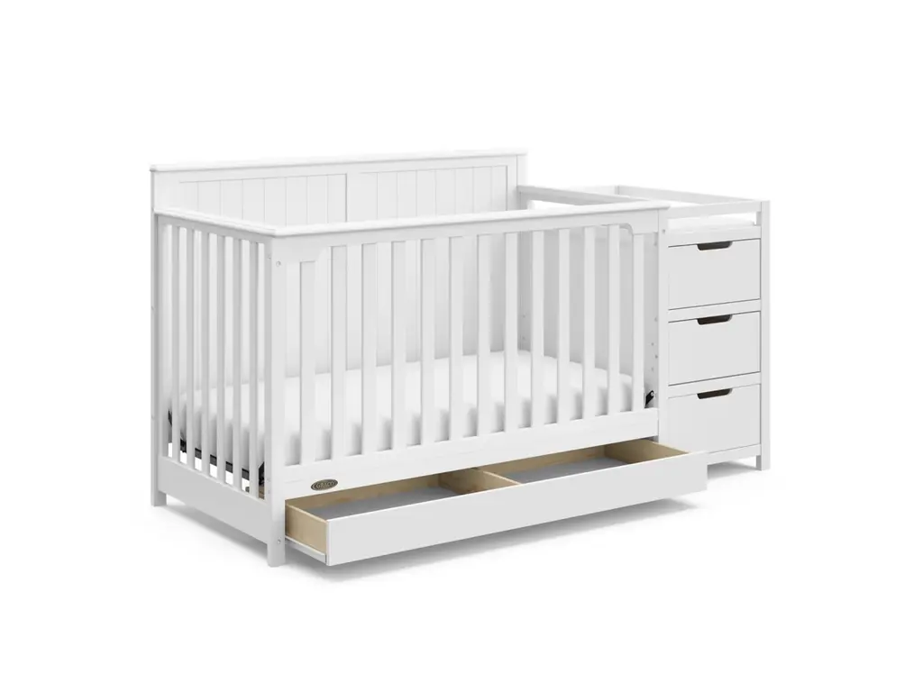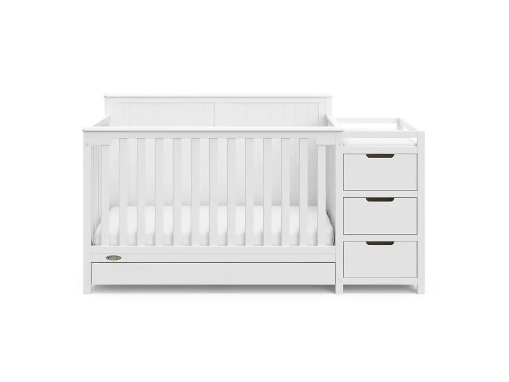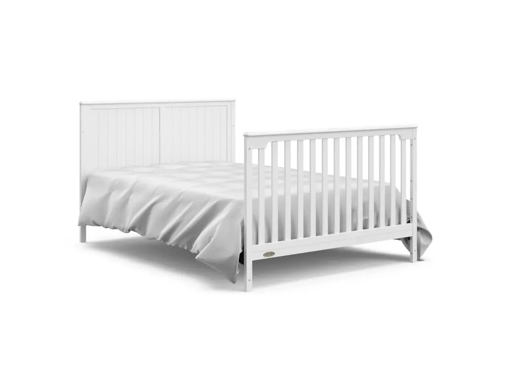 The Graco Hadley 5-in-1 Convertible Crib and Changer with Drawer was designed with safety, innovation, and convenience in mind. Available in White, Espresso, and Pebble Gray baby-safe, non-toxic finishes, the Hadley features a spacious drawer for easy storage of nursery essentials, and converts from crib to toddler bed, day bed, and full-size bed to grow with your baby throughout life's multiple stages. Like all Graco cribs, the Hadley is certified by the Juvenile Products Manufacturers Association (JPMA) and is meticulously tested to meet or exceed all applicable federal safety standards to ensure the safest sleeping environment for your child. The Graco Hadley 5-in-1 Convertible Crib and Changer with Drawer features an attached changing table, complete with a water-resistant baby changing pad with safety strap, as well as 3 drawers and 2 open shelves. This all-in-one crib is backed by a 1-year limited manufacturer's warranty. Easy assembly required. Mattress not included. Crib conversion kit sold separately.