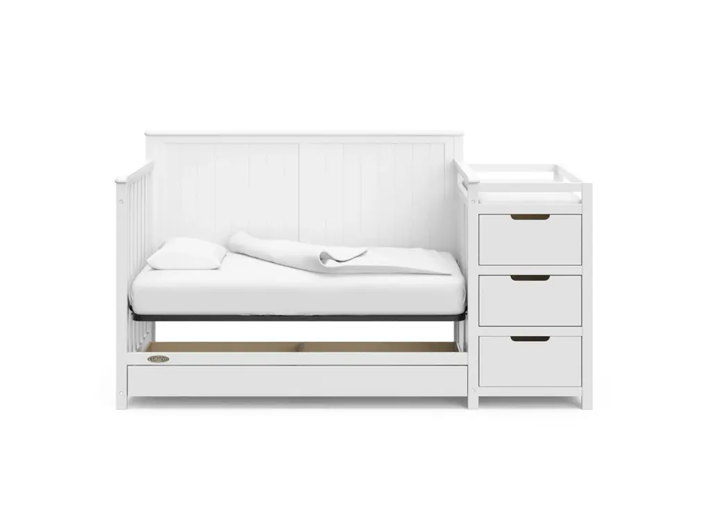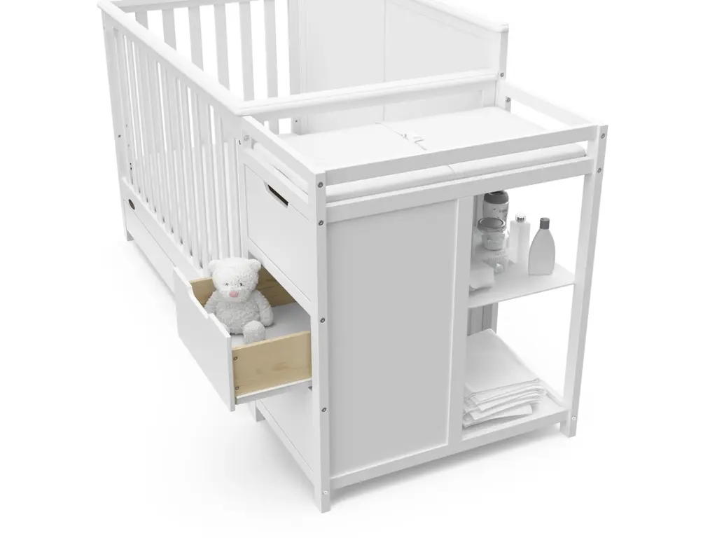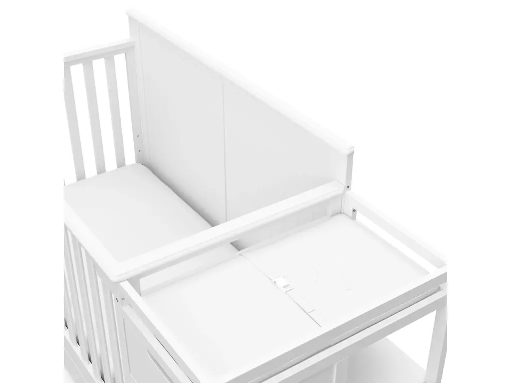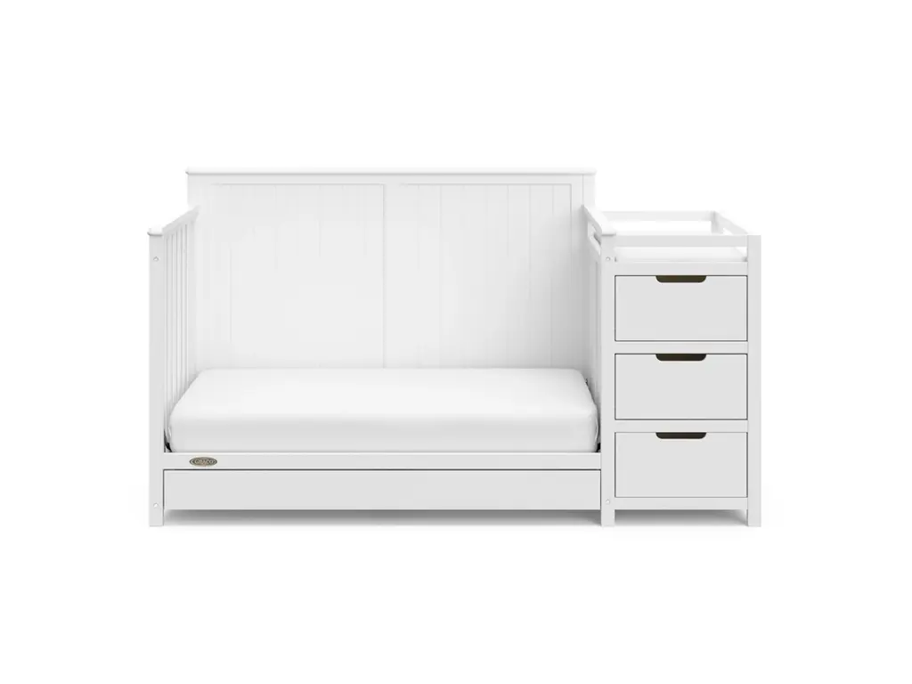 The Graco Hadley 5-in-1 Convertible Crib and Changer with Drawer was designed with safety, innovation, and convenience in mind. Available in White, Espresso, and Pebble Gray baby-safe, non-toxic finishes, the Hadley features a spacious drawer for easy storage of nursery essentials, and converts from crib to toddler bed, day bed, and full-size bed to grow with your baby throughout life's multiple stages. Like all Graco cribs, the Hadley is certified by the Juvenile Products Manufacturers Association (JPMA) and is meticulously tested to meet or exceed all applicable federal safety standards to ensure the safest sleeping environment for your child. The Graco Hadley 5-in-1 Convertible Crib and Changer with Drawer features an attached changing table, complete with a water-resistant baby changing pad with safety strap, as well as 3 drawers and 2 open shelves. This all-in-one crib is backed by a 1-year limited manufacturer's warranty. Easy assembly required. Mattress not included. Crib conversion kit sold separately.