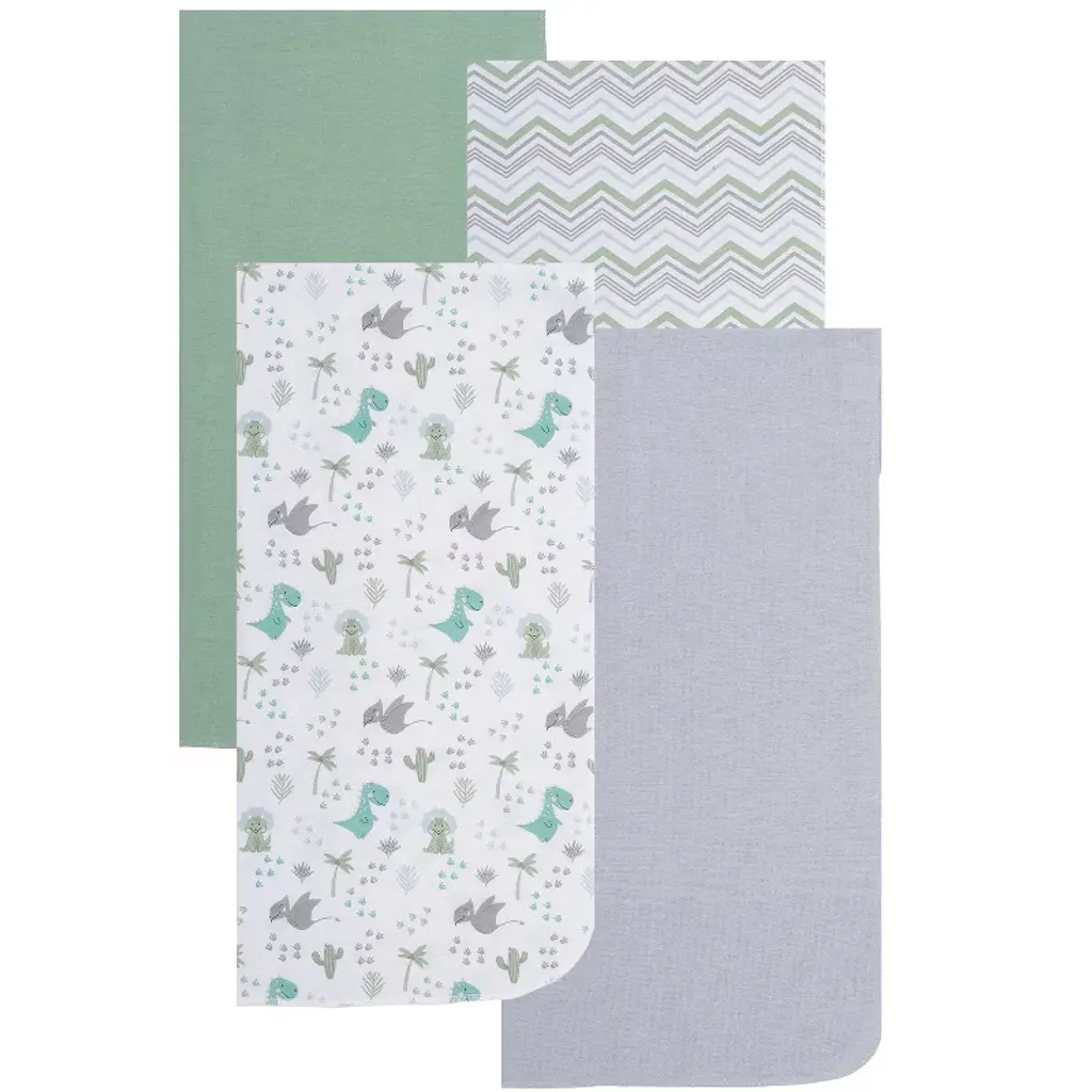 Your little one will drift off to dreamland with their favorite prehistoric creatures playing hide and seek among ancient trees and Jurassic rocks. This 3 piece dinosaur themed crib bedding set includes one quilt, one 100% cotton fitted crib sheet, and one crib skirt. The quilt is on a creamy white ground that is made of pure cotton twill. Several of the dinos are appliqued in gray and blue velour and soft textured boucle. The watercolor style printed fitted crib sheet features multi colored dinos and has elastic all the way around ensuring a safe and secure fit on a standard size crib mattress measuring approximately 52 inches by 28 inches. The crib skirt adds the finishing touch to your child’s room and features a long appliqued dino tail in blue boucle fabric.