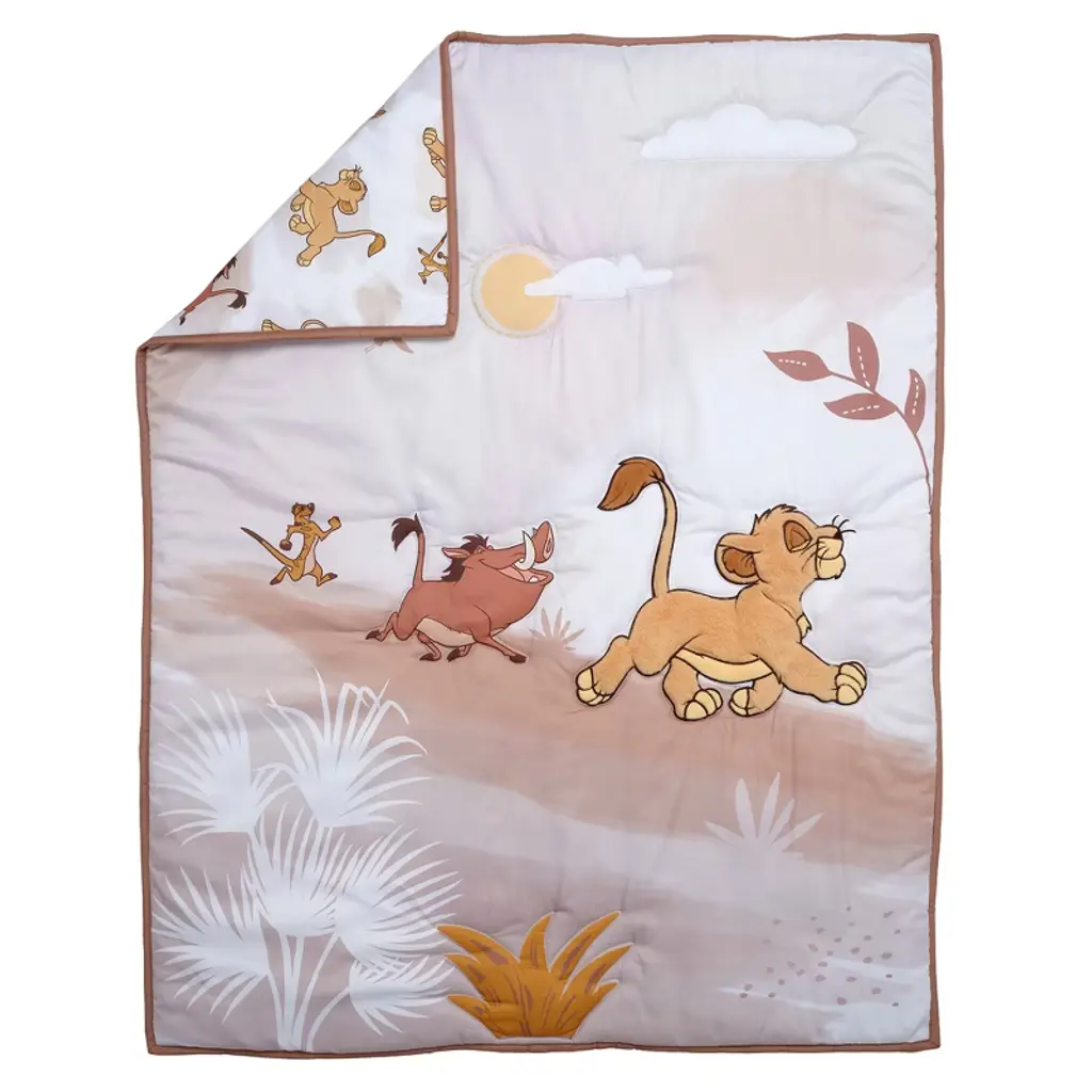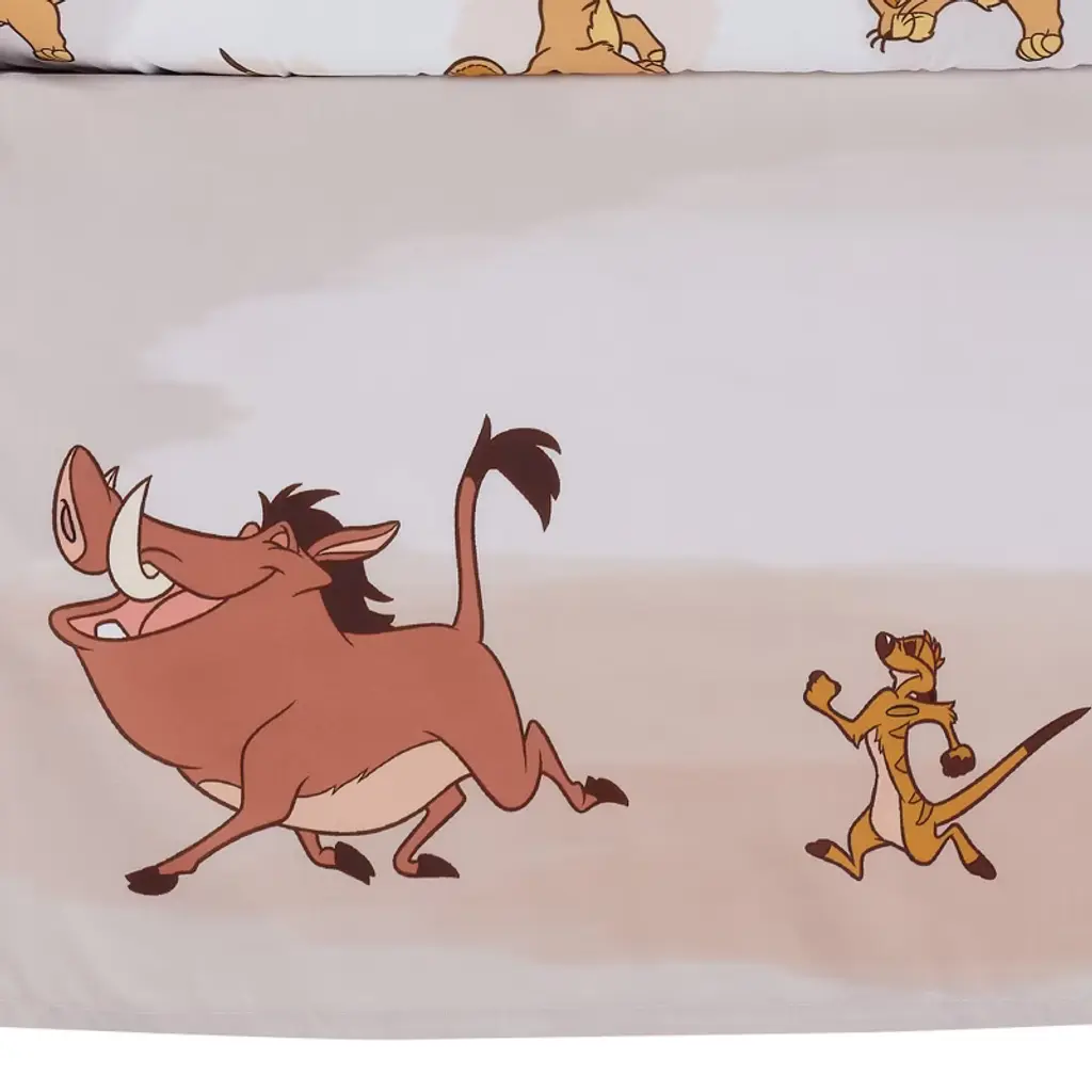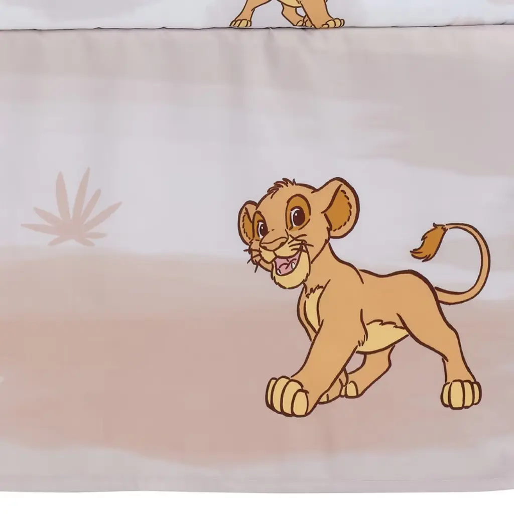 Embark on a grand adventure with our Disney Lion King Safari nursery bedding collection. This watercolor-style crib bedding set showcases Simba, Pumbaa, and Timon marching confidently under a golden sun and vanilla sky on a soft microfiber material that is gentle on baby’s delicate skin. The three-piece crib bedding set includes one quilt, one fitted crib sheet, and one crib skirt. The quilt features Simba, appliqued in a high-pile golden apricot faux fur. His tummy, muzzle and toes are appliqued in yellow velour and his inner ears, eyelids, and tip of his tail are appliqued in a rusty brown faux fur. The back of the quilt and the fitted crib sheet are on a white ground with Simba, Pumbaa, and Timon in some of their favorite poses. The crib sheet has elastic all the way around ensuring a safe and secure fit on a standard size crib mattress measuring approximately 52 inches by 28 inches. The crib skirt adds the finishing touch to your child’s crib. It features Simba on the long sides with a pretty gradient of natural colors, and Pumbaa and Timon on the two short sides.