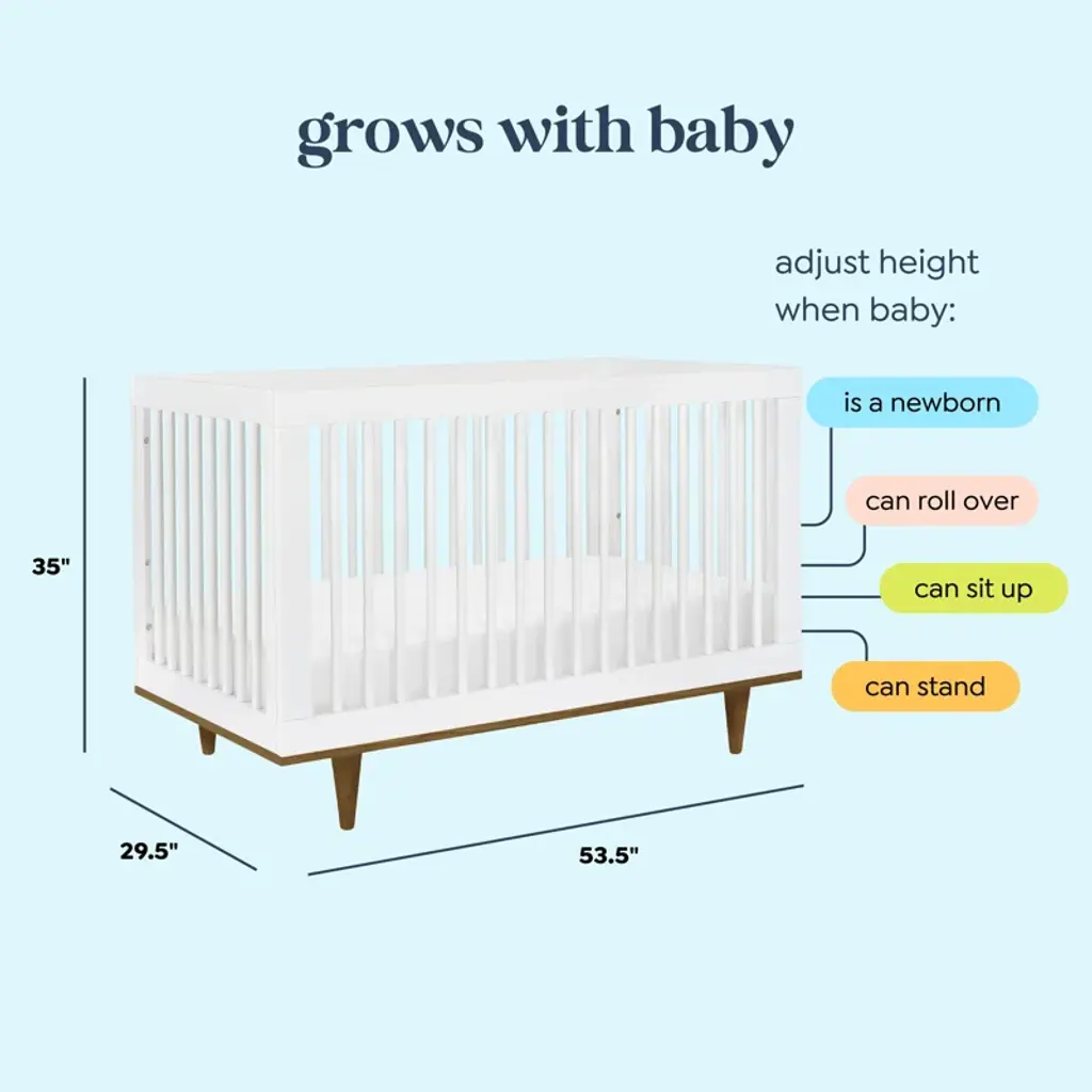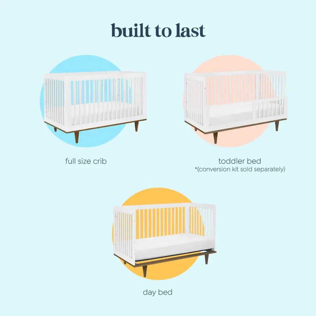 The Marley 3-in-1 convertible crib, with its clean lines, mid-century style, and playful legs, is the perfect contemporary centerpiece for any modern nursery. Straight slats are designed to be sleek and simple, while two-tone color choices add flair and variety. Like all baby mod cribs, the Marley crib is built to last with convertibility from crib to toddler bed to day bed, and stationary sides to keep baby safe.