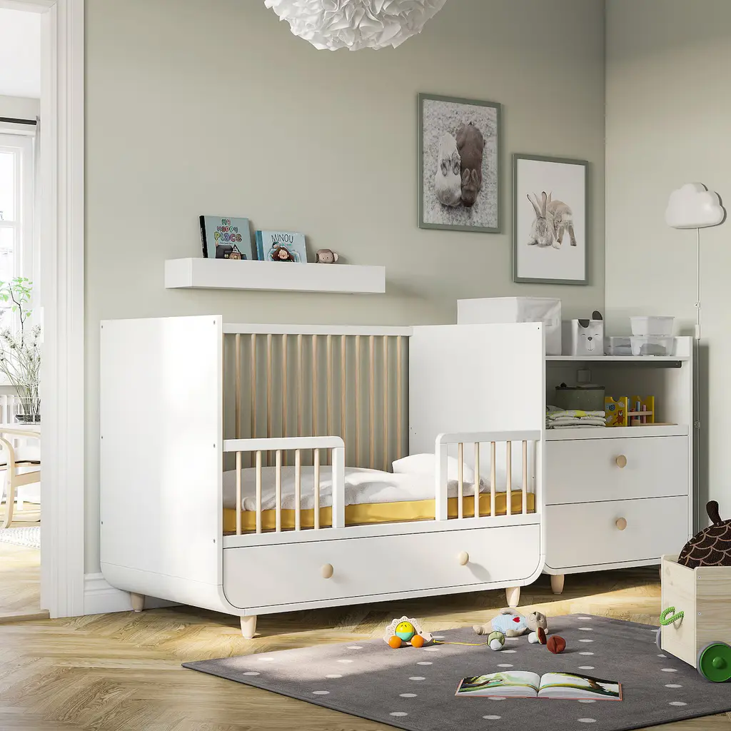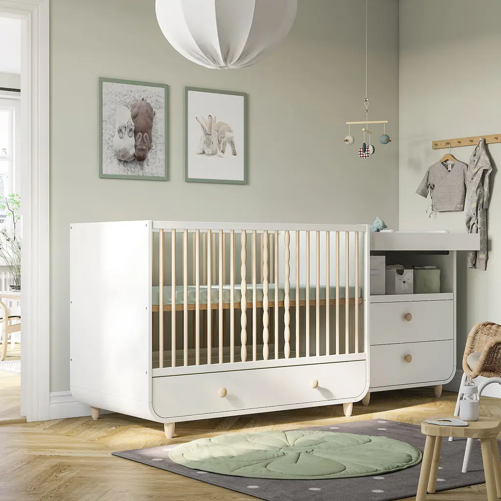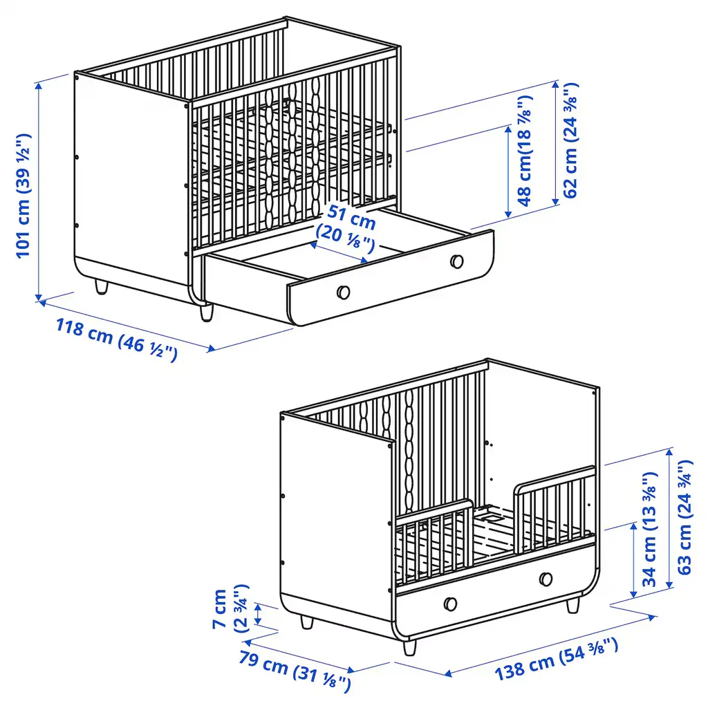 MYLLRA Crib with drawer - white 27 1/2x52 ". If you want to create a complete children's room in the same style, you can combine the crib with the SMÅSTAD storage series – they match each other perfectly. One crib side can be removed when the child is big enough to climb into/out of the crib.