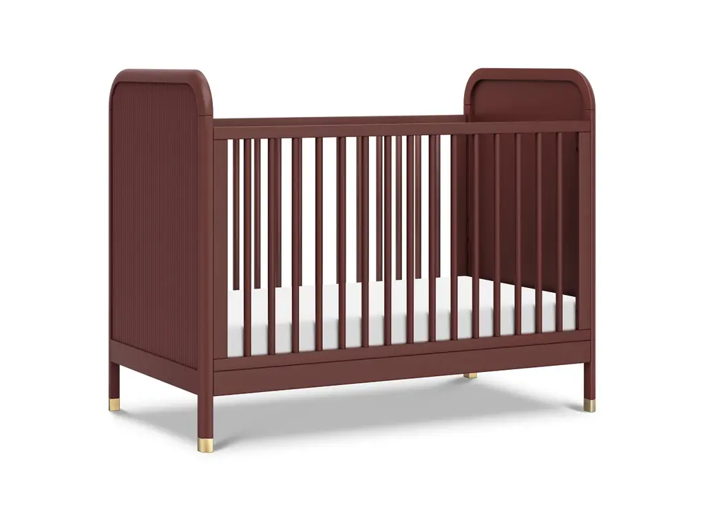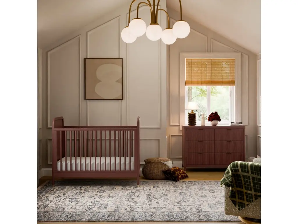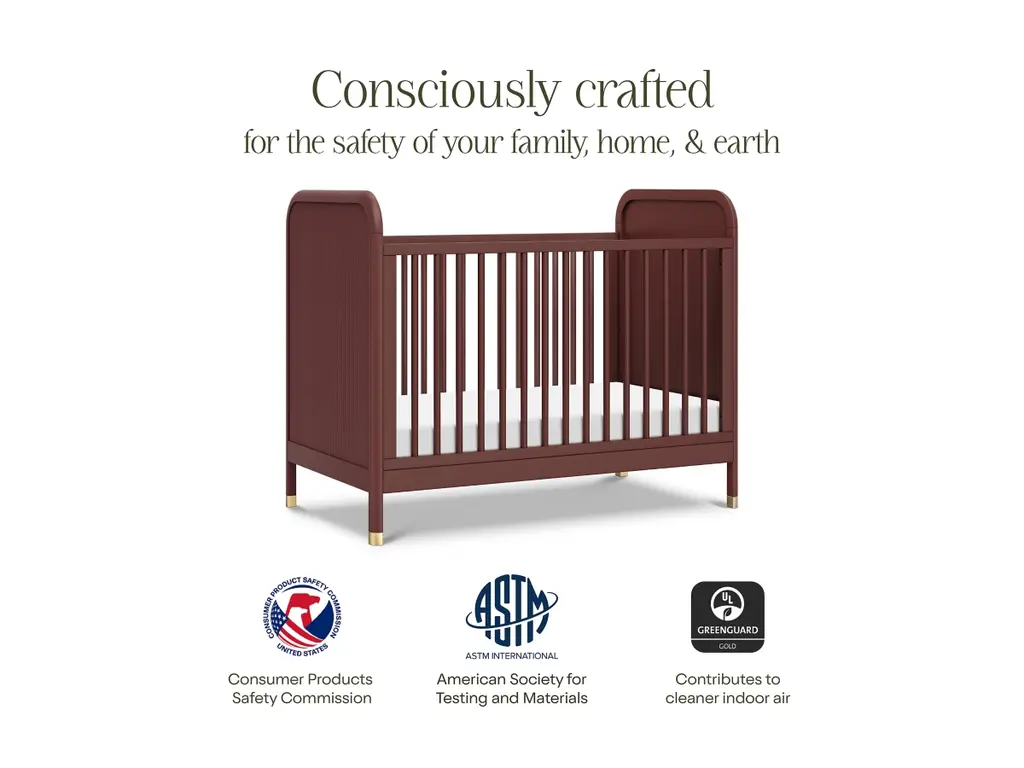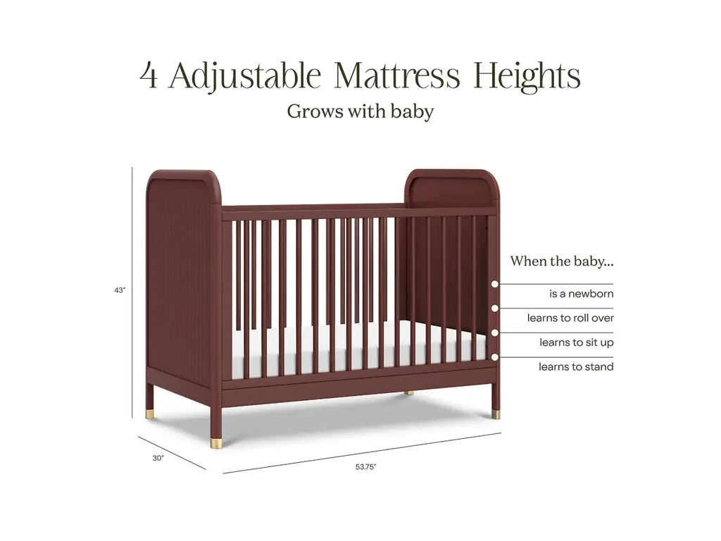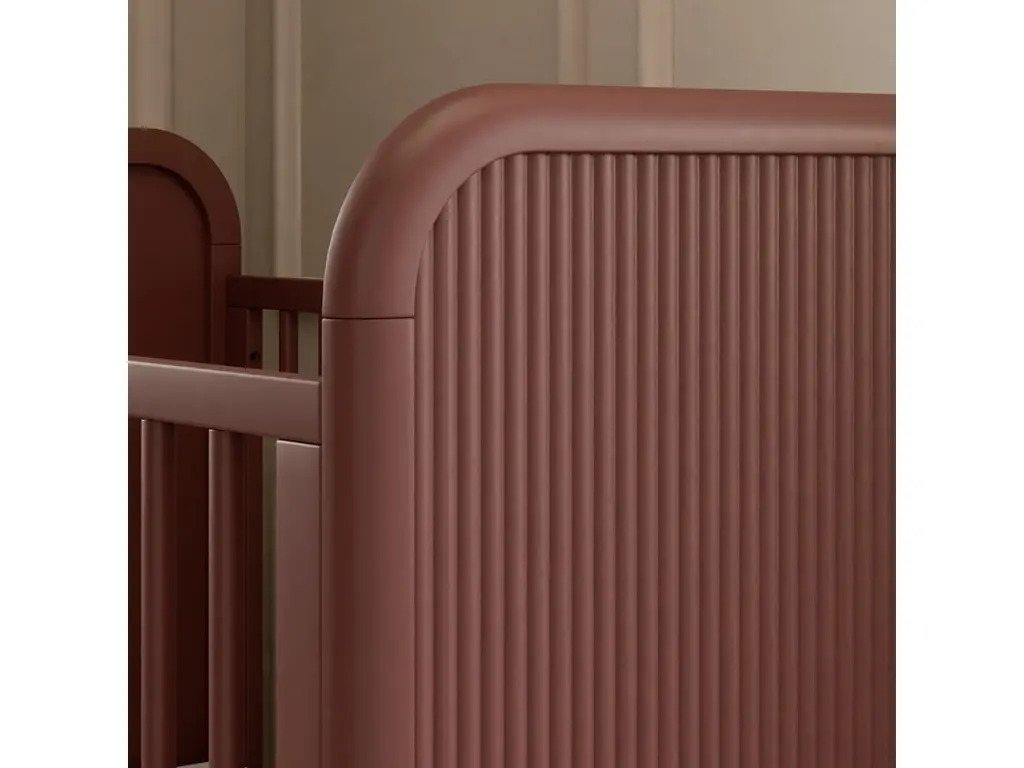 The Brimsley Tambour Crib is a masterpiece of craftsmanship that blends timeless design with modern functionality. Its distinctive tambour design and gently curved slats, paired with elegant goldtone feet, make this crib more than just a place for your little one to rest; it's a statement piece that elevates the aesthetic of your nursery.