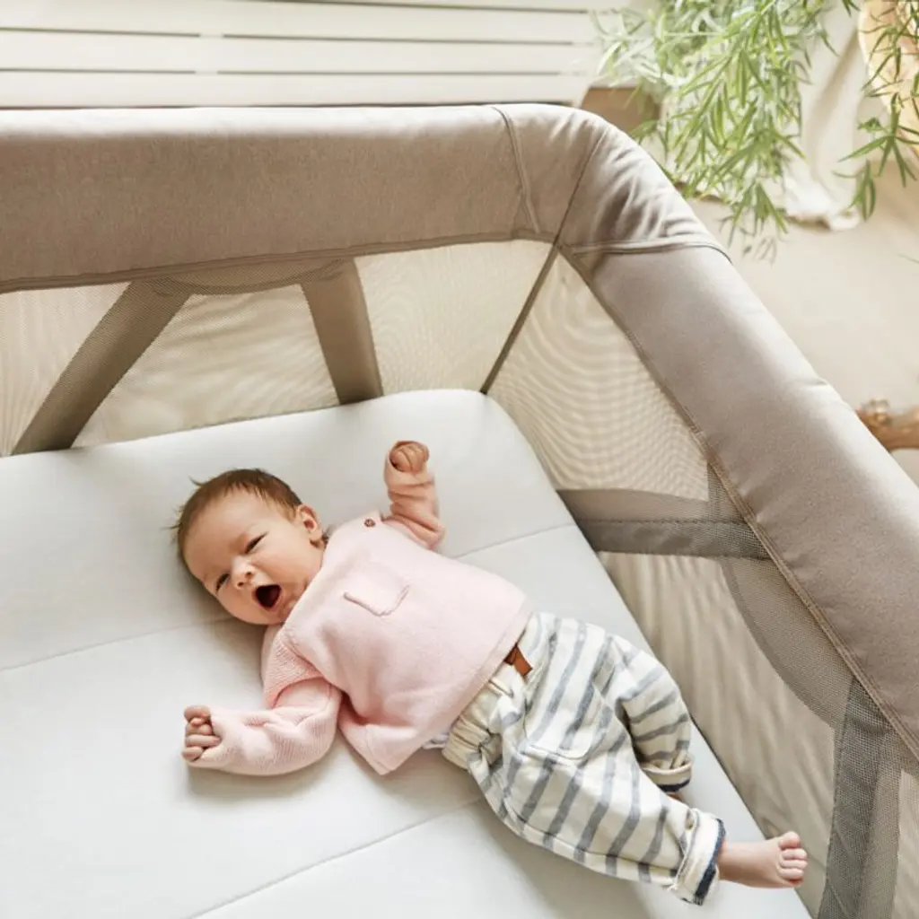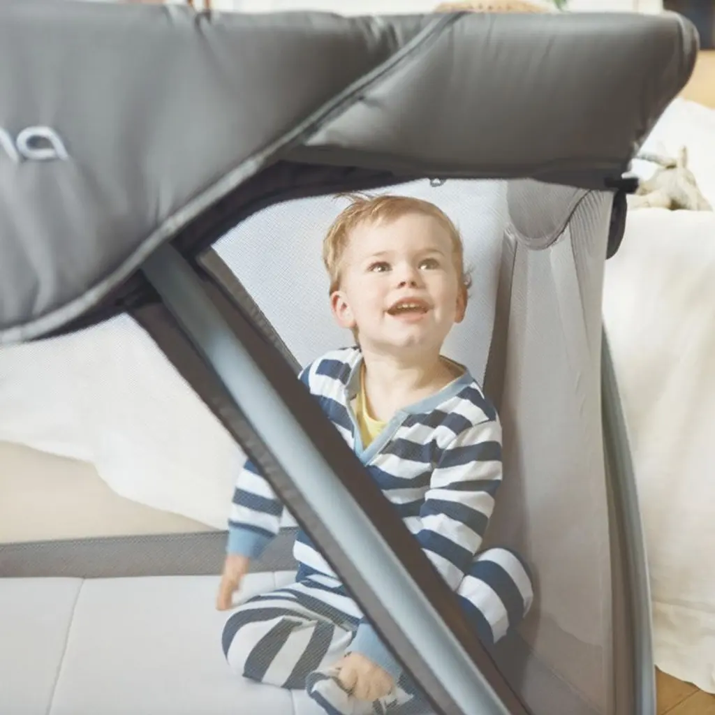 Useful at home and indispensable on vacation, the Nuna ® SENA aire ® is like having a portable nursery. Its sturdy aluminum frame unfolds in seconds, opening up to create a generously sized space with 360° ventilation. An included zip-off bassinet positions little ones within easy reach, while the mesh mattress keeps them nice and cool. Caregivers of toddlers will appreciate the tall mesh sides of the light brown playard and travel crib, not to mention the sturdiness afforded by the base's skid-proof feet. Ready to move along? Just use one hand to close things up (yes, even with the bassinet in place). Equipped with a durable travel bag and a cotton sheet, this setup is travel-ready out of the boxjust add baby.