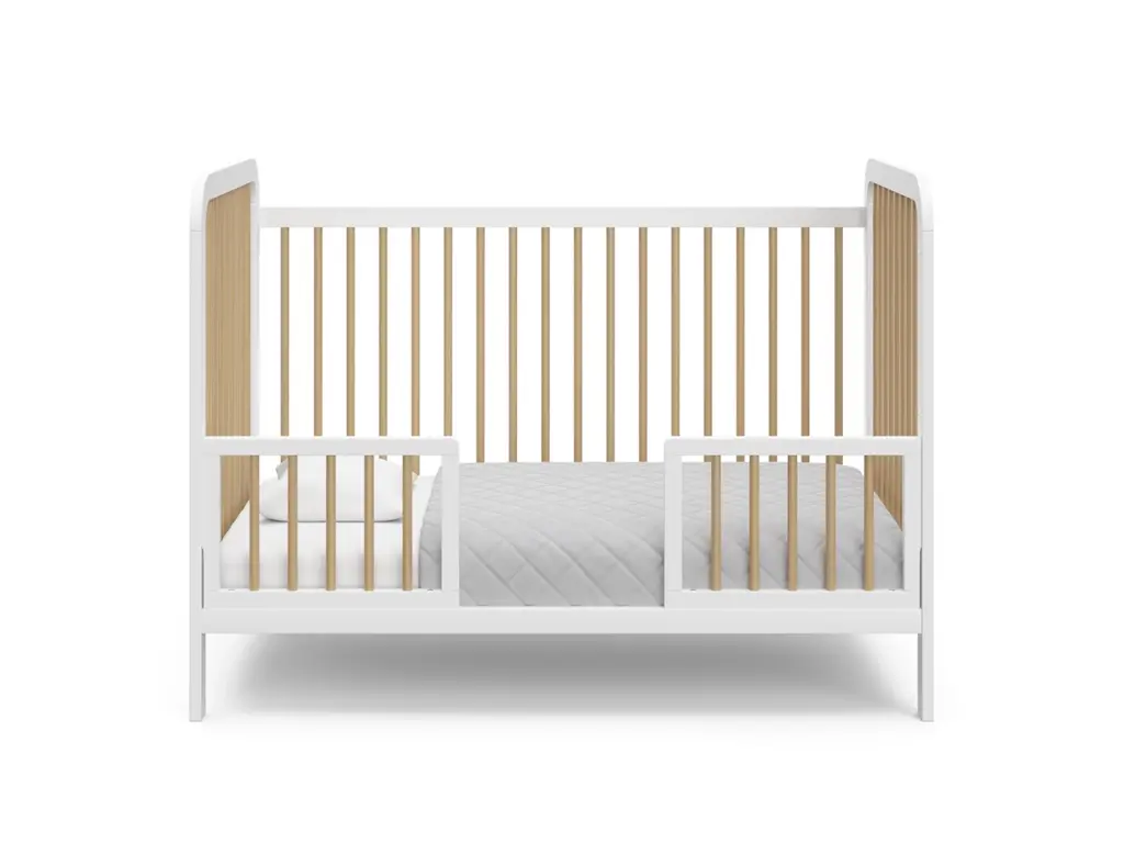 Effortlessly cool and totally timeless, our clean-lined Redondo collection brings West Coast vibes to the nursery. The crib's two-toned color scheme of natural wood and neutral ivory upholstery complements nurseries with modern or minimalist-minded aesthetics. Its curved lines make it a welcoming sleep spot, and its mixed materials add design sophistication. Plus, it can seamlessly grow with your little one, thanks to the easy-to-assemble Redondo Toddler Bed Rail. Coordinates with any of our crib mattresses.Learn how to choose a crib.