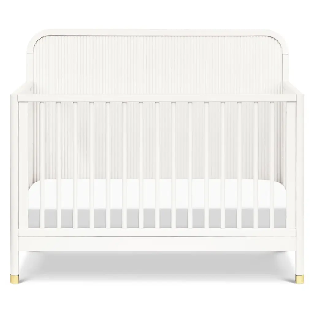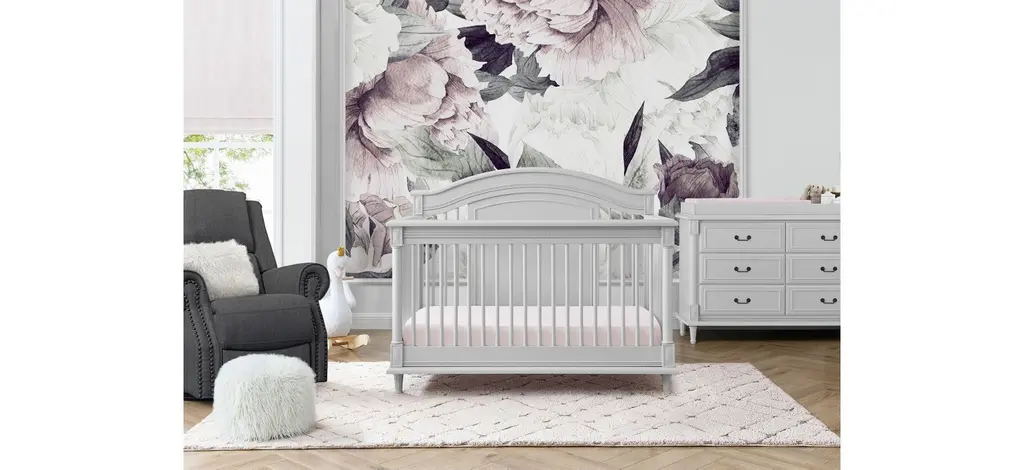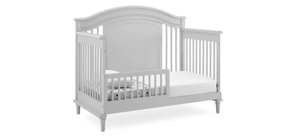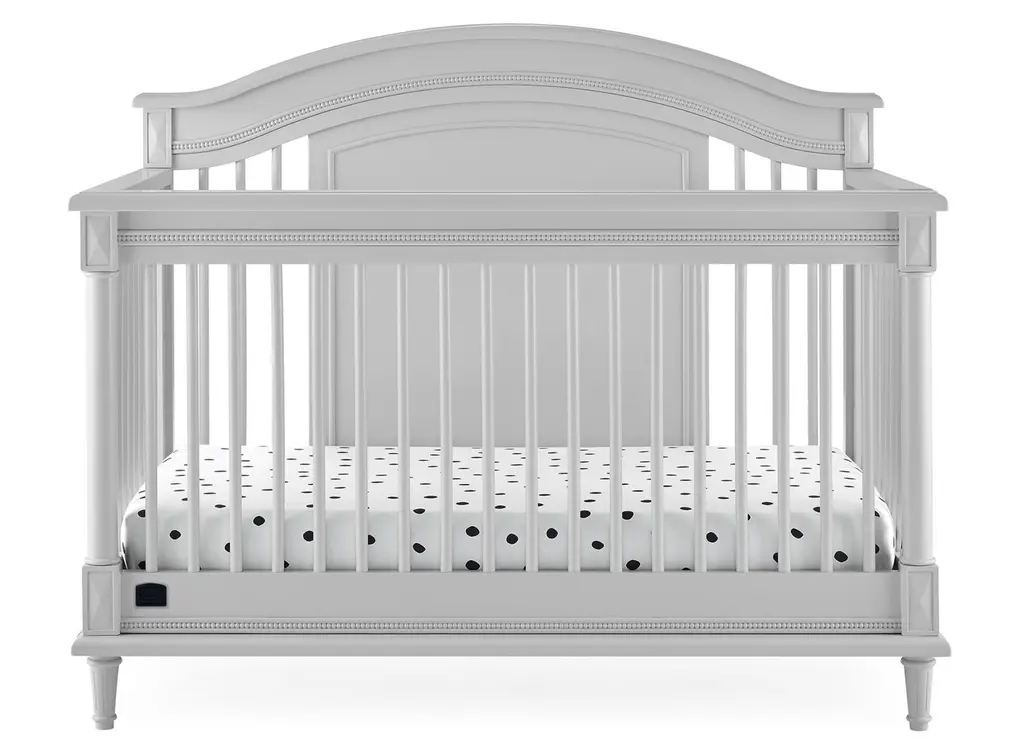Elegant spindles, gorgeous molding and fluted legs with intricate carvings give the Simmons Kids Juliette Convertible Crib with Toddler Rail by Delta Children a sophisticated look. This crib's grow-with-me design features three adjustable height levels that allow the crib to be lowered as your child grows, plus it converts from a crib, to a toddler bed, sofa, and daybed.