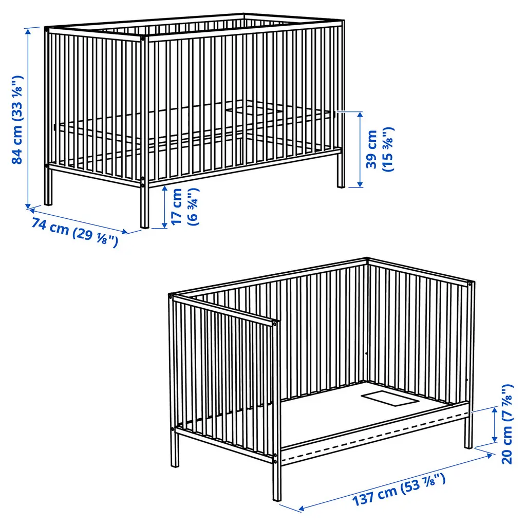 SNIGLAR Crib - beech 27 1/2x52 ". The bed base can be placed at two different heights. One bed side can be removed when the child is able to safely climb into and out of the bed. The crib base is well ventilated for good air circulation which gives your child a pleasant sleeping climate.